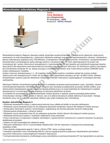 Informacje o produkcie Utworzono 03-03-2017 Mineralizator mikrofalowy Magnum II Cena : Ceny dostępne po zalogowaniu at or iu m Nr katalogowy : MMII Producent : ERTEC-Poland eSk le p La bo r Mineralizatory/reaktory Magnum stanowią moduły zamknięte wysokociśnieniowe, z bezpiecznymi głowicami reakcyjnymi wykonanymi ze stali kwasoodpornej, z płaszczem chłodzenia wodnego oraz pełnym opomiarowaniem ciśnienia i temperatury, płynną niepulsacyjną regulacją mocy mikrofalowej, ze sprzętowym sterownikiem procedur mineralizacji i oprogramowaniem komputerowym umożliwiającym pełną obsługę systemu z komputera typu PC. Ilość zapamiętywanych procedur tak mineralizacji jak i syntez chemicznych prowadzonych z wykorzystaniem PC jest dowolna zaś użytkownik dysponuje otwartą bazą danych dla wpisywania nowo-opracowanych procedur oraz potrzebnych informacji. Do sterowania systemu wymagany jest standardowy komputer PC np. laptop pracujący w środowisku Windows? oraz liczba wolnych portów COM/USB równa liczbie instalowanych modułów. System może być skomponowany z 1-¸20 modułów. Każdy moduł systemu umożliwia rozkład lub syntezy próbek organicznych lub nieorganicznych w ilości do 2g suchej masy (opcjonalnie procedury do 5g) i do 80ml cieczy. Możliwe kompletowanie systemu poprzez dodawanie następnych modułów reakcyjnych zaspokajających wzrastające potrzeby użytkownika. Oferowany Państwu mineralizator/reaktor Magnum II umożliwia racjonalne wykorzystywanie czasu i pieniędzy. Atutem mineralizatorów/reaktorów mikrofalowych serii Magnum jest niezwykłe przyśpieszenie procesów obróbki próbek, przy równocześnie niespotykanie wysokim poziomie bezpieczeństwa pracy (w przeciwieństwie do ciśnieniowych urządzeń laboratoryjnych w konstrukcji których, znajdują się elementy plastikowe narażone na działanie sił rozrywających). Jednostanowiskowe moduły łączone w większe systemy pozwalają jednocześnie mineralizować różnego rodzaju próbki w różnych, ale za to dobrze dla danych próbek dobranych warunkach. Takiego standardu pracy nie są w stanie realizować reaktory typu wielo-modołowy piec mikrofalowy. Reaktor mikrofalowy Magnum II ? Możliwość prowadzenia reakcji z jednoczesną kontrolą mocy odbitej od próbki w naczyniu teflonowym. ? Możliwość użycia komputera klasy PC do zadawania poziomów temperatur różnych dla kolejnych kroków procesu. ? Powtarzalne zamknięcie systemu ciśnieniowego z sygnalizacją siły docisku pokrywki naczynia reakcyjnego. ? Monitorowanie temperatury i ciśnienia reakcji. ? Możliwość użycia komputera klasy PC do zadawania poziomów ciśnień różnych dla kolejnych kroków procesu. ? Modułowa konstrukcja systemu, możliwość zwiększenia liczby stanowisk, ? Praca ciśnieniowa w oryginalnym układzie zamkniętym z ograniczeniem ciśnienia lub w systemie otwartym za pomocą dodatkowej przystawki, ? Głowica ze stali kwasoodpornej chłodzona wodą, ? Naczynia ciśnieniowe 110 ml o wytrzymałości bezpiecznika 120 bar wykonane z izostatycznie prasowanego Hostaflenu-1500, ? Dwa obwody wyłapywania oparów ? górny z filtrem PTFE i dolny z pompą wodną, ? kompletny generator mocy mikrofalowej 600 W z płynną regulacją poziomu połączony indywidualnie pod każdym naczyniem reakcyjnym w poszczególnych modułach reakcyjnych, ? mikroprocesorowe sterowanie umożliwiające pracę samodzielną za pomocą komputera PC lub (opcjonalnie) za pomocą Wygenerowano w programie www.oscGold.com konsolki sterującej. ? wizualizacja przebiegów ciśnienia i temperatury w naczyniu reakcyjnym, ? oprogramowanie - kreator procedur dla rozkładów próbek analitycznych i wygodna otwarta baza danych ? wyposażenie w klucz-otwieracz naczyń teflonowych, ? instalacja i szkolenie w cenie przyrządu ? wielkość próbek do 1.5g suchej masy max 70 ml cieczy ? system dwu modułowy, zamknięty z niezależnym dla każdego modułu sterowaniem komputerowym ? zasilanie 230 V/50Hz 600 VA ? częstotliwość 2.45 GHz eSk le p La bo r at or iu m Wyposażenie standartowe: - Reaktor mikrofalowy Magnum II (1 moduł) - Naczynie o pojemności 110ml z PTFE - Filtr ( 1 szt.) - Komplet kluczy wraz otwieraczem naczyń teflonowych - Osłona wyciągu podciśnieniowego - Komplet węży igielitowych - Pompka wodna ( 1 szt.) - Oprogramowanie komputerowe zawierające otwartą bazę i zestaw startowych procedur mineralizacji w ramach podprogramu Valis i programu TotalLabAll - Instrukcja w języku polskim (książka oraz wersja elektroniczna).