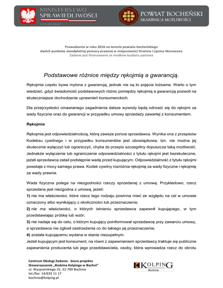 Prowadzenie w roku 2016 na terenie powiatu bocheńskiego dwóch punktów nieodpłatnej pomocy prawnej w miejscowości Drwinia i Lipnica Murowana Zadanie jest finansowane ze środków budżetu państwa Podstawowe różnice między rękojmią a gwarancją. Rękojmia często bywa mylona z gwarancją, jednak nie są to pojęcia tożsame. Warto o tym wiedzieć, gdyż świadomość podstawowych różnic pomiędzy rękojmią a gwarancją pozwoli na skuteczniejsze dochodzenie uprawnień konsumenckich. Dla przejrzystości omawianego zagadnienia dalsze wywody będą odnosić się do rękojmi za wady fizyczne oraz do gwarancji w przypadku umowy sprzedaży zawartej z konsumentem. Rękojmia Rękojmia jest odpowiedzialnością, którą zawsze ponosi sprzedawca. Wynika ona z przepisów Kodeksu cywilnego i w przypadku konsumentów jest obowiązkowa, tzn. nie można jej skutecznie wyłączyć lub ograniczyć, chyba że przepis szczególny dopuszcza taką możliwość. Jednakże wyłączenie lub ograniczenie odpowiedzialności z tytułu rękojmi jest bezskuteczne, jeżeli sprzedawca zataił podstępnie wadę przed kupującym. Odpowiedzialność z tytułu rękojmi powstaje z mocy samego prawa. Kodek cywilny rozróżnia rękojmię za wady fizyczne i rękojmię za wady prawne. Wada fizyczna polega na niezgodności rzeczy sprzedanej z umową. Przykładowo, rzecz sprzedana jest niezgodna z umową, jeżeli: 1) nie ma właściwości, które rzecz tego rodzaju powinna mieć ze względu na cel w umowie oznaczony albo wynikający z okoliczności lub przeznaczenia; 2) nie ma właściwości, o których istnieniu sprzedawca zapewnił kupującego, w tym przedstawiając próbkę lub wzór; 3) nie nadaje się do celu, o którym kupujący poinformował sprzedawcę przy zawarciu umowy, a sprzedawca nie zgłosił zastrzeżenia co do takiego jej przeznaczenia; 4) została kupującemu wydana w stanie niezupełnym. Jeżeli kupującym jest konsument, na równi z zapewnieniem sprzedawcy traktuje się publiczne zapewnienia producenta lub jego przedstawiciela, osoby, która wprowadza rzecz do obrotu Centrum Obsługi Zadania - biuro projektu Stowarzyszenie „Rodzina Kolpinga w Bochni” ul. Wyspiańskiego 25, 32-700 Bochnia tel./fax: 14/635 11 17 [email protected] Prowadzenie w roku 2016 na terenie powiatu bocheńskiego dwóch punktów nieodpłatnej pomocy prawnej w miejscowości Drwinia i Lipnica Murowana Zadanie jest finansowane ze środków budżetu państwa w zakresie swojej działalności gospodarczej, oraz osoby, która przez umieszczenie na rzeczy sprzedanej swojej nazwy, znaku towarowego lub innego oznaczenia odróżniającego przedstawia się jako producent (jednakże sprzedawca jest wolny od odpowiedzialności jeżeli zapewnień tych nie znał ani, oceniając rozsądnie, nie mógł znać albo nie mogły one mieć wpływu na decyzję kupującego o zawarciu umowy sprzedaży, albo gdy ich treść została sprostowana przed zawarciem umowy sprzedaży). Rzecz sprzedana ma wadę fizyczną także w razie nieprawidłowego jej zamontowania i uruchomienia, jeżeli czynności te zostały wykonane przez sprzedawcę lub osobę trzecią, za którą sprzedawca ponosi odpowiedzialność, albo przez kupującego, który postąpił według instrukcji otrzymanej od sprzedawcy. Sprzedawca jest odpowiedzialny z tytułu rękojmi za wady fizyczne, które istniały w chwili przejścia niebezpieczeństwa na kupującego lub wynikły z przyczyny tkwiącej w rzeczy sprzedanej w tej samej chwili. Sprzedawca jest zwolniony od odpowiedzialności z tytułu rękojmi, jeżeli kupujący wiedział o wadzie w chwili zawarcia umowy Sprzedawca odpowiada z tytułu rękojmi, jeżeli wada fizyczna zostanie stwierdzona przed upływem dwóch lat (gdy chodzi o wady nieruchomości - przed upływem pięciu lat) od dnia wydania rzeczy kupującemu. Jeżeli kupującym jest konsument a przedmiotem sprzedaży jest używana rzecz ruchoma, odpowiedzialność sprzedawcy może zostać ograniczona, nie mniej niż do roku od dnia wydania rzeczy kupującemu. Jeżeli określony przez sprzedawcę lub producenta termin przydatności rzeczy do użycia kończy się po upływie dwóch lat od dnia wydania rzeczy kupującemu, sprzedawca odpowiada z tytułu rękojmi za wady fizyczne tej rzeczy stwierdzone przed upływem tego terminu. Gwarancja Z kolei odpowiedzialność z tytułu gwarancji występuje tylko wówczas, gdy gwarancja zostanie udzielona. Obciąża ona gwaranta, którym najczęściej jest producent lub importer, rzadziej sprzedawca. W przeciwieństwie do odpowiedzialności z tytułu rękojmi, odpowiedzialność ta nie powstaje zatem z mocy ustawy i nie jest obligatoryjna – producent, importer czy Centrum Obsługi Zadania - biuro projektu Stowarzyszenie „Rodzina Kolpinga w Bochni” ul. Wyspiańskiego 25, 32-700 Bochnia tel./fax: 14/635 11 17 [email protected] Prowadzenie w roku 2016 na terenie powiatu bocheńskiego dwóch punktów nieodpłatnej pomocy prawnej w miejscowości Drwinia i Lipnica Murowana Zadanie jest finansowane ze środków budżetu państwa sprzedawca może bowiem udzielić gwarancji, ale nie musi tego robić. Udzielenie gwarancji następuje przez złożenie oświadczenia gwarancyjnego, które określa obowiązki gwaranta i uprawnienia kupującego w przypadku, gdy rzecz sprzedana nie ma właściwości określonych w tym oświadczeniu. Oświadczenie gwarancyjne najczęściej zamieszczane jest w dokumencie gwarancyjnym, ale może zostać złożone nawet w reklamie. Obowiązki gwaranta mogą polegać np. na zwrocie zapłaconej ceny, wymianie rzeczy bądź jej naprawie oraz zapewnieniu innych usług. Uprawniony z gwarancji może żądać od gwaranta wydania oświadczenia gwarancyjnego utrwalonego na papierze lub innym trwałym nośniku (czyli dokumentu gwarancyjnego). Jeżeli została udzielona gwarancja co do jakości rzeczy sprzedanej, poczytuje się w razie wątpliwości, że gwarant jest obowiązany do usunięcia wady fizycznej rzeczy lub do dostarczenia rze