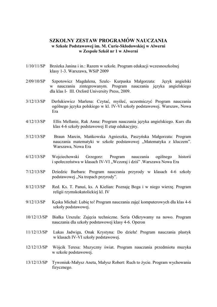 SZKOLNY ZESTAW PROGRAMÓW NAUCZANIA w Szkole Podstawowej im. M. Curie-Skłodowskiej w Alwerni w Zespole Szkół nr 1 w Alwerni 1/10/11/SP Brzózka Janina i in.: Razem w szkole. Program edukacji wczesnoszkolnej klasy 1-3. Warszawa, WSiP 2009 2/09/10/SP Szpotowicz Magdalena, Szulc- Kurpaska Małgorzata: Język angielski w nauczaniu zintegrowanym. Program nauczania języka angielskiego dla klas I- III. Oxford University Press, 2009. 3/12/13/SP Derlukiewicz Marlena: Czytać, myśleć, uczestniczyć Program nauczania ogólnego języka polskiego w kl. IV-VI szkoły podstawowej. Warszaw, Nowa Era 4/12/13/SP Ellis Mellanie, Rak Anna: Program nauczania języka angielskiego. Kurs dla klas 4-6 szkoły podstawowej II etap edukacyjny. 5/12/13/SP Braun Marcin, Mańkowska Agnieszka, Paszyńska Małgorzata: Program nauczania matematyki w szkole podstawowej „Matematyka z kluczem”. Warszawa, Nowa Era 6/12/13/SP Wojciechowski Grzegorz: Program nauczania ogólnego historii i społeczeństwa w klasach IV-VI „Wczoraj i dziś” .Warszawa Nowa Era 7/12/13/SP Dziedzic Barbara: Program nauczania przyrody w klasach 4-6 szkoły podstawowej „Na tropach przyrody”. 8/12/13/SP Red. Ks. T. Panuś, ks. A Kielian: Poznaję Boga i w niego wierzę. Program religii rzymskokatolickiej kl. IV 9/12/13/SP Kęska Michał: Lubię to! Program nauczania zajęć komputerowych dla klas 4-6 szkoły podstawowej. 10/12/13/SP Białka Urszula: Zajęcia techniczne. Seria Odkrywamy na nowo. Program nauczania dla szkoły podstawowej klasy 4-6. Operon 11/12/13/SP Lukas Jadwiga, Onak Krystyna: Do dzieła! Program nauczania plastyk w klasach IV-VI szkoły podstawowej. 12/12/13/SP Wójcik Teresa: Muzyczny świat. Program nauczania przedmiotu muzyka w szkole podstawowej. 13/12/13/SP Tywoniuk-Małysz Aneta, Małysz Robert: Ruch to życie. Program wychowania fizycznego. 14/14/15/SP Łoś D., Bogucka M.: Program nauczania języka anielskiego, zgodny z Podstawą Programową z 23 grudnia 2008 roku i 27 sierpnia 2012 roku. Etap nauki: II etap edukacyjny. Pearson Central Europe. 15/14/15/SP Gorczyk M. Etyka. Chcemy być lepsi. Program nauczania do klasy 1-3 szkoły podstawowej. 16/14/15/SP Ziemska M., Malinowski Ł.: Ludzkie ścieżki. Kompleksowy program nauczania etyki na II, III i IV poziomie edukacyjnym. 17/14/15/SP Król T.: Wędrując ku dorosłości. Wychowanie do życia w rodzinie. Program nauczania dla klas V-VI szkoły podstawowej.