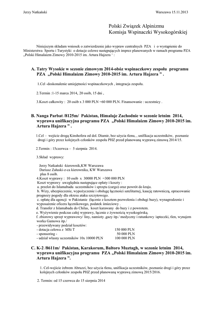 Jerzy Natkański Warszawa 15.11.2013 Polski Związek Alpinizmu Komisja Wspinaczki Wysokogórskiej Niniejszym składam wniosek o zatwierdzenie jako wypraw centralnych PZA i o wystąpienie do Ministerstwa Sportu i Turystyki o dotacje celowe następujących imprez planowanych w ramach programu PZA „Polski Himalaizm Zimowy 2010-2015 im. Artura Hajzera ‘ : A. Tatry Wysokie w sezonie zimowym 2014-obóz wspinaczkowy zespołu programu PZA „Polski Himalaizm Zimowy 2010-2015 im. Artura Hajzera ” . 1.Cel -doskonalenie umiejętności wspinaczkowych , integracja zespołu. 2.Termin :1-15 marca 2014, 20 osób, 15 dni , 3.Koszt całkowity : 20 osób x 3 000 PLN =60 000 PLN. Finansowanie : uczestnicy . B. Nanga Parbat /8125m/ Pakistan, Himalaje Zachodnie w sezonie letnim 2014, wyprawa unifikacyjna programu PZA „Polski Himalaizm Zimowy 2010-2015 im. Artura Hajzera ” . 1.Cel – wejście drogą Kinshofera od dol. Diamir, bez użycia tlenu, , unifikacja uczestników, poznanie drogi i góry przez kolejnych członków zespołu PHZ przed planowaną wyprawą zimową 2014/15. 2.Termin : 15czerwca – 5 sierpnia 2014. 3.Skład wyprawy: Jerzy Natkański -kierownik,KW Warszawa Dariusz Załuski-z-ca kierownika, KW Warszawa plus 8 osób. 4.Koszt wyprawy : 10 osób x 30000 PLN =300 000 PLN Koszt wyprawy uwzględnia następujące opłaty i koszty : a. przelot do Islamabadu uczestników i sprzętu (cargo) oraz powrót do kraju. b. Wizy, ubezpieczenie, wypożyczenie i obsługę łączności satelitarnej, kaucję ratowniczą, opracowanie prognozy pogody dla okresu ataku szczytowego. c. opłatę dla agencji w Pakistanie (łącznie z kosztem pozwolenia i obsługi bazy), wynagrodzenie i wyposażenie oficera łącznikowego, podatek śmieciowy . d. Transfer z Islamabadu do Chilas, koszt karawany do bazy i z powrotem. e. Wyżywienie podczas całej wyprawy, łącznie z żywnością wysokogórską. f. zbiorowy sprzęt wyprawowy/ liny, namioty ,gazy itp./ medyczny i ratunkowy /apteczki, tlen, wynajem worka Gamowa itp./ - przewidywany podział kosztów: - dotacja celowa z MSi T 150 000 PLN - sponsoring 50 000 PLN - udział własny uczestników 10x 10000 PLN 100 000 PLN C. K-2 /8611m/ Pakistan, Karakorum, Baltoro Muztagh, w sezonie letnim 2014, wyprawa unifikacyjna programu PZA „Polski Himalaizm Zimowy 2010-2015 im. Artura Hajzera ”. 1. Cel-wejście żebrem Abruzzi, bez użycia tlenu, unifikacja uczestników, poznanie drogi i góry przez kolejnych członków zespołu PHZ przed planowaną wyprawą zimową 2015/2016. 2. Termin: od 15 czerwca do 15 sierpnia 2014 3. Skład wyprawy: Marcin Kaczkan KW Warszawa –kierownik plus 3 osoby, razem 4 osoby. 4.Koszt wyprawy : 4 osoby x 35000 PLN =140 000 PLN Koszt wyprawy uwzględnia następujące opłaty i koszty : a. przelot do Islamabadu uczestników i sprzętu (cargo) oraz powrót do kraju. b. Wizy, ubezpieczenie, wypożyczenie i obsługę łączności satelitarnej, kaucję ratowniczą, opracowanie prognozy pogody dla okresu ataku szczytowego. c. opłatę dla agencji w Pakistanie (łącznie z kosztem pozwolenia i obsługi bazy), wynagrodzenie i wyposażenie oficera łącznikowego, podatek śmieciowy . d. Transfer z Islamabadu do Skardu i Askole, koszt karawany do bazy i z powrotem. e. Wyżywienie podczas całej wyprawy, łącznie z żywnością wysokogórską. f. zbiorowy sprzęt wyprawowy/ liny, namioty ,gazy itp./ medyczny i ratunkowy /apteczki, tlen, wynajem worka Gamowa itp./ - przewidywany podział kosztów: dotacja celowa MSiT 80 000 PLN - sponsoring 40 000 PLN - udział własny uczestników 4x 5000 PLN 20 000 PLN D. Nanga Parbat /8125m/ Pakistan, Himalaje Zachodnie w sezonie zimowym 2014/15, będącej wyprawą programu PZA „Polski Himalaizm Zimowy 2010-2015 im. Artura Hajzera ”. Cel – pierwsze wejście zimowe na jeden z ostatnich 2-ch niezdobytych zimą ośmiotysięczników, drogą Kinshofera od dol. Diamir , bez użycia tlenu z wykorzystaniem 4 obozów pośrednich. 1. Termin okres 10 grudnia 2014-1 marca 2015. Dotarcie do miejsca bazy i rozpoczęcie akcji górskiej planuje się po 21 grudnia 2014. 2.Skład wyprawy: kierownik plus 9 osób. 3.Koszt wyprawy dla 10 osób 50 000 PLN x 10 = 500 000 PLN Koszt wyprawy uwzględnia następujące opłaty i koszty : a. przelot do Islamabadu uczestników i sprzętu (cargo) oraz powrót do kraju. b. Wizy, ubezpieczenie, wypożyczenie i obsługę łączności satelitarnej, kaucję ratowniczą, opracowanie prognozy pogody dla okresu ataku szczytowego. c. opłatę dla agencji w Pakistanie (łącznie z kosztem pozwolenia i obsługi bazy), wynagrodzenie i wyposażenie oficera łącznikowego, podatek śmieciowy . d. Transfer z Islamabadu do Chilas, koszt karawany do bazy i z powrotem. e. Wyżywienie podczas całej wyprawy, łącznie z żywnością wysokogórską. f. zbiorowy sprzęt wyprawowy/ liny, namioty ,gazy itp./ medyczny i ratunkowy /apteczki, tlen, wynajem worka Gamowa itp./ - przewidywany podział kosztów: - dotacja celowa z MSi T 250 000 PLN - sponsoring 150 000 PLN - udział własny uczestników 10x 10000 PLN 100 000 PLN Z taternickim pozdrowieniem, Jerzy Natkański