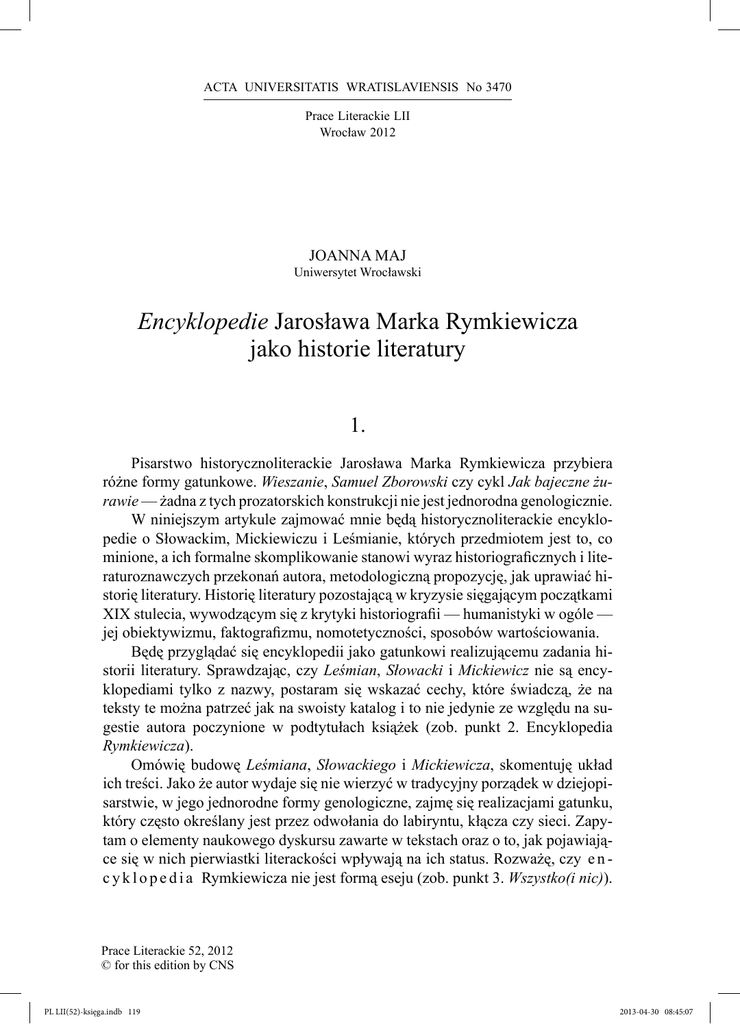ACTA UNIVERSITATIS No 3470 Encyklopedie Jarosława Marka WRATISLAVIENSIS Rymkiewicza jako historie literatury 119 Prace Literackie LII Wrocław 2012 JOANNA MAJ Uniwersytet Wrocławski Encyklopedie Jarosława Marka Rymkiewicza jako historie literatury 1. Pisarstwo historycznoliterackie Jarosława Marka Rymkiewicza przybiera różne formy gatunkowe. Wieszanie, Samuel Zborowski czy cykl Jak bajeczne żurawie — żadna z tych prozatorskich konstrukcji nie jest jednorodna genologicznie. W niniejszym artykule zajmować mnie będą historycznoliterackie encyklopedie o Słowackim, Mickiewiczu i Leśmianie, których przedmiotem jest to, co minione, a ich formalne skomplikowanie stanowi wyraz historiograficznych i literaturoznawczych przekonań autora, metodologiczną propozycję, jak uprawiać historię literatury. Historię literatury pozostającą w kryzysie sięgającym początkami XIX stulecia, wywodzącym się z krytyki historiografii — humanistyki w ogóle — jej obiektywizmu, faktografizmu, nomotetyczności, sposobów wartościowania. Będę przyglądać się encyklopedii jako gatunkowi realizującemu zadania historii literatury. Sprawdzając, czy Leśmian, Słowacki i Mickiewicz nie są encyklopediami tylko z nazwy, postaram się wskazać cechy, które świadczą, że na teksty te można patrzeć jak na swoisty katalog i to nie jedynie ze względu na sugestie autora poczynione w podtytułach książek (zob. punkt 2. Encyklopedia Rymkiewicza). Omówię budowę Leśmiana, Słowackiego i Mickiewicza, skomentuję układ ich treści. Jako że autor wydaje się nie wierzyć w tradycyjny porządek w dziejopisarstwie, w jego jednorodne formy genologiczne, zajmę się realizacjami gatunku, który często określany jest przez odwołania do labiryntu, kłącza czy sieci. Zapytam o elementy naukowego dyskursu zawarte w tekstach oraz o to, jak pojawiające się w nich pierwiastki literackości wpływają na ich status. Rozważę, czy e n c y k l o p e d i a Rymkiewicza nie jest formą eseju (zob. punkt 3. Wszystko(i nic)). Prace Literackie 52, 2012 © for this edition by CNS PL LII(52)-księga.indb 119 2013-04-30 08:45:07 120 JOANNA MAJ Wspomnę także o genologicznych aspektach samych encyklopedycznych haseł. Sprawdzę, jak indeksacyjne1 rozumienie terminu „gatunek” może wpływać na poszerzanie się pól znaczeniowych pojedynczych artykułów w encyklopediach (zob. punkt 4. Wnętrze encyklopedii). Spojrzę także na hipotezę historyczną jako na istotną cechę formalną encyklopedycznego hasła Rymkiewicza (zob. punkt 5. Encyklopedyczna historia (nie)była). Interesuje mnie sposób, w jaki u Rymkiewicza encyklopedia przejmuje obowiązki syntezy historycznoliterackiej. Celem mojego wywodu jest pokazanie, jak encyklopedia tworzy odpowiedź na niemoc historiograficzną, niemoc obecną, jak się wydaje, przede wszystkim w sferze deklaratywnej, metakrytycznej. Z historią literatury jest bowiem trochę tak jak z powieścią: „od kilkudziesięciu lat mówi się o jej kryzysie — a ona wciąż istnieje”2. Będę mówić o encyklopedii Jarosława Marka Rymkiewicza, posługując się terminami z zakresu poetyki i genologii — terminów tych jednak nie rozumiem paradygmatycznie, nie uważam ich też za zjawiska o kategorialnej istocie, uznaję je raczej za indeksy pozwalające przywoływać pewne tradycyjne pola znaczeniowe danych figur w teście. Dla przykładu: indeks gatunkowy nie musi oznaczać bezpretensjonalnego hipertekstu. Nazwa gatunku w tytule może oznaczać aluzję tematyczną lub konstrukcyjną bądź sugestię określonego sposobu czytania. Kwalifikacje gatunkowe nie muszą jednak wiązać się ze strukturą genologicznego paradygmatu, mogą na przykład jedynie ewokować pole tradycji literackiej. 2. Encyklopedia Rymkiewicza We wstępie do Słowackiego znaleźć można literacką metaforę, stanowiącą deklarację metodologiczną: „Całość życia nie da się opowiedzieć, ponieważ całości takiej nie ma — do tego, co wydaje się nam całością naszego życia, zawsze jeszcze można dorzucić jakiś kawałek — coś takiego, o czym zapomnieliśmy. Można też z tego coś ująć”3. Rymkiewicz zapewnia w tych słowach, że tradycyjna historiografia, której towarzyszy gatunek syntezy, nie wyznacza jego modelu pisania. On wybiera encyklopedię, układa alfabetycznie hasła w Leśmianie, Słowackim i Mickiewiczu tak, by forma nie odzwierciedlała żadnego porządku, by nie dążyła do wzmiankowanej w cytacie „całości”. Encyklopedia Rymkiewicza nie jest więc próbą przezwyciężenia metodologicznych i epistemologicznych ograniczeń historiografii, ale z nich czerpie. 1 Na temat indeksacyjnego rozumienia kategorii gatunkowych zob. S. Balbus, Zagłada gatunków, [w:] Polska genologia literacka, red. D. Ostaszewska, R. Cudak, Warszawa 2007, s. 165– 166; na temat metatekstowego i metagatunkowego rozumienia taksonomii genologicznych zob. R. Nycz, Sylwy współczesne, Kraków 1996. 2 H. Markiewicz, Dylematy historyka literatury, [w:] idem, Literaturoznawstwo i jego sąsiedztwa, Warszawa 1989, s. 248. 3 J.M. Rymkiewicz, Słowacki. Encyklopedia, Warszawa 2004, s. 5 (dalej jako S). Prace Literackie 52, 2012 © for this edition by CNS PL LII(52)-księga.indb 120 2013-04-30 08:45:07 Encyklopedie Jarosława Marka Rymkiewicza jako historie literatury 121 Sposób, w jaki ułożone są artykuły informacyjne, wynika właśnie z próby ucieczki od konieczności hierarchizowania zgromadzonych przedmiotów. Alfabetyczny porządek stanowi rzekomą reprodukcję przedustawnego chaosu, którego jednak nie da się odtworzyć. Neutralny układ treści, wolny od subiektywizmu czy ideologii, nie jest możliwy, porządkowanie zaś haseł wedle kolejności alfabetu jawi się jako wyraz niemocy, bezradności wobec konieczności wprowadzenia ładu w kronikarskich zapisach, świadectwach, wspomnieniach, dokumentach, materiałach dotyczących konkretnego ludzkiego istnienia. Na podstawie ź