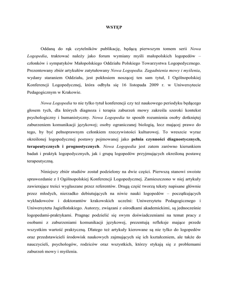WSTĘP Oddaną do rąk czytelników publikację, będącą pierwszym tomem serii Nowa Logopedia, traktować należy jako forum wymiany myśli małopolskich logopedów – członków i sympatyków Małopolskiego Oddziału Polskiego Towarzystwa Logopedycznego. Prezentowany zbiór artykułów zatytułowany Nowa Logopedia. Zagadnienia mowy i myślenia, wydany staraniem Oddziału, jest pokłosiem noszącej ten sam tytuł, I Ogólnopolskiej Konferencji Logopedycznej, która odbyła się 16 listopada 2009 r. w Uniwersytecie Pedagogicznym w Krakowie. Nowa Logopedia to nie tylko tytuł konferencji czy też naukowego periodyku będącego głosem tych, dla których diagnoza i terapia zaburzeń mowy zakreśla szeroki kontekst psychologiczny i humanistyczny. Nowa Logopedia to sposób rozumienia osoby dotkniętej zaburzeniem komunikacji językowej; osoby ograniczanej biologią, lecz mającej prawo do tego, by być pełnoprawnym członkiem rzeczywistości kulturowej. To wreszcie wyraz określonej logopedycznej postawy pojmowanej jako pełnia czynności diagnostycznych, terapeutycznych i prognostycznych. Nowa Logopedia jest zatem zarówno kierunkiem badań i praktyk logopedycznych, jak i grupą logopedów przyjmujących określoną postawę terapeutyczną. Niniejszy zbiór studiów został podzielony na dwie części. Pierwszą stanowi swoiste sprawozdanie z I Ogólnopolskiej Konferencji Logopedycznej. Zamieszczono w niej artykuły zawierające treści wygłaszane przez referentów. Drugą część tworzą teksty napisane głównie przez młodych, nierzadko debiutujących na niwie nauki logopedów – początkujących wykładowców i doktorantów krakowskich uczelni: Uniwersytetu Pedagogicznego i Uniwersytetu Jagiellońskiego. Autorzy, związani z ośrodkami akademickimi, są jednocześnie logopedami-praktykami. Pragnąc podzielić się swym doświadczeniami na temat pracy z osobami z zaburzeniami komunikacji językowej, prezentują refleksje mające przede wszystkim wartość praktyczną. Dlatego też artykuły kierowane są nie tylko do logopedów oraz przedstawicieli środowisk naukowych zajmujących się ich kształceniem, ale także do nauczycieli, psychologów, rodziców oraz wszystkich, którzy stykają się z problemami zaburzeń mowy i myślenia. Część I – Zagadnienia mowy i myślenia. Teksty pokonferencyjne1 Fundamentalnym dla postępowania terapeutycznego w zaburzeniach mowy składnikiem jest diagnoza. O możliwościach i sposobach badania funkcji lewopółkulowych, kluczowych dla nabywania języka, traktuje artykuł Jagody Cieszyńskiej-Rożek Diagnoza funkcji lewej półkuli mózgu i jej wpływ na programowanie terapii dzieci w wieku przedszkolnym. Jak wynika z doniesień współczesnych badań, lewopólkulowe umiejętności psychiczne determinują nie tylko nabywanie mowy, ale – w świetle filozofii humanistycznej – warunkują także myślenie, a poprzez nie – interpretację rzeczywistości. Dowodem na wzajemne uwarunkowania tych korelatów są przytoczone przez Mirosława Michalika studia z zakresu terapii dziecka z upośledzeniem intelektualnym. Autor artykułu Między językiem, myśleniem a rzeczywistością – budowanie kompetencji gramatyczno-leksykalnej dziecka podejrzewanego o upośledzenie intelektualne. Studium przypadku w oparciu o doświadczenia w terapii z dziećmi z głębokimi zaburzeniami komunikacji, dokonał modyfikacji trójkąta semantycznego Ogdena i Richarda, wykazując wzajemne, bezpośrednie oddziaływania pomiędzy myśleniem, językiem a percepcją rzeczywistości. Także badania przeprowadzone przez Annę Skoczek wśród dzieci w wieku wczesnoszkolnym ze specyficznymi zaburzeniami rozwojowymi języka (SLI) wykazały istotny związek pomiędzy sposobem mówienia a umiejętnością precyzowania myśli. Wyniki tych badań zawarte zostały w studium Myślenie przyczynowo-skutkowe u dzieci ze specyficznymi zaburzeniami rozwoju językowego (SLI). O problemach w przyswajaniu podsystemów językowych w przypadku bilingwizmu pisze Edyta Saran-Pasoń w artykule Kształtowanie się systemu fonetyczno-fonologicznego u dzieci jedno- i dwujęzycznych w wieku od 3. do 5. roku życia. Autorka, wykorzystując wieloletnie doświadczenie w pracy z dziećmi dwujęzycznymi, opisuje badania porównawcze w sposobie nabywania systemu fonetyczno-fonologicznego przez dzieci dwujęzyczne, dla których jeden z języków jest dominujący, oraz u dzieci korzystających z obu systemów językowych w takim samym stopniu. Podstawą działań terapeutyczno-prognostycznych jest przekonanie, że rzeczywistość determinuje język – a zatem działania terapeutyczne warunkują rozwój mowy i myślenia u osób z zaburzeniami komunikacji. Przekonanie to stało się inspiracją do stworzenia metody, która zoptymalizowałaby działania terapeutyczne. Symultaniczno-sekwencyjna nauka 1 Z uwagi na powiązania tematyczne artykuły zawarte w pierwszej części tomu nie są odwzorowaniem kolejności referatów wygłoszonych podczas I Ogólnopolskiej Konferencji Małopolskiego Oddziału PTL. czytania, uwzględniająca neurologiczne, psychiczne oraz językowe podłoże komunikacji, skupia się na holistycznej stymulacji rozwoju intelektualnego, językowego oraz społecznego. Metodyka postępowania oraz skutki terapii opartej na symultaniczno-sekwencyjnej nauce czytania z dziećmi z głębokimi zaburzeniami języka zawarta jest w artykułach Kariny Bik Stymulacja funkcji lewej półkuli mózgu w terapii dzieci z obniżoną sprawnością intelektualną, Marty Korendo Zaburzenia lewopólkulowe u dzieci z zespołem Aspergera oraz Zdzisławy Orłowskiej-Popek Praca nad budowaniem systemu językowego u niesłyszących dzieci z implantem ślimakowym. część Pierwszą zakłócających tomu prawidłowy zamykają rozwój rozważania mowy. o Wykazane organicznych zależności zaburzeniach między filo- i ontogenetycznym rozwojem narządu mowy oraz wykorzystywane naturalne możliwości narządu żucia do tw