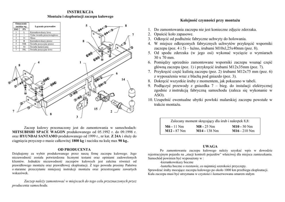 INSTRUKCJA MontaŜu i eksploatacji zaczepu kulowego Kolejność czynności przy montaŜu Oznaczenie zacisku wg ISO PN 1 L 2 + 3 31 4 R 5 58R 6 54 7 58L 5 Łączenie przewodów Kierunkowskazy lewe Tylne światła przeciwmgłowe Masa Kierunkowskazy prawe Światła pozycyjne prawe Światła hamowania Światła pozycyjne lewe 8 7 8 4 1 8 6 14 15 7 8 1. 2. 3. 4. Do zamontowania zaczepu nie jest konieczne zdjęcie zderzaka. Opuścić koło zapasowe. Odkręcić od podłuŜnic fabryczne uchwyty do holowania. W miejsce odkręconych fabrycznych uchwytów przykręcić wsporniki zaczepu (poz. 4 i 5) – luźno, śrubami M10xl,25x40mm (poz. 8). 5. Od spodu zderzaka (w jego osi) wykonać wycięcie o wymiarach 30 x 70 mm. 6. Pomiędzy uprzednio zamontowane wsporniki zaczepu wsunąć część główną zaczepu (poz. 1) i przykręcić śrubami M12x35mm (poz. 7). 7. Przykręcić część kulistą zaczepu (poz. 2) śrubami M12x75 mm (poz. 6) z wyposaŜenia wraz z blachą pod gniazdo (poz. 3). 8. Dokręcić wszystkie śruby z momentem, jak pokazano w tabeli. 9. Podłączyć przewody z gniazdka 7 – bieg. do instalacji elektrycznej zgodnie z instrukcją fabryczną samochodu (zaleca się wykonanie w ASO). 10. Uzupełnić ewentualne ubytki powłoki malarskiej zaczepu powstałe w trakcie montaŜu. 2 3 Zaczep kulowy przeznaczony jest do zamontowania w samochodach: MITSUBISHI SPACE WAGON produkowanego od 05.1992 r. do 09.1998 r. oraz HYUNDAI SANTAMO produkowanego od 1999 r., nr kat. Z 24A i słuŜy do ciągnięcia przyczep o masie całkowitej 1800 kg i nacisku na kulę max 90 kg.. OD PRODUCENTA Dziękujemy za wybór produkowanego przez naszą firmę zaczepu kulowego. Jego niezawodność została potwierdzona licznymi testami oraz opiniami zadowolonych klientów. JednakŜe niezawodność zaczepów kulowych jest zaleŜna równieŜ od prawidłowego montaŜu oraz prawidłowej eksploatacji. Z tego powodu prosimy Państwa o staranne przeczytanie niniejszej instrukcji montaŜu oraz przestrzeganie zawartych wskazówek. Zaczep naleŜy zamontować w miejscach do tego celu przeznaczonych przez producenta samochodu. Zalecany moment skręcający dla śrub i nakrętek 8,8: M6 - 11 Nm M8 - 25 Nm M10 - 50 Nm M12 - 87 Nm M14 - 138 Nm M16 - 210 Nm UWAGA Po zamontowaniu zaczepu kulowego naleŜy uzyskać wpis w dowodzie rejestracyjnym pojazdu na „stacji kontroli pojazdów” właściwej dla miejsca zamieszkania. Samochód powinien być wyposaŜony w : -kierunkowskazy boczne -lusterka boczne o rozstawie, co najmniej szerokości przyczepy. Sprawdzać śruby mocujące zaczepu kulowego po około 1000 km przebiegu eksploatacji. Kula zaczepu musi być utrzymana w czystości i konserwowana smarem stałym PPUH AUTO-HAK S. J. WyposaŜenie zaczepu: Produkcja Zaczepów Kulowych Henryk & Zbigniew Nejman 76-200 SŁUPSK ul. Słoneczna 16K tel/fax (059) 8-414-414; 8-414-413 E-mail: [email protected] www.autohak.com.pl Zaczep kulowy bez wyposaŜenia elektrycznego Z24A Klasa: A50-X Nr kat. Przeznaczony do zamontowania w samochodzie: KARTA GWARANCYJNA Producent udziela gwarancji niniejszą kartą gwarancyjną na okres 24 miesięcy licząc od dnia zakupu zaczepu kulowego do samochodu: Producent: MITSUBISHI Model: SPACE WAGON produkowanego od 05.1992 r. do 09.1998 r. Producent: HYUNDAI Model: SANTAMO produkowanego od 1999 r. Dane techniczne: Wartość siły D : 9,60 kN maksymalna masa przyczepy: 1800 kg maksymalny nacisk na kulę: 90 kg Numer homologacji zgodnie z Dyrektywą 94/20/WE: e20*94/20*1016*00 MITSUBISHI SPACE WAGON produkowanego od 05.1992 r. do 09.1998 r. HYUNDAI SANTAMO produkowanego od 1999 r. INFORMACJA WSTĘPNA Data produkcji .............................. Data zakupu.................................. Zakres gwarancji obejmuje wyłącznie wady jakościowe wynikające z winy producenta. Gwarancja nie obejmuje natomiast uszkodzeń zawinionych przez nabywcę, wynikających z niewłaściwego montaŜu, uŜytkowania lub konserwacji, uszkodzeń mechanicznych, normalnego zuŜycia podczas eksploatacji itp. Gwarancja udzielona na zakupiony towar nie wyłącza, nie ogranicza ani nie zawiesza uprawnień kupującego wynikających z niezgodności towaru z umową. Reklamacje naleŜy zgłaszać w punkcie sprzedaŜy, składając jednocześnie kartę gwarancyjną. Usunięcie "wady" następuje po stwierdzeniu przez punkt sprzedaŜy wspólnie z producentem słuszności złoŜonej reklamacji. Reklamacja powinna być załatwiona w ciągu czternastu dni od dnia uznania reklamacji. Karta gwarancyjna jest niewaŜna jeŜeli nie jest wypełniona i podpisana. Data zgłoszenia reklamacji: ................................................................... Zaczep kulowy jest skonstruowany zgodnie z zasadami bezpieczeństwa ruchu drogowego. Zaczep kulowy jest elementem wpływającym na bezpieczeństwo jazdy i moŜe zostać zainstalowany wyłącznie przez personel wyspecjalizowany. Niedopuszczalne jest dokonywanie jakichkolwiek zmian w konstrukcji zaczepu. Powoduje to wygaśniecie dopuszczenia do stosowania. W przypadku obecności masy izolacyjnej lub osłony podwozia w miejscu przylegania zaczepu, naleŜy ją usunąć. Nieosłonięte miejsca karoserii oraz wywiercone otwory naleŜy pomalować farbą antykorozyjną. Informacjami wiąŜącymi odnośnie wartości obciąŜeń są dane podawane przez producenta samochodu, względnie wartości maksymalnej masy przyczepy oraz maksymalnego nacisku na kulę, przy czym wartości parametrów zaczepu kulowego nie mogą być przekroczone. Wzór do obliczania wartości siły D: Maks. masa przyczepy [kg] x Masa całkowita samochodu [kg] 9,81 = X + 1000 Maks. masa przyczepy [kg] + Masa całkowita samochodu [kg] + D [kN]