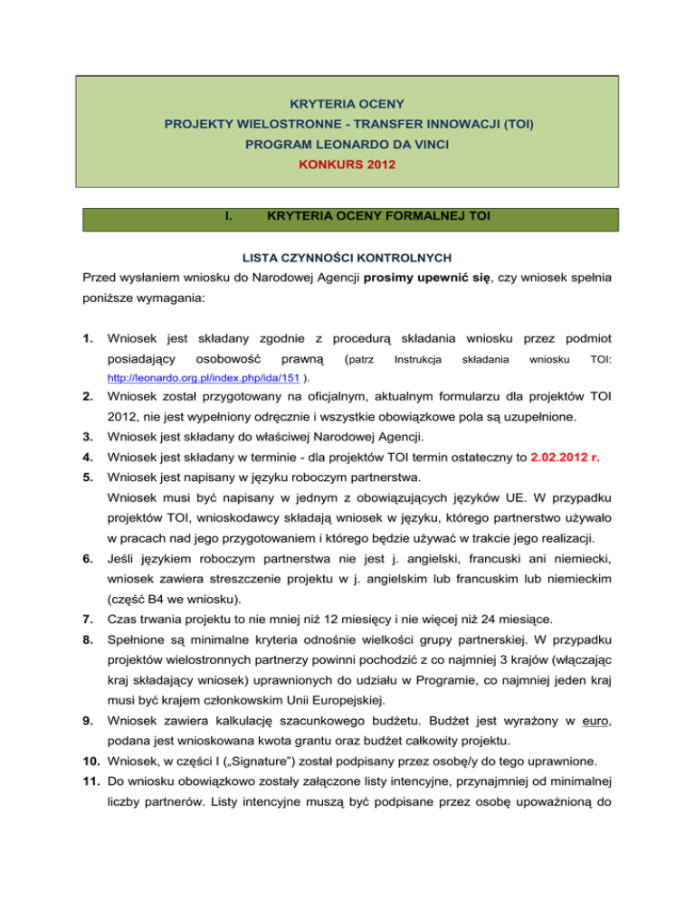 KRYTERIA OCENY PROJEKTY WIELOSTRONNE - TRANSFER INNOWACJI (TOI) PROGRAM LEONARDO DA VINCI KONKURS 2012 I. KRYTERIA OCENY FORMALNEJ TOI LISTA CZYNNOŚCI KONTROLNYCH Przed wysłaniem wniosku do Narodowej Agencji prosimy upewnić się, czy wniosek spełnia poniższe wymagania: 1. Wniosek jest składany zgodnie z procedurą składania wniosku przez podmiot posiadający osobowość prawną (patrz Instrukcja składania wniosku TOI: http://leonardo.org.pl/index.php/ida/151 ). 2. Wniosek został przygotowany na oficjalnym, aktualnym formularzu dla projektów TOI 2012, nie jest wypełniony odręcznie i wszystkie obowiązkowe pola są uzupełnione. 3. Wniosek jest składany do właściwej Narodowej Agencji. 4. Wniosek jest składany w terminie - dla projektów TOI termin ostateczny to 2.02.2012 r. 5. Wniosek jest napisany w języku roboczym partnerstwa. Wniosek musi być napisany w jednym z obowiązujących języków UE. W przypadku projektów TOI, wnioskodawcy składają wniosek w języku, którego partnerstwo używało w pracach nad jego przygotowaniem i którego będzie używać w trakcie jego realizacji. 6. Jeśli językiem roboczym partnerstwa nie jest j. angielski, francuski ani niemiecki, wniosek zawiera streszczenie projektu w j. angielskim lub francuskim lub niemieckim (część B4 we wniosku). 7. Czas trwania projektu to nie mniej niż 12 miesięcy i nie więcej niż 24 miesiące. 8. Spełnione są minimalne kryteria odnośnie wielkości grupy partnerskiej. W przypadku projektów wielostronnych partnerzy powinni pochodzić z co najmniej 3 krajów (włączając kraj składający wniosek) uprawnionych do udziału w Programie, co najmniej jeden kraj musi być krajem członkowskim Unii Europejskiej. 9. Wniosek zawiera kalkulację szacunkowego budżetu. Budżet jest wyrażony w euro, podana jest wnioskowana kwota grantu oraz budżet całkowity projektu. 10. Wniosek, w części I („Signature”) został podpisany przez osobę/y do tego uprawnione. 11. Do wniosku obowiązkowo zostały załączone listy intencyjne, przynajmniej od minimalnej liczby partnerów. Listy intencyjne muszą być podpisane przez osobę upoważnioną do reprezentowania instytucji partnerskiej na zewnątrz. Na etapie składania wniosków honorowane będą kserokopie i skany listów lub ich kopie faksowe. 12. Jeśli wniosek nie jest podpisany przez prawnego przedstawiciela instytucji, załączono stosowne pełnomocnictwo (oryginał). 13. W przypadku instytucji niepublicznych – do wniosku o dofinansowanie powyżej 25 000,00 euro, dołączona jest kopia oficjalnego rocznego sprawozdania finansowego za ostatni rok finansowy, dla którego księgi zostały zamknięte (potwierdzona za zgodność z oryginałem). 14. W przypadku instytucji niepublicznych do wniosku dołączono aktualny (nie starszy niż 3 miesiące od daty podpisania wniosku) wyciąg z odpowiedniego rejestru (np. wyciąg z KRS) i ewentualnie inne właściwe dokumenty informujące o prawnym statusie organizacji i osobach prawnie upoważnionych do zaciągania zobowiązań w imieniu organizacji (oryginał lub kopia potwierdzona za zgodność z oryginałem). Oraz dodatkowo: 15. Do wniosku dołączono życiorysy kluczowych osób zaangażowanych w projekt. Ich brak nie spowoduje odrzucenia wniosku z powodów formalnych, lecz może wpłynąć na niższą ocenę jakościową projektu. 16. Do wniosku dołączone są 2 egzemplarze kluczowego produktu, będącego przedmiotem transferu w projekcie. W przypadku materiałów o dużej objętości, prosimy o wersję elektroniczną (CD-ROM/pendrive). Brak ww. załącznika nie spowoduje odrzucenia wniosku z powodów formalnych, lecz może wpłynąć na ocenę jakościową projektu. Spełnienie wszystkich kryteriów formalnych jest niezbędne, aby wniosek został przekazany do oceny jakościowej, dokonywanej przez dwóch niezależnych ekspertów. Wnioski będą oceniane w skali 100 punktów pod kątem wymienionych poniżej kryteriów jakościowych. W każdym kryterium konieczne jest osiągnięcie minimalnego progu punktacji, w przeciwnym razie projekt zostaje odrzucony. Minimalna liczba punktów pozwalająca otrzymać dofinansowanie wynosi 65. Dodatkowo przyznawane są punkty za priorytety narodowe (max. 15 punktów), opublikowane na stronie: http://leonardo.org.pl/index.php/ida/151 . II. KRYTERIA OCENY JAKOŚCIOWEJ TOI 1. ZGODNOŚĆ Z CELAMI I PRIORYTETAMI PROGRAMU (0-10 pkt; min. próg: 7) Proponowany projekt jest wyraźnie umiejscowiony w jednej z dziedzin priorytetowych podanych w „Zaproszeniu do składania wniosków” i dotyczy także szerszych celów programu Uczenie się przez całe życie/Leonardo da Vinci. 2. INNOWACYJNY CHARAKTER I POPRAWA KRAJOWYCH SYSTEMÓW KSZTAŁCENIA I SZKOLENIA ZAWODOWEGO (0-15 pkt; min. próg: 10) Proponowany projekt stworzy nowe możliwości w zakresie kształcenia, doskonalenia umiejętności, dostępu do informacji itp. i/lub ma na celu opracowanie rozwiązań odpowiadających na faktyczne i rozpoznane potrzeby partnerów konsorcjum oraz beneficjentów, do których projekt jest skierowany. Te cele zostaną osiągnięte poprzez dostosowanie i przeniesienie (transfer) istniejących praktyk, które posłużą rozwiązaniu danego problemu/zaspokojeniu danych potrzeb. 3. JAKOŚĆ KONSORCJUM (0-10 pkt , min. próg: 6) W skład konsorcjum wchodzą partnerzy posiadający wszelkie umiejętności i kompetencje, jakich wymaga realizacja wszystkich aspektów programu pracy; udział wszystkich partnerów w przedstawionych działaniach jest odpowiednio zrównoważony. 4. WYMIAR EUROPEJSKI (0-10 pkt, min. próg: 7) Zastosowanie podejścia europejskiego, zamiast krajowego czy regionalnego, zapewnia wyraźnie widoczne korzyści – są one wymienione we wniosku i mają odzwierciedlenie w programie pracy. 5. JAKOŚĆ METODOLOGII I PLANU PRACY (0-20 pkt; min. próg: 13) Cele są jasne i realistyczne, dotyczą istotnego zagadnienia i odpowiadają na określone potrzeby; metodologia jest odpowiednia do realiza