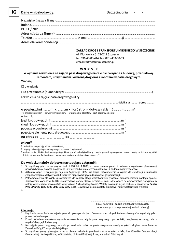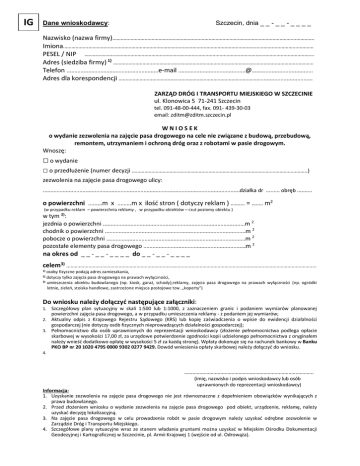 IG Dane wnioskodawcy: Szczecin, dnia _ _ - _ _ - _ _ _ _ Nazwisko (nazwa firmy)………………………………………………………………………………………………………………………………. Imiona……………………………………………………………………………………………………………………………………………………………… PESEL / NIP ………………………………………………………………………………………………………………………………………………… Adres (siedziba firmy) 1) ……………………………………………………………………………………………………………………………… Telefon ............................................................e-mail ............................................@........................................ Adres dla korespondencji ………………………………………………………………………………………….................................. ZARZĄD DRÓG I TRANSPORTU MIEJSKIEGO W SZCZECINIE ul. Klonowica 5 71-241 Szczecin tel. 091-48-00-444, fax. 091- 439-30-03 email: [email protected] WNIOSEK o wydanie zezwolenia na zajęcie pasa drogowego na cele nie związane z budową, przebudową, remontem, utrzymaniem i ochroną dróg oraz z robotami w pasie drogowym. Wnoszę: □ o wydanie □ o przedłużenie (numer decyzji ………………………………………………….…………………………………………………………..) zezwolenia na zajęcie pasa drogowego ulicy: .................................................................................................................................działka dr ......... obręb .......... o powierzchni .........m x .........m x ilość stron ( dotyczy reklam ) ………. = …….. m2 (w przypadku reklam – powierzchnia reklamy , w przypadku obiektów – rzut poziomy obiektu ) w tym 2): jezdnia o powierzchni .............................................................................................m 2 chodnik o powierzchni ............................................................................................m 2 pobocze o powierzchni ...........................................................................................m 2 pozostałe elementy pasa drogowego ...................................................................m 2 na okres od _ _ - _ _ - _ _ _ _ do _ _ - _ _ - _ _ _ _ celem3) ...................................................................................................................................................................................... 1) osoby fizyczne podają adres zamieszkania, dotyczy tylko zajęcia pasa drogowego na prawach wyłączności, 3) umieszczenia obiektu budowlanego (np. kiosk, garaż, schody),reklamy, zajęcia pasa drogowego na prawach wyłączności (np. ogródki letnie, zieleń, stoiska handlowe, zastrzeżone miejsca postojowe tzw. „koperty”) 2) Do wniosku należy dołączyć następujące załączniki: Szczegółowy plan sytuacyjny w skali 1:500 lub 1:1000, z zaznaczeniem granic i podaniem wymiarów planowanej powierzchni zajęcia pasa drogowego, a w przypadku umieszczenia reklamy - z podaniem jej wymiarów; 2. Aktualny odpis z Krajowego Rejestru Sądowego (KRS) lub kopię zaświadczenia o wpisie do ewidencji działalności gospodarczej (nie dotyczy osób fizycznych nieprowadzących działalności gospodarczej); 3. Pełnomocnictwo dla osób uprawnionych do reprezentacji wnioskodawcy (złożenie pełnomocnictwa podlega opłacie skarbowej w wysokości 17,00 zł, za urzędowe potwierdzenie zgodności kopii udzielonego pełnomocnictwa z oryginałem należy wnieść dodatkowo opłatę w wysokości 5 zł za każdą stronę). Wpłaty dokonuje się na rachunek bankowy w Banku PKO BP nr 20 1020 4795 0000 9302 0277 9429. Dowód wniesienia opłaty skarbowej należy dołączyć do wniosku. 1. 4. ………………………………………………………………………………… (imię, nazwisko i podpis wnioskodawcy lub osób uprawnionych do reprezentacji wnioskodawcy) Informacja: 1. Uzyskanie zezwolenia na zajęcie pasa drogowego nie jest równoznaczne z dopełnieniem obowiązków wynikających z prawa budowlanego. 2. Przed złożeniem wniosku o wydanie zezwolenia na zajęcie pasa drogowego pod obiekt, urządzenie, reklamę, należy uzyskać decyzję lokalizacyjną. 3. Na zajęcie pasa drogowego w celu prowadzenia robót w pasie drogowym należy uzyskać odrębne zezwolenie w Zarządzie Dróg i Transportu Miejskiego. 4. Szczegółowe plany sytuacyjne wraz ze stanem władania gruntami można uzyskać w Miejskim Ośrodku Dokumentacji Geodezyjnej i Kartograficznej w Szczecinie, pl. Armii Krajowej 1 (wejście od ul. Odrowąża).