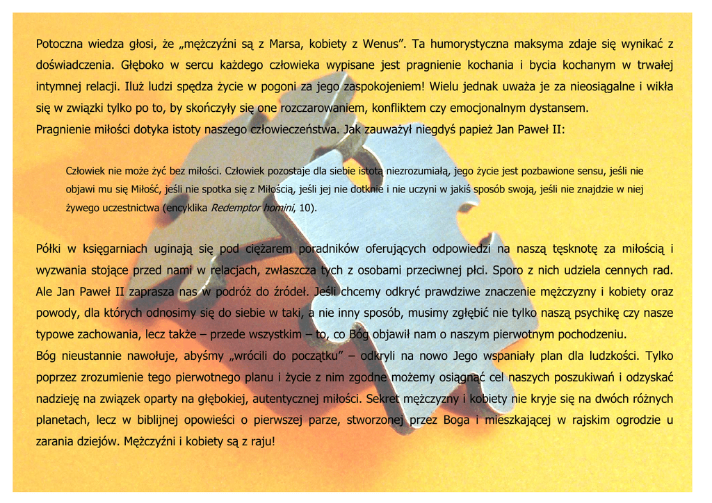 Potoczna wiedza głosi, Ŝe „męŜczyźni są z Marsa, kobiety z Wenus”. Ta humorystyczna maksyma zdaje się wynikać z doświadczenia. Głęboko w sercu kaŜdego człowieka wypisane jest pragnienie kochania i bycia kochanym w trwałej intymnej relacji. IluŜ ludzi spędza Ŝycie w pogoni za jego zaspokojeniem! Wielu jednak uwaŜa je za nieosiągalne i wikła się w związki tylko po to, by skończyły się one rozczarowaniem, konfliktem czy emocjonalnym dystansem. Pragnienie miłości dotyka istoty naszego człowieczeństwa. Jak zauwaŜył niegdyś papieŜ Jan Paweł II: Człowiek nie moŜe Ŝyć bez miłości. Człowiek pozostaje dla siebie istotą niezrozumiałą, jego Ŝycie jest pozbawione sensu, jeśli nie objawi mu się Miłość, jeśli nie spotka się z Miłością, jeśli jej nie dotknie i nie uczyni w jakiś sposób swoją, jeśli nie znajdzie w niej Ŝywego uczestnictwa (encyklika Redemptor homini, 10). Półki w księgarniach uginają się pod cięŜarem poradników oferujących odpowiedzi na naszą tęsknotę za miłością i wyzwania stojące przed nami w relacjach, zwłaszcza tych z osobami przeciwnej płci. Sporo z nich udziela cennych rad. Ale Jan Paweł II zaprasza nas w podróŜ do źródeł. Jeśli chcemy odkryć prawdziwe znaczenie męŜczyzny i kobiety oraz powody, dla których odnosimy się do siebie w taki, a nie inny sposób, musimy zgłębić nie tylko naszą psychikę czy nasze typowe zachowania, lecz takŜe – przede wszystkim – to, co Bóg objawił nam o naszym pierwotnym pochodzeniu. Bóg nieustannie nawołuje, abyśmy „wrócili do początku” – odkryli na nowo Jego wspaniały plan dla ludzkości. Tylko poprzez zrozumienie tego pierwotnego planu i Ŝycie z nim zgodne moŜemy osiągnąć cel naszych poszukiwań i odzyskać nadzieję na związek oparty na głębokiej, autentycznej miłości. Sekret męŜczyzny i kobiety nie kryje się na dwóch róŜnych planetach, lecz w biblijnej opowieści o pierwszej parze, stworzonej przez Boga i mieszkającej w rajskim ogrodzie u zarania dziejów. MęŜczyźni i kobiety są z raju!