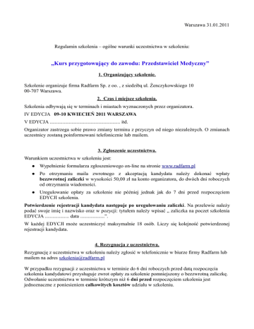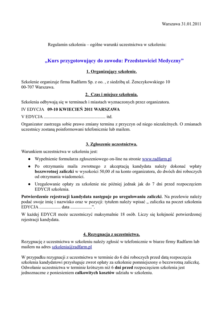 Warszawa 31.01.2011 Regulamin szkolenia – ogólne warunki uczestnictwa w szkoleniu: „Kurs przygotowujący do zawodu: Przedstawiciel Medyczny” 1. Organizujący szkolenie. Szkolenie organizuje firma Radfarm Sp. z oo. , z siedzibą ul. Żenczykowskiego 10 00-707 Warszawa. 2. Czas i miejsce szkolenia. Szkolenia odbywają się w terminach i miastach wyznaczonych przez organizatora. IV EDYCJA 09-10 KWIECIEŃ 2011 WARSZAWA V EDYCJA ....................................................... itd. Organizator zastrzega sobie prawo zmiany terminu z przyczyn od niego niezależnych. O zmianach uczestnicy zostaną poinformowani telefonicznie lub mailem. 3. Zgłoszenie uczestnictwa. Warunkiem uczestnictwa w szkoleniu jest: Wypełnienie formularza zgłoszeniowego on-line na stronie www.radfarm.pl Po otrzymaniu maila zwrotnego z akceptacją kandydata należy dokonać wpłaty bezzwrotnej zaliczki w wysokości 50,00 zł na konto organizatora, do dwóch dni roboczych od otrzymania wiadomości. Uregulowanie opłaty za szkolenie nie później jednak jak do 7 dni przed rozpoczęciem EDYCJI szkolenia. Potwierdzenie rejestracji kandydata następuje po uregulowaniu zaliczki. Na przelewie należy podać swoje imię i nazwisko oraz w pozycji: tytułem należy wpisać „ zaliczka na poczet szkolenia EDYCJA ................... data ...................”. W każdej EDYCJI może uczestniczyć maksymalnie 18 osób. Liczy się kolejność potwierdzonej rejestracji kandydata. 4. Rezygnacja z uczestnictwa. Rezygnację z uczestnictwa w szkoleniu należy zgłosić w telefonicznie w biurze firmy Radfarm lub mailem na adres [email protected] W przypadku rezygnacji z uczestnictwa w terminie do 6 dni roboczych przed datą rozpoczęcia szkolenia kandydatowi przysługuje zwrot opłaty za szkolenie pomniejszony o bezzwrotną zaliczkę. Odwołanie uczestnictwa w terminie krótszym niż 6 dni przed rozpoczęciem szkolenia jest jednoznaczne z poniesieniem całkowitych kosztów udziału w szkoleniu. 5. Cena szkolenia. Cena szkolenia obejmuje: koszt szkolenia, komplet materiałów szkoleniowych, certyfikat ukończenia szkolenia, napoje, słodycze. Cena nie obejmują kosztów zakwaterowania i dojazdów. IV EDYCJA 09 – 10 kwiecień 2011 Warszawa – cena brutto 499,00zł (netto 405,7zł) (patronat merytoryczny Uniwersytet Warszawski – Wydział Zarządzania) kolejne EDYCJE (organizowane w terminie od 15.04. 2011 do 30.06.2011) 499,00zł – 519,00zł) 6. Dane organizatora: RADFARM Spółka z ograniczoną odpowiedzialnością Spółka komandytowa. Adres biura: ul. Żenczykowskiego 10 00-707 Warszawa info. tel. (22) 891 44 08 lub (22) 891 10 01, tel. do trenera prowadzącego/organizatora 502 707 510 Fax. (+4822) 891 44 09 e-mail: [email protected] nr konta bankowego: 64 1160 2202 0000 0001 5634 0469