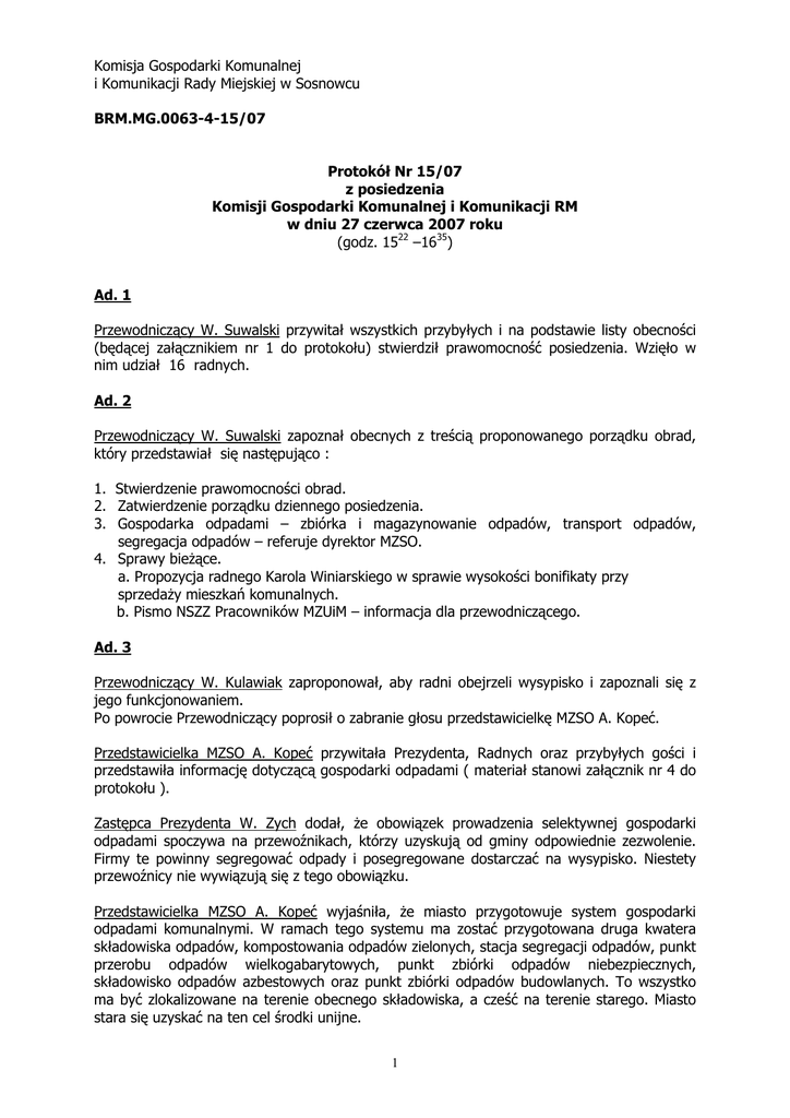 Komisja Gospodarki Komunalnej i Komunikacji Rady Miejskiej w Sosnowcu BRM.MG.0063-4-15/07 Protokół Nr 15/07 z posiedzenia Komisji Gospodarki Komunalnej i Komunikacji RM w dniu 27 czerwca 2007 roku (godz. 1522 –1635) Ad. 1 Przewodniczący W. Suwalski przywitał wszystkich przybyłych i na podstawie listy obecności (będącej załącznikiem nr 1 do protokołu) stwierdził prawomocność posiedzenia. Wzięło w nim udział 16 radnych. Ad. 2 Przewodniczący W. Suwalski zapoznał obecnych z treścią proponowanego porządku obrad, który przedstawiał się następująco : 1. Stwierdzenie prawomocności obrad. 2. Zatwierdzenie porządku dziennego posiedzenia. 3. Gospodarka odpadami – zbiórka i magazynowanie odpadów, transport odpadów, segregacja odpadów – referuje dyrektor MZSO. 4. Sprawy bieżące. a. Propozycja radnego Karola Winiarskiego w sprawie wysokości bonifikaty przy sprzedaży mieszkań komunalnych. b. Pismo NSZZ Pracowników MZUiM – informacja dla przewodniczącego. Ad. 3 Przewodniczący W. Kulawiak zaproponował, aby radni obejrzeli wysypisko i zapoznali się z jego funkcjonowaniem. Po powrocie Przewodniczący poprosił o zabranie głosu przedstawicielkę MZSO A. Kopeć. Przedstawicielka MZSO A. Kopeć przywitała Prezydenta, Radnych oraz przybyłych gości i przedstawiła informację dotyczącą gospodarki odpadami ( materiał stanowi załącznik nr 4 do protokołu ). Zastępca Prezydenta W. Zych dodał, że obowiązek prowadzenia selektywnej gospodarki odpadami spoczywa na przewoźnikach, którzy uzyskują od gminy odpowiednie zezwolenie. Firmy te powinny segregować odpady i posegregowane dostarczać na wysypisko. Niestety przewoźnicy nie wywiązują się z tego obowiązku. Przedstawicielka MZSO A. Kopeć wyjaśniła, że miasto przygotowuje system gospodarki odpadami komunalnymi. W ramach tego systemu ma zostać przygotowana druga kwatera składowiska odpadów, kompostowania odpadów zielonych, stacja segregacji odpadów, punkt przerobu odpadów wielkogabarytowych, punkt zbiórki odpadów niebezpiecznych, składowisko odpadów azbestowych oraz punkt zbiórki odpadów budowlanych. To wszystko ma być zlokalizowane na terenie obecnego składowiska, a cześć na terenie starego. Miasto stara się uzyskać na ten cel środki unijne. 1 Radny T. Bańbuła zapytał, ile zajęło przygotowanie dokumentacji oraz wybudowanie siedziby wysypiska. Zastępca Prezydenta W. Zych odpowiedział, że ponad półtora roku. Prezydent dodał, że odrębną sprawą w temacie gospodarka odpadami są spalarnie. Jest to przedsięwzięcie, na które potrzeba bardzo wysokich nakładów sięgających sto to milionów złotych. Są to obiekty wysoko wydajne i problemem może być zapewnienie odpowiedniej ilości śmieci. Jedna spalarnia dla miasta Sosnowca to stanowczo za dużo. Ocenia się, iż na cały kraj potrzebne jest dziesięć spalarni, natomiast na naszą aglomerację przewidziano dwie. Prawdopodobnie będą to Ruda Śląska i Katowice. Radny T. Bańbuła zwrócił uwagę, że skoro ceny odpadów posegregowanych i nie posegregowanych są takie same, wiele firm i spółdzielni odstąpiło od segregacji odpadów. Zastępca Prezydenta W. Zych stwierdził, że dobrym rozwiązaniem byłoby przejęcie śmieci przez gminę. Mieszkańcy będą płacić podatek od śmieci i w jego ramach każdy miałby dostarczone pojemniki. Przedstawiciel WŚR A. Smołucha zwróciła uwagę, że ważną kwestią jest zablokowanie przypływu odpadów z innych miast. Składowisko powinno przyjmować śmieci wyłącznie z terenu miasta. Przewodniczący Rady Miejskiej D. Miklasiński zaproponował, aby opłaty za składowanie odpadów z sąsiednich miast były bardzo wysokie. Kolejnym dobrym pomysłem jest przyjmowanie posegregowanych śmieci za darmo. Radny M. Godek zapytał, dlaczego w Polsce ma powstać tylko dziesięć spalarni. Istnieją przecież możliwości budowania mniejszych obiektów. Zastępca Prezydenta W. Zych powiedział, że liczba ta została ustalona na podstawie optymalizacji procesu gospodarowania odpadami. Radny M. Godek odpowiedział, że był na szkoleniu, na którym mówiono , iż można budować spalarnie obsługujące mniejsze ilości śmieci. Przedstawiciel WŚR A. Smołucha dodała, że spalarnie są najdroższym sposobem unieszkodliwienia odpadów. Dlatego w ogólnopolskim planie gospodarowania odpadami przewidziano minimum dziesięć spalarni. Przewodniczący W. Kulawiak poinformował, że w Wiedniu spalarnia znajduje się w centrum miasta, a uzyskana energia ze spalania śmieci zasila sąsiednie osiedla. Radny A. Chęciński zapytał, czy jest szansa na wejście ustawy oddającej śmieci gminie. Przedstawiciel WŚR A. Smołucha odpowiedziała, że firmy przewożące śmieci lobbują, aby ustawa nie weszła w życie. Radny G. Pisalski zaapelował, aby zaapelować teren Kopalni Niwka-Modrzejów, gdyż jest to jedyna szansa na zlikwidowanie znajdującego się tam dzikiego wysypiska. Zastępca Prezydenta W. Zych wytłumaczył, że miasto sprząta tygodniowo dziesiątki kontenerów. Jeżeli teren należy do miasta, śmieci są usuwane. Przewodniczący W. Kulawiak zapytał, jakie oczekiwania ma MZSO w stosunku do radnych. Czy potrzebny jest nowy sprzęt lub inne wyposażenie? 2 Przedstawicielka MZSO A. Kopeć odpowiedziała, że niezbędny sprzęt jest w posiadaniu MZSO. Rok temu zakupiono spycharkę, reszta sprzętu jest stara. Obecnie największą potrzebą jest nowy spychacz. Pani A. Kopeć zwróciła również uwagę, że potrzebna jest nowa siedziba MZSO. Kontenery, w których obecnie mieszczą się pomieszczenia biurowe nie nadają się na ten cel, gdyż w lato jest gorąco, a w zimie zimno. Dodatkowo w pomieszczeniach pojawił się grzyb. Oprócz uciążliwych zapachów, pracownicy muszą wytrzymać hałas jaki stwarzają ciężarówki zwożące odpady. Radny W. Tabaka zapytał, na czym będzie polegało składowanie odpadów azbestowych. Ad. 4 Przewodniczący W. Kulawiak popro