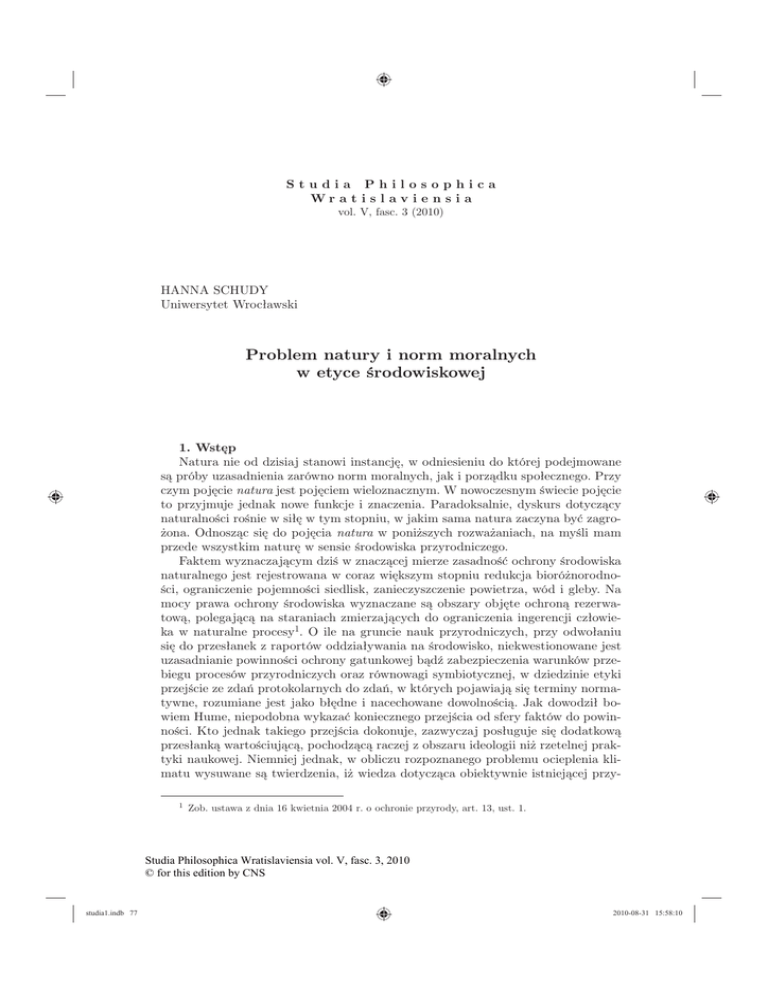 Studia Philosophica Wr a t i s l av i e n s i a vol. V, fasc. 3 (2010) HANNA SCHUDY Uniwersytet Wrocławski Problem natury i norm moralnych w etyce środowiskowej 1. Wstęp Natura nie od dzisiaj stanowi instancję, w odniesieniu do której podejmowane są próby uzasadnienia zarówno norm moralnych, jak i porządku społecznego. Przy czym pojęcie natura jest pojęciem wieloznacznym. W nowoczesnym świecie pojęcie to przyjmuje jednak nowe funkcje i znaczenia. Paradoksalnie, dyskurs dotyczący naturalności rośnie w siłę w tym stopniu, w jakim sama natura zaczyna być zagrożona. Odnosząc się do pojęcia natura w poniższych rozważaniach, na myśli mam przede wszystkim naturę w sensie środowiska przyrodniczego. Faktem wyznaczającym dziś w znaczącej mierze zasadność ochrony środowiska naturalnego jest rejestrowana w coraz większym stopniu redukcja bioróżnorodności, ograniczenie pojemności siedlisk, zanieczyszczenie powietrza, wód i gleby. Na mocy prawa ochrony środowiska wyznaczane są obszary objęte ochroną rezerwatową, polegającą na staraniach zmierzających do ograniczenia ingerencji człowieka w naturalne procesy1. O ile na gruncie nauk przyrodniczych, przy odwołaniu się do przesłanek z raportów oddziaływania na środowisko, niekwestionowane jest uzasadnianie powinności ochrony gatunkowej bądź zabezpieczenia warunków przebiegu procesów przyrodniczych oraz równowagi symbiotycznej, w dziedzinie etyki przejście ze zdań protokolarnych do zdań, w których pojawiają się terminy normatywne, rozumiane jest jako błędne i nacechowane dowolnością. Jak dowodził bowiem Hume, niepodobna wykazać koniecznego przejścia od sfery faktów do powinności. Kto jednak takiego przejścia dokonuje, zazwyczaj posługuje się dodatkową przesłanką wartościującą, pochodzącą raczej z obszaru ideologii niż rzetelnej praktyki naukowej. Niemniej jednak, w obliczu rozpoznanego problemu ocieplenia klimatu wysuwane są twierdzenia, iż wiedza dotycząca obiektywnie istniejącej przy1 Zob. ustawa z dnia 16 kwietnia 2004 r. o ochronie przyrody, art. 13, ust. 1. Studia Philosophica Wratislaviensia vol. V, fasc. 3, 2010 © for this edition by CNS studia1.indb 77 2010-08-31 15:58:10 78 H. Schudy, Problem natury i norm moralnych w etyce środowiskowej rody jest w zupełności wystarczająca do uzasadnienia powinności człowieka do działań w imieniu teraźniejszego i przyszłego stanu biosfery. Zdaje się jednak, że zakładana jest tu instrumentalna wartość przyrody, umożliwiająca jakościowe życie człowieka. Począwszy od lat 60. ubiegłego stulecia, apele o ochronę środowiska wraz z alarmistycznymi opisami stanu środowiska naturalnego stały się ważnymi, aczkolwiek dla wielu wciąż kontrowersyjnymi i nieuzasadnionymi głosami kształtującymi opinię publiczną. Niewątpliwie wpływ na recepcję miały tu katastrofy ekologiczne, takie jak chociażby wyciek rtęci nad zatoką Mina Mata, spowodowane często brakiem wyobraźni decydentów, jak i anachronicznym, acz wciąż podzielanym przekonaniem, iż przyroda jest systemem odtwarzalnym, autorekultywującym się. Wywołane katastrofy, a raczej ich katastrofalne efekty, często były zatajane, niepodawane do publicznej wiadomości. Również znaczący przedstawiciele nauk przyrodniczych, jak na przykład Edward O. Wilson, w pracach poświęconych problemom biologii, poruszając głównie kwestie wymierania gatunków, dołączali noty o stanie biosfery oraz przestrogi dla człowieka, iż „w momencie dochodzenia umysłu ludzkiego do samowiedzy [...] człowiek sam zamyka drzwi do własnej przyszłości”2. Na gruncie nauk przyrodniczych, tak jak nigdy wcześniej, zaczęły się pojawiać problemy, których obszar sugerował już nie tylko praktyczne, ale także etyczne aspekty. Pojawiły się też głosy nawołujące do takiego gospodarowania przyrodą, aby nie pozbawiać jej naturalnych własności. Środowiska przedsiębiorców, naukowców i ekologów zdysocjowały się, ukazując tym samym różnice interesów względem przyrody. Poznanie i użyteczność w nauce straciły swoją moc, dostrzeżono bowiem ciemną stronę poznania, jaką jest eksploatacja przyrody, co Wilson zilustrował słowami: „Przyszło do nas, z łaski ludzkiej, szóste w historii Ziemi wielkie wymieranie. [...] Zobaczyłem wnętrze puszczy rozcięte jak kocie oko do badań laboratoryjnych”3. W takich właśnie okolicznościach i przy podniosłym, niekiedy wręcz histerycznym tonie rodził się współczesny ruch ekologiczny. Występował on nie tylko przeciwko dewastacji środowiska, ale też proponował nową wizję relacji człowieka i natury. Nierzadko słychać było w tych apelach nutę romantyczną, co jednych inspirowało, na innych zaś — związanych często z przemysłem chemicznym i zbrojeniowym — działało jak przysłowiowa „płachta na byka”. Opór naukowców obejmował nie tylko niezgodę na przerwanie badań i eksperymentów, ale również krytykę języka, jakim posługiwali się ,,apostołowie” zagrożonej natury. Przykładem „rewolucjonistki” może być Rachel Carson, autorka głośnej książki Silent Spring4, biolog i ekolog morza. Carson uważnie śledziła rozwój przemysłu oraz wpływ człowieka na ekosystem morski, następnie przedstawiała wyniki swoich obserwacji w książkach o charakterze co prawda akademickim, podnosiła w nich jednak patetyczny głos, że działania człowieka mogą przyczynić się dzisiaj do zmiany przyrody jako 2 E.O. Wilson, Etyka środowiskowa [w:] E.O. Wilson, Różnorodność życia, tłum. J. Weiner, Warszawa 1999, s. 439. 3 Ibid., s. 441. 4 R. Carson, Silent Spring, Boston 1962. Studia Philosophica Wratislaviensia vol. V, fasc. 3, 2010 © for this edition by CNS studia1.indb 78 2010-08-31 15:58:10 Studia Philosophica Wratislaviensia V 3 (2010) 79 podstawowego warunku życia ludzi teraźniejszych oraz przyszłych pokoleń. Uczyniła to jednak z pozycji „pa
