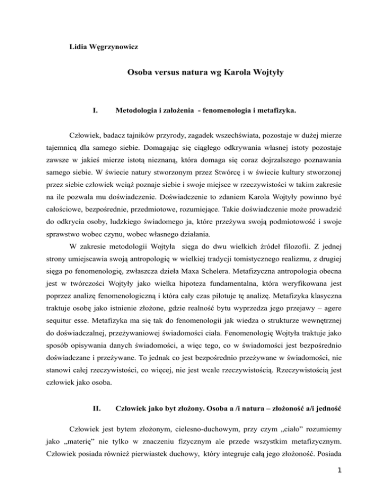 Lidia Węgrzynowicz Osoba versus natura wg Karola Wojtyły I. Metodologia i założenia - fenomenologia i metafizyka. Człowiek, badacz tajników przyrody, zagadek wszechświata, pozostaje w dużej mierze tajemnicą dla samego siebie. Domagając się ciągłego odkrywania własnej istoty pozostaje zawsze w jakieś mierze istotą nieznaną, która domaga się coraz dojrzalszego poznawania samego siebie. W świecie natury stworzonym przez Stwórcę i w świecie kultury stworzonej przez siebie człowiek wciąż poznaje siebie i swoje miejsce w rzeczywistości w takim zakresie na ile pozwala mu doświadczenie. Doświadczenie to zdaniem Karola Wojtyły powinno być całościowe, bezpośrednie, przedmiotowe, rozumiejące. Takie doświadczenie może prowadzić do odkrycia osoby, ludzkiego świadomego ja, które przeżywa swoją podmiotowość i swoje sprawstwo wobec czynu, wobec własnego działania. W zakresie metodologii Wojtyła sięga do dwu wielkich źródeł filozofii. Z jednej strony umiejscawia swoją antropologię w wielkiej tradycji tomistycznego realizmu, z drugiej sięga po fenomenologię, zwłaszcza dzieła Maxa Schelera. Metafizyczna antropologia obecna jest w twórczości Wojtyły jako wielka hipoteza fundamentalna, która weryfikowana jest poprzez analizę fenomenologiczną i która cały czas pilotuje tę analizę. Metafizyka klasyczna traktuje osobę jako istnienie złożone, gdzie realność bytu wyprzedza jego przejawy – agere sequitur esse. Metafizyka ma się tak do fenomenologii jak wiedza o strukturze wewnętrznej do doświadczalnej, przeżywaniowej świadomości ciała. Fenomenologię Wojtyła traktuje jako sposób opisywania danych świadomości, a więc tego, co w świadomości jest bezpośrednio doświadczane i przeżywane. To jednak co jest bezpośrednio przeżywane w świadomości, nie stanowi całej rzeczywistości, co więcej, nie jest wcale rzeczywistością. Rzeczywistością jest człowiek jako osoba. II. Człowiek jako byt złożony. Osoba a /i natura – złożoność a/i jedność Człowiek jest bytem złożonym, cielesno-duchowym, przy czym „ciało” rozumiemy jako „materię” nie tylko w znaczeniu fizycznym ale przede wszystkim metafizycznym. Człowiek posiada również pierwiastek duchowy, który integruje całą jego złożoność. Posiada 1 on również psychikę, której procesy nie do końca są materialne ale też nie są natury duchowej, wydają się pośredniczyć między ciałem a duchem. Wyodrębnienie wymiaru psychicznego jako autonomicznego i zarazem powiązanego zarówno z ciałem jak i z duchem pokazuje jak działają dynamizmy pośredniczące w określonym sensie między ciałem a duchem. Takie ujęcie jest zgodne z Pawłowym przedstawieniem istoty człowieka jako somapsyche-pneuma. Doświadczenie mówi też, że człowiek jest kimś jednym – jest osobą. To poczucie jedności i ciągłości tożsamości, czyli poczucie „Ja” wskazuje na nadrzędność osoby w człowieku jako odrębnego indywiduum i niejako podrzędność natury jako faktu dotyczącego pierwiastka człowieczeństwa w ogóle. Ze względu na te dwa wymiary istnienia – naturę i osobę, człowiek jawi się jako ktoś, kto siebie posiada (osoba) i jednocześnie jest posiadany ( natura). Jako ktoś kto sobie-panuje i jako ten kto sobie samemu jest poddany. Ten aspekt osobowego panowania Wojtyła nazywa transcendencją, jest on ściśle związany z wolną wolą osoby. Aspekt bycia poddanym sobie i bycia samoposiadanym to aspekt integracji. Oba aspekty – transcendencja i integracja - są komplementarne i stanowią o jedności osoby. Rozważając stosunek osoby do natury Wojtyła zwraca uwagę na sprawstwo i podmiotowość działania. Osoba jest zawsze sprawcą działania (operari, agere) a działanie to musi być świadome i wynikać z wolnej woli, nosi wtedy znamiona actus personea. Człowiek przeżywa wtedy siebie jako sprawcę aktu dzięki refleksywnej stronie świadomości. Człowiek przeżywa również siebie jako podmiot działań, doświadcza tego wszystkiego co się w nim dzieje. Dzianie się, bierność, pati jest domeną natury. Jeżeli sprawczość jest polem ujawniania się transcendencji, to podmiotowość – integracji. III. Natura człowieka Natura jawi się na poziomie somatyczno-psychicznych dynamizmów człowieka jako fenomen nie-ujednostkowiony choć realny, jest wspólna wszystkim ludziom. Natura pozbawiona jest pierwiastka samostanowienia czyli elementu wolności. Procesy zachodzące na poziomie natury charakteryzują się biernością, jest to tak zwane „dzianie się w człowieku”.. Człowiek odczuwając owo dzianie się staje się podmiotem. Złożoność psychosomatyczna charakteryzuje się procesem integracji, który jest podstawą jedności owej złożoności (psyche –soma). 2 1. Somatyka Człowiek będąc podmiotem odczuć wynikających z natury, zwłaszcza ze sfery somatycznej, doznaje swojej bierności wobec nich.. Biologiczność ciała jako organizmu, nie podlega procesom świadomym i wolnej woli lecz jest zdeterminowana. Na poziomie cielesności samo istnienie jest już zasadniczą wartością. Skutkuje to zwykle uprzedmiotowieniem ciała, gdyż człowiek tak rozumiany nie jest swoim ciałem, lecz je posiada. Afirmacja ciała dochodzi do głosu wraz z jego psychicznym upodmiotowieniem, staje się ono środkiem i podstawą ekspresji osoby, a nie samą osobą ale integracja ciała i procesów psychicznych stanowi podstawę ujawnia się osoby w jej transcendencji. W doświadczeniu „coś dzieje się w człowieku” człowiek jest bierny, sprawczość osoby jest nieobecna choć ciało jest dla osoby terenem i środkiem ekspresji. Poziom integracji ciała nie rzutuje jednak na osobę w tak szerokim znaczeniu, gdyż człowiek zdezintegrowany somatycznie może przejawiać bardzo wysoko rozwiniętą transcendencję a zatem być bardzo wartościową osobą. 2. Psychika Psychika stanowi podmiotowe „ja” osoby, a zatem podlega posiad