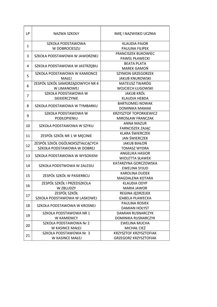 LP NAZWA SZKOŁY IMIĘ I NAZWISKO UCZNIA 1 SZKOŁA PODSTAWOWA W DOBROCIESZU 3 SZKOŁA PODSTAWOWA W JAWORZNEJ 4 SZKOŁA PODSTAWOWA W JASTRZĘBIU KLAUDIA PAJOR PAULINA FILIPEK FRANCISZEK BUKOWIEC PAWEŁ PŁAWECKI BEATA PLATA MAREK GAMOŃ SZYMON GRZEGORZEK JAKUB KNUROWSKI MATEUSZ TWARÓG WOJCIECH ŁUGOWSKI JAKUB KRÓL KLAUDIA HEBDA BARTŁOMIEJ NOWAK DOMINIKA MAMAK KRZYSZTOF TOPORKIEWICZ MIROSŁAW FRANCZAK ANNA MAZUR FARNCISZEK ZAJĄC KLARA ŚWIERCZEK JAN ŚWIERCZEK JAKUB BIAŁOŃ TOMASZ WYDRA ANGELIKA HASIOR WIOLETTA SŁAWEK KATARZYNA GORCZOWSKA EWELINA SYJUD KAROLINA DUDEK MAGDALENA KOTARA KLAUDIA ODYP MARIA JAWOR REGINA JĘDRZEJEK IZABELA PŁAWECKA PAULINA ROSIEK DAMIAN HOŁYST DAMIAN RUSNARCZYK DOMINIKA RUSNARCZYK EWELINA MUCHA MICHAŁ CIEŻ KRZYSZTOF KRZYSZTOFIAK GRZEGORZ KRZYSZTOFIAK 5 6 7 SZKOŁA PODSTAWOWA W KAMIONCE MAŁEJ ZESPÓŁ SZKÓŁ SAMORZĄDOWYCH NR 4 W LIMANOWEJ SZKOŁA PODSTAWOWA W SIEKIERCZYNIE 8 SZKOŁA PODSTAWOWA W TYMBARKU 9 SZKOŁA PODSTAWOWA W PODŁOPIENIU 10 SZKOŁA PODSTAWOWA W SZYKU 11 ZESPÓŁ SZKÓŁ NR 1 W MĘCINIE 12 ZESPÓŁ SZKÓŁ OGÓLNOKSZTAŁCĄCYCH SZKOŁA PODSTAWOWA W DOBREJ 13 SZKOŁA PODSTAWOWA W WYSOKIEM 14 SZKOŁA PODSTWOWA W ZALESIU 15 ZESPÓŁ SZKÓŁ W PASIERBCU 16 17 18 19 20 21 ZESPÓŁ SZKÓŁ I PRZEDSZKOLA W ZBLUDZY ZESPÓŁ SZKÓŁ SZKOŁA PODSTAWOWA W LASKOWEJ SZKOŁA PODSTAWOWA W KROSNEJ SZKOŁA PODSTAWOWA NR 1 W KAMIENICY SZKOŁA PODSTAWOWA Nr 2 W KASINCE MAŁEJ SZKOŁA PODSTAWOWA Nr 3 W KASINCE MAŁEJ