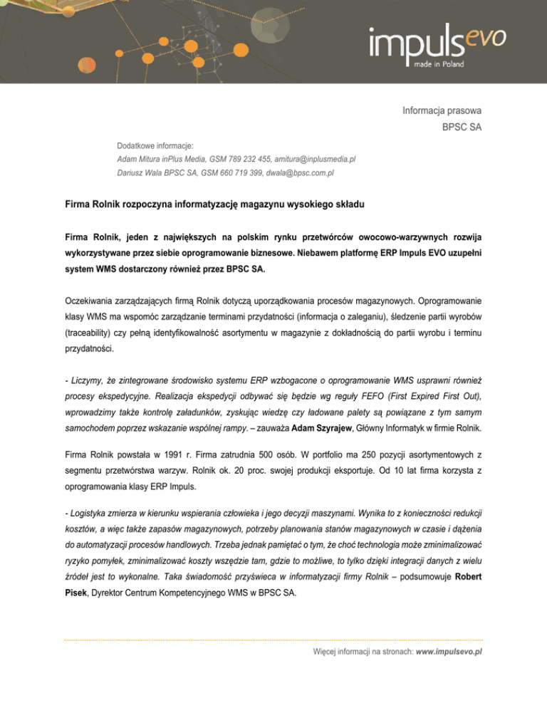 Informacja prasowa BPSC SA Dodatkowe informacje: Adam Mitura inPlus Media, GSM 789 232 455, [email protected] Dariusz Wala BPSC SA, GSM 660 719 399, [email protected] Firma Rolnik rozpoczyna informatyzację magazynu wysokiego składu Firma Rolnik, jeden z największych na polskim rynku przetwórców owocowo-warzywnych rozwija wykorzystywane przez siebie oprogramowanie biznesowe. Niebawem platformę ERP Impuls EVO uzupełni system WMS dostarczony również przez BPSC SA. Oczekiwania zarządzających firmą Rolnik dotyczą uporządkowania procesów magazynowych. Oprogramowanie klasy WMS ma wspomóc zarządzanie terminami przydatności (informacja o zaleganiu), śledzenie partii wyrobów (traceability) czy pełną identyfikowalność asortymentu w magazynie z dokładnością do partii wyrobu i terminu przydatności. - Liczymy, że zintegrowane środowisko systemu ERP wzbogacone o oprogramowanie WMS usprawni również procesy ekspedycyjne. Realizacja ekspedycji odbywać się będzie wg reguły FEFO (First Expired First Out), wprowadzimy także kontrolę załadunków, zyskując wiedzę czy ładowane palety są powiązane z tym samym samochodem poprzez wskazanie wspólnej rampy. – zauważa Adam Szyrajew, Główny Informatyk w firmie Rolnik. Firma Rolnik powstała w 1991 r. Firma zatrudnia 500 osób. W portfolio ma 250 pozycji asortymentowych z segmentu przetwórstwa warzyw. Rolnik ok. 20 proc. swojej produkcji eksportuje. Od 10 lat firma korzysta z oprogramowania klasy ERP Impuls. - Logistyka zmierza w kierunku wspierania człowieka i jego decyzji maszynami. Wynika to z konieczności redukcji kosztów, a więc także zapasów magazynowych, potrzeby planowania stanów magazynowych w czasie i dążenia do automatyzacji procesów handlowych. Trzeba jednak pamiętać o tym, że choć technologia może zminimalizować ryzyko pomyłek, zminimalizować koszty wszędzie tam, gdzie to możliwe, to tylko dzięki integracji danych z wielu źródeł jest to wykonalne. Taka świadomość przyświeca w informatyzacji firmy Rolnik – podsumowuje Robert Pisek, Dyrektor Centrum Kompetencyjnego WMS w BPSC SA. Więcej informacji na stronach: www.impulsevo.pl ### BPSC SA zajmuje się projektowaniem i wdrażaniem systemów informatycznych wspomagających zarządzanie przedsiębiorstwem. Sztandarowym produktem firmy jest zintegrowany pakiet klasy MRPII/ERP Impuls EVO. System należy w tej chwili do ścisłej czołówki oferowanych na rynku rozwiązań tej klasy. Dzięki swojej kompleksowości i elastyczności kolejne rozwiązania klasy ERP wykorzystywane są przez ponad 600 średnich i dużych przedsiębiorstw z różnych sektorów gospodarki. Firma zatrudnia ponad 240 osób - najwyższej klasy specjalistów w doskonały sposób łączących wiedzę na temat nowych technologii ze znajomością potrzeb współczesnych przedsiębiorstw. Wśród klientów BPSC są m.in. wybrane przedsiębiorstwa Grupy Tauron Polska Energia, Kler, BIG – STAR, StalexportTransroute Autostrada, CTL Logistics, Organika, Selena, Matras, Grupa Sokołów, Sokpol, OSM Piątnica, WSP Społem Kielce. Więcej informacji na stronach: www.impulsevo.pl