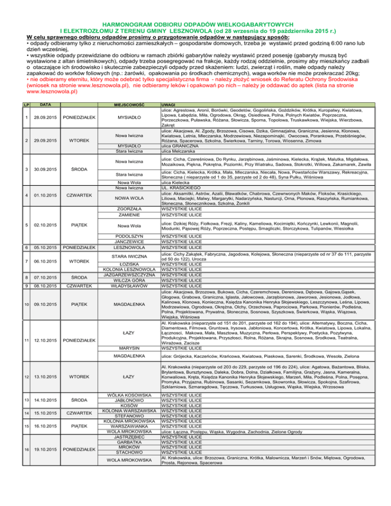 HARMONOGRAM ODBIORU ODPADÓW WIELKOGABARYTOWYCH I ELEKTROZŁOMU Z TERENU GMINY LESZNOWOLA (od 28 wrzesnia do 19 października 2015 r.) W celu sprawnego odbioru odpadów prosimy o przygotowanie odpadów w następujący sposób: • odpady odbieramy tylko z nieruchomości zamieszkałych – gospodarstw domowych, trzeba je wystawić przed godziną 6:00 rano lub dzień wcześniej, • wszystkie odpady przewidziane do odbioru w ramach zbiórki gabarytów należy wystawić przed posesję (gabaryty muszą być wystawione z altan śmietnikowych), odpady trzeba posegregować na frakcje, każdy rodzaj oddzielnie, prosimy aby mieszkańcy zadbali o otaczające ich środowisko i skutecznie zabezpieczyli odpady przed skażeniem: ludzi, zwierząt i roślin, małe odpady należy zapakować do worków foliowych (np.: żarówki, opakowania po środkach chemicznych), waga worków nie może przekraczać 20kg; • nie odbieramy eternitu, który może odebrać tylko specjalistyczna firma - należy złożyć wniosek do Referatu Ochrony Środowiska (wniosek na stronie www.lesznowola.pl), nie odbieramy leków i opakowań po nich – należy je oddawać do aptek (lista na stronie www.lesznowola.pl) MIEJSCOWOŚĆ LP DATA 1 28.09.2015 PONIEDZIAŁEK 2 29.09.2015 WTOREK MYSIADŁO Nowa Iwiczna MYSIADŁO Stara Iwiczna Nowa Iwiczna 3 30.09.2015 ŚRODA Stara Iwiczna Nowa Wola Nowa Iwiczna 4 01.10.2015 CZWARTEK NOWA WOLA ZGORZAŁA ZAMIENIE 5 02.10.2015 PIĄTEK Nowa Wola PODOLSZYN JANCZEWICE LESZNOWOLA 6 05.10.2015 PONIEDZIAŁEK 7 06.10.2015 WTOREK 8 07.10.2015 ŚRODA 9 08.10.2015 CZWARTEK ŁOZISKA KOLONIA LESZNOWOLA JAZGARZEWSZCZYZNA WILCZA GÓRA WŁADYSŁAWÓW 10 09.10.2015 PIĄTEK MAGDALENKA 11 12.10.2015 PONIEDZIAŁEK STARA IWICZNA ŁAZY MARYSIN MAGDALENKA 12 13.10.2015 WTOREK 13 14.10.2015 ŚRODA 14 15.10.2015 CZWARTEK 15 16.10.2015 PIĄTEK 16 19.10.2015 PONIEDZIAŁEK ŁAZY WÓLKA KOSOWSKA JABŁONOWO KOSÓW KOLONIA WARSZAWSKA STEFANOWO KOLONIA MROKOWSKA WARSZAWIANKA WOLA MROKOWSKA JASTRZĘBIEC GARBATKA MROKÓW STACHOWO WOLA MROKOWSKA UWAGI ulice: Agrestowa, Aronii, Borówki, Geodetów, Gogolińska, Goździków, Krótka, Kuropatwy, Kwiatowa, Lipowa, Łabędzia, Miła, Ogrodowa, Okrąg, Osiedlowa, Polna, Polnych Kwiatów, Poprzeczna, Porzeczkowa, Puławska, Różana, Słowicza, Sporna, Topolowa, Truskawkowa, Wiejska, Wierzbowa, Zakręt ulice: Akacjowa, Al. Zgody, Brzozowa, Cisowa, Dzika, Gimnazjalna, Graniczna, Jesienna, Klonowa, Kwiatowa, Letnia, Mleczarska, Modrzewiowa, Niezapominajki, Owocowa, Porankowa, Przebiśniegów, Różana, Spacerowa, Szkolna, Świerkowa, Tarniny, Torowa, Wiosenna, Zimowa ulica GRANICZNA ulica Melczarska ulice: Cicha, Czereśniowa, Do Rynku, Jarzębinowa, Jaśminowa, Kielecka, Krążek, Malutka, Migdałowa, Mozaikowa, Piękna, Pokrętna, Poziomki, Przy Wiatraku, Sadowa, Stokrotki, Willowa, Zakamarek, Zawiła ulice: Cicha, Kielecka, Krótka, Mała, Mleczarska, Niecała, Nowa, Powstańców Warszawy, Rekreacyjna, Słoneczna ( nieparzyste od 1 do 35, parzyste od 2 do 48), Syna Pułku, Wiśniowa ulica Kielecka UL. KRASICKIEGO ulice: Aksamitki, Astrów, Azalii, Bławatków, Chabrowa, Czewrwonych Maków, Floksów, Krasickiego, Liliowa, Maciejki, Malwy, Margarytki, Nadarzyńska, Nasturcji, Orna, Plonowa, Raszyńska, Rumiankowa, Słoneczna, Słonecznikowa, Szkolna, Żonkili WSZYSTKIE ULICE WSZYSTKIE ULICE ulice: Dzikiej Róży, Fiołkowa, Frezji, Kaliny, Kameliowa, Kocimiętki, Kończynki, Lewkonii, Magnolii, Miodunki, Pąsowej Róży, Poprzeczna, Postępu, Smagliczki, Storczykowa, Tulipanów, Wiesiołka WSZYSTKIE ULICE WSZYSTKIE ULICE WSZYSTKIE ULICE ulice: Cichy Zakątek, Fabryczna, Jagodowa, Kolejowa, Słoneczna (nieparzyste od nr 37 do 111, parzyste od 50 do 122), Urocza WSZYSTKIE ULICE WSZYSTKIE ULICE WSZYSTKIE ULICE WSZYSTKIE ULICE WSZYSTKIE ULICE ulice: Akacjowa, Brzozowa, Bukowa, Cicha, Czeremchowa, Dereniowa, Dębowa, Gajowa,Gąsek, Głogowa, Grabowa, Graniczna, Iglasta, Jałowcowa, Jarzębionowa, Jaworowa, Jesionowa, Jodłowa, Kalinowa, Klonowa, Konieczna, Księdza Kanonika Henryka Słojewskiego, Leszczynowa, Leśna, Lipowa, Modrzewiowa, Ogrodowa, Okrężna, Olchy, Orzechowa, Paprociowa, Parkowa, Pionierów, Podleśna, Polna, Projektowana, Prywatna, Słoneczna, Sosnowa, Szyszkowa, Świerkowa, Wąska, Wiązowa, Wiejska, Wiśniowa Al. Krakowska (nieparzyste od 151 do 201, parzyste od 162 do 194), ulice: Alternatywy, Boczna, Cicha, Diamentowa, Filmowa, Gruntowa, Irysowa, Jabłoniowa, Koncertowa, Krótka, Kwiatowa, Lipowa, Lokalna, Łącznosci, Makowa, Mała, Masztowa, Muzyczna, Perłowa, Perspektywy, Poetycka, Pozytwyna, Produkcyjna, Projektowana, Przyszłosci, Rolna, Różana, Skrajna, Sosnowa, Srodkowa, Teatralna, Wirażowa, Zacisze WSZYSTKIE ULICE ulice: Grójecka, Kaczeńców, Krańcowa, Kwiatowa, Piaskowa, Sarenki, Środkowa, Wesoła, Zielona Al. Krakowska (nieparzyste od 203 do 229, parzyste od 196 do 224), ulice: Agatowa, Bażantowa, Bliska, Brylantowa, Bursztynowa, Daleka, Dobra, Dolna, Działkowa, Familijna, Grażyny, Jasna, Kameralna, Konwaliowa, Kręta, Księdza Kanonika Henryka Słojewskiego, Marzeń, Miła, Podleśna, Polna, Posępna, Promyka, Przyjazna, Rubinowa, Sasanki, Sezamkowa, Skowronka, Słowicza, Spokojna, Szafirowa, Szklarniowa, Szmaragdowa, Tęczowa, Turkusowa, Usługowa, Wąska, Wiejska, Wrzosowa WSZYSTKIE ULICE WSZYSTKIE ULICE WSZYSTKIE ULICE WSZYSTKIE ULICE WSZYSTKIE ULICE WSZYSTKIE ULICE WSZYSTKIE ULICE ulice: Łączna, Postępu, Wąska, Wygodna, Zachodnia, Zielone Ogrody WSZYSTKIE ULICE WSZYSTKIE ULICE WSZYSTKIE ULICE WSZYSTKIE ULICE Al. Krakowska, ulice: Brzozowa, Graniczna, Krótka, Malownicza, Marzeń i Snów, Miętowa, Ogrodowa, Prosta, Rejonowa, Spacerowa