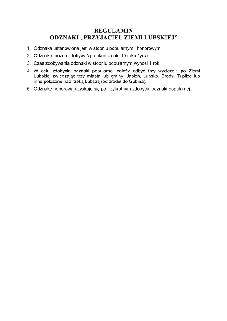 REGULAMIN ODZNAKI „PRZYJACIEL ZIEMI LUBSKIEJ” 1. Odznaka ustanowiona jest w stopniu popularnym i honorowym. 2. Odznakę można zdobywać po ukończeniu 10 roku życia. 3. Czas zdobywania odznaki w stopniu popularnym wynosi 1 rok. 4. W celu zdobycia odznaki popularnej należy odbyć trzy wycieczki po Ziemi Lubskiej zwiedzając trzy miasta lub gminy: Jasień, Lubsko, Brody, Tuplice lub inne położone nad rzeką Lubszą (od źródeł do Gubina). 5. Odznakę honorową uzyskuje się po trzykrotnym zdobyciu odznaki popularnej.