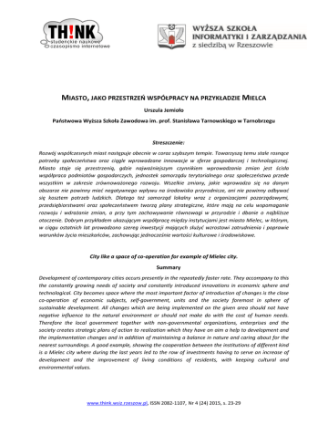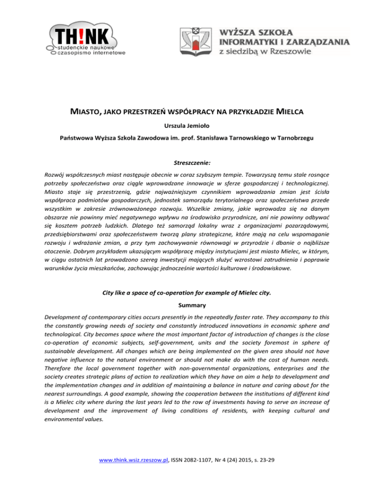 MIASTO, JAKO PRZESTRZEŃ WSPÓŁPRACY NA PRZYKŁADZIE MIELCA Urszula Jemioło Państwowa Wyższa Szkoła Zawodowa im. prof. Stanisława Tarnowskiego w Tarnobrzegu Streszczenie: Rozwój współczesnych miast następuje obecnie w coraz szybszym tempie. Towarzyszą temu stale rosnące potrzeby społeczeństwa oraz ciągle wprowadzane innowacje w sferze gospodarczej i technologicznej. Miasto staje się przestrzenią, gdzie najważniejszym czynnikiem wprowadzania zmian jest ścisła współpraca podmiotów gospodarczych, jednostek samorządu terytorialnego oraz społeczeństwa przede wszystkim w zakresie zrównoważonego rozwoju. Wszelkie zmiany, jakie wprowadza się na danym obszarze nie powinny mieć negatywnego wpływu na środowisko przyrodnicze, ani nie powinny odbywać się kosztem potrzeb ludzkich. Dlatego też samorząd lokalny wraz z organizacjami pozarządowymi, przedsiębiorstwami oraz społeczeństwem tworzą plany strategiczne, które mają na celu wspomaganie rozwoju i wdrażanie zmian, a przy tym zachowywanie równowagi w przyrodzie i dbanie o najbliższe otoczenie. Dobrym przykładem ukazującym współpracę między instytucjami jest miasto Mielec, w którym, w ciągu ostatnich lat prowadzono szereg inwestycji mających służyć wzrostowi zatrudnienia i poprawie warunków życia mieszkańców, zachowując jednocześnie wartości kulturowe i środowiskowe. City like a space of co-operation for example of Mielec city. Summary Development of contemporary cities occurs presently in the repeatedly faster rate. They accompany to this the constantly growing needs of society and constantly introduced innovations in economic sphere and technological. City becomes space where the most important factor of introduction of changes is the close co-operation of economic subjects, self-government, units and the society foremost in sphere of sustainable development. All changes which are being implemented on the given area should not have negative influence to the natural environment or should not make do with the cost of human needs. Therefore the local government together with non-governmental organizations, enterprises and the society creates strategic plans of action to realization which they have on aim a help to development and the implementation changes and in addition of maintaining a balance in nature and caring about for the nearest surroundings. A good example, showing the cooperation between the institutions of different kind is a Mielec city where during the last years led to the row of investments having to serve an increase of development and the improvement of living conditions of residents, with keeping cultural and environmental values. www.think.wsiz.rzeszow.pl, ISSN 2082-1107, Nr 4 (24) 2015, s. 23-29 Miasto, jako przestrzeń współpracy na przykładzie Mielca Wprowadzenie Obecnie źródło siły napędzającej rozwój miast upatruje się w wymianie dóbr i usług. Ma ona miejsce nie tylko na obszarze lokalnym, czy krajowym, ale przyjmuje także skalę międzynarodową. Towarzyszy temu realizacja działań gospodarczych oraz zaspokajanie potrzeb społecznych. Samorząd lokalny odgrywa najważniejszą rolę, w zakresie planowania rozwoju miasta. To właśnie na szczeblu lokalnym rozwiązywane są podstawowe problemy społeczno-gospodarcze danej jednostki terytorialnej i zagwarantowane jest pierwszeństwo interesu ogólnospołecznego nad indywidualnym1. Celem niniejszego tekstu jest przedstawienie mieleckiej współpracy podmiotów gospodarczych ze społeczeństwem oraz samorządem lokalnym w zakresie zrównoważonego rozwoju. 1. Wyjaśnienie podstawowych znaczeń przestrzeni, zrównoważonego rozwoju i jego elementów Najprostsza definicja rozwoju mówi, że jest to długofalowy proces zmian i przekształceń. Dotyczą one przemian od stanu prostego w bardziej złożony. Inaczej rozwój można określić, jako przejście z poziomu podstawowego na bardziej innowacyjny. Rozwój może dotyczyć wielu sfer. Wyróżnia się rozwój człowieka obejmujący rozwój fizyczny, psychiczny i społeczny, a także rozwój wykraczający poza jednostkę: gospodarczy i technologiczny. Poprzez zrównoważony rozwój rozumie się rozwój społeczno-gospodarczy, w którym następuje proces tworzenia zwartej całości z działań politycznych, gospodarczych i społecznych, z zachowaniem równowagi w przyrodzie oraz trwałości podstawowych procesów w niej zachodzących, w celu zagwarantowania możliwości zaspokajania podstawowych potrzeb poszczególnych społeczności lub obywateli zarówno współczesnego pokolenia, jak i przyszłych pokoleń2. Wszelkie zmiany, jakie wprowadza się w sferze gospodarczej, społecznej lub politycznej nie powinny mieć negatywnego wpływu na środowisko przyrodnicze i nie powinny odbywać się kosztem potrzeb ludzkich. Już z samej formuły zrównoważonego rozwoju wywnioskować można, że elementami, które wchodzą w jego skład są: społeczeństwo, gospodarka, środowisko oraz przestrzeń. Jedną z ważniejszych przestrzeni, na której można zauważyć kooperację podmiotów dążących do ciągłego rozwoju jest przestrzeń miasta. To fragment większej przestrzeni, który przez sposób swojego urządzenia oraz lokalizację w strukturze urbanistycznej jest przeznaczony na potrzeby realizacji bezpośrednich kontaktów między społeczeństwem, władzami lokalnymi oraz przedsiębiorcami, pozostając jednocześnie dostępnym dla wszystkich innych podmiotów. Przestrzeń miasta ulega nieustannym przekształceniom, mającym swoją genezę w zjawisku globalizacji, rozwoju społeczeństwa konsumpcyjnego oraz nowych formach współpracy pomiędzy sektorem publicznym a prywatnym. 2. Rola władz lokalnych w rozwoju miasta Władzę lokalną miasta stanowi samorząd lokalny. To w jego kompetencjach leży podejmowanie decyzji dotyczących danego miasta, powiatu lub gminy. Do jego zadań należy strategiczne planowanie rozwoju, wydawanie lokalnych aktów prawnych, a