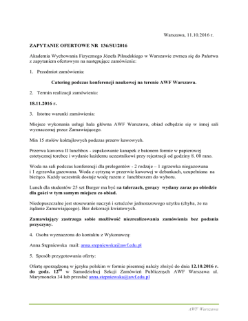 Warszawa, 11.10.2016 r. ZAPYTANIE OFERTOWE NR 136/SU/2016 Akademia Wychowania Fizycznego Józefa Piłsudskiego w Warszawie zwraca się do Państwa z zapytaniem ofertowym na następujące zamówienie: 1. Przedmiot zamówienia: Catering podczas konferencji naukowej na terenie AWF Warszawa. 2. Termin realizacji zamówienia: 18.11.2016 r. 3. Istotne warunki zamówienia: Miejsce wykonania usługi hala główna AWF Warszawa, obiad odbędzie się w innej sali wyznaczonej przez Zamawiającego. Min 15 stołów koktajlowych podczas przerw kawowych. Przerwa kawowa II lunchbox - zapakowanie kanapek z batonem formie w papierowej estetycznej torebce i wydanie każdemu uczestnikowi przy rejestracji od godziny 8. 00 rano. Woda na sali podczas konferencji dla prelegentów - 2 rodzaje – 1 zgrzewka niegazowana i 1 zgrzewka gazowana. Woda z cytryną w przerwie kawowej w dzbankach, uzupełniana na bieżąco. Każdy uczestnik dostaje wodę razem z lunchboxem do wyboru. Lunch dla studentów 25 szt Burger ma być na talerzach, gorący wydany zaraz po obiedzie dla gości w tym samym miejscu co obiad. Niedopuszczalne jest stosowanie naczyń i sztućców jednorazowego użytku (chyba, że na żądanie Zamawiającego). Bez dekoracji kwiatowych. Zamawiający zastrzega sobie możliwość niezrealizowania zamówienia bez podania przyczyny. 4. Osoba wyznaczona do kontaktu z Wykonawcą: Anna Stępniewska mail: [email protected] 5. Sposób przygotowania oferty: Ofertę sporządzoną w języku polskim w formie pisemnej należy złożyć do dnia 12.10.2016 r. do godz. 1200 w Samodzielnej Sekcji Zamówień Publicznych AWF Warszawa ul. Marymoncka 34 lub przesłać [email protected] AWF Warszawa OFERTA DO ZAPYTANIA OFERTOWEGO NR 136/SU/2016 Firma ........................................................................................................................................... Adres ............................................................................................................................................ ........................................................................................................................................... telefon , –mail ................................................................................................................... Przedmiot zamówienia I Przerwa kawowa - różne rodzaje kruchych ciasteczek, kawa, mleczko, herbata, cytryna, dzbanki wody z cytryną II Przerwa kawowa - jak wyżej oraz - lunchbox: Kanapka (np. ciabata, paluch z ziarnami, minibagietka z sałatą, ogórkiem, rzodkiewką, papryką, wędliną, serem i/lub pastami (minimum 3 dodatki owoce: jabłko, banan baton typu „musli” butelka wody (do wyboru gazowana i niegazowana 0,5l) Obiad („stół szwedzki”) zupa: - krem z pomidorów z cieciorką i parmezanem drugie danie do wyboru: - dorsz na parze w jakimś sosie (np. koperkowym, prowansalskim …), warzywa na parze, opiekane ziemniaki, ryż - pierogi ze szpinakiem, mozzarellą i suszonymi pomidorami Liczba osób Wartość za jedną osobę netto Wartość netto Stawka podatku VAT Wartość brutto 300 8 i 23% 300 60 8 i 23% 35 150szt - mix sałat deser: szarlotka napoje: kawa, herbata, woda z cytryną w dzbankach 35 lunch dla studentów: Amerykański hamburger wołowy podany z domowymi frytkami lub Spaghetti Bolognese napoje: coca-cola, sok pomarańczowy 25 RAZEM 8 i 23% 8 i 23% AWF Warszawa 8 i 23% RAZEM Wersja 30 stolików koktajlowych Uwaga: Nie dysponujemy specjalnym pomieszczeniem do przygotowywania posiłków ……………………………………….. Pieczątka i podpis Wykonawcy AWF Warszawa
