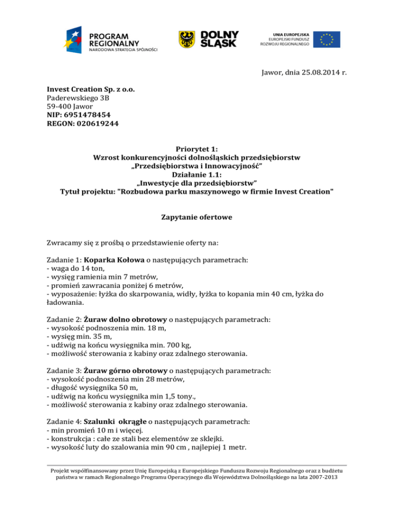 Jawor, dnia 25.08.2014 r. Invest Creation Sp. z o.o. Paderewskiego 3B 59-400 Jawor NIP: 6951478454 REGON: 020619244 Priorytet 1: Wzrost konkurencyjności dolnośląskich przedsiębiorstw „Przedsiębiorstwa i Innowacyjność” Działanie 1.1: „Inwestycje dla przedsiębiorstw” Tytuł projektu: "Rozbudowa parku maszynowego w firmie Invest Creation" Zapytanie ofertowe Zwracamy się z prośbą o przedstawienie oferty na: Zadanie 1: Koparka Kołowa o następujących parametrach: - waga do 14 ton, - wysięg ramienia min 7 metrów, - promień zawracania poniżej 6 metrów, - wyposażenie: łyżka do skarpowania, widły, łyżka to kopania min 40 cm, łyżka do ładowania. Zadanie 2: Żuraw dolno obrotowy o następujących parametrach: - wysokość podnoszenia min. 18 m, - wysięg min. 35 m, - udźwig na końcu wysięgnika min. 700 kg, - możliwość sterowania z kabiny oraz zdalnego sterowania. Zadanie 3: Żuraw górno obrotowy o następujących parametrach: - wysokość podnoszenia min 28 metrów, - długość wysięgnika 50 m, - udźwig na końcu wysięgnika min 1,5 tony., - możliwość sterowania z kabiny oraz zdalnego sterowania. Zadanie 4: Szalunki okrągłe o następujących parametrach: - min promień 10 m i więcej. - konstrukcja : całe ze stali bez elementów ze sklejki. - wysokość luty do szalowania min 90 cm , najlepiej 1 metr. Projekt współfinansowany przez Unię Europejską z Europejskiego Funduszu Rozwoju Regionalnego oraz z budżetu państwa w ramach Regionalnego Programu Operacyjnego dla Województwa Dolnośląskiego na lata 2007-2013 Zadanie 5: Agregat prądotwórczy o następujących parametrach: Agregat Prądotwórczy o obniżonym poziomie hałasu • moc min. 120 kVA • Napięcie 231/400 V • Prąd min. 170 A • Poziom hałasu max. 75 dB w odległości 7 m • Zasilany silnikiem wysokoprężnym Termin i miejsce wykonania zamówienia: do 30.09.2014 r., Złożona oferta powinna zawierać co najmniej: - Nazwę i adres oferenta, - Opis nawiązujący do parametrów wyszczególnionych w zapytaniu ofertowym, - Warunki płatności - Termin ważności oferty Zamawiający nie dopuszcza składnia ofert cząstkowych na poszczególne zadania. Zamawiający dopuszcza sprzęt używany. Termin składania ofert upływa w dniu: 01.09.2014 r. o godz. 16:00 Miejsce składania ofert: - osobiście lub pocztą na adres: Invest Creation Sp. z o.o., Paderewskiego 3B, 59-400 Jawor - mailem na adres: [email protected] Wybór najkorzystniejszej oferty nastąpi w oparciu o następujące kryteria: cena - 100 % Jeżeli w określonym terminie nie wpłynie żadna oferta lub wpłynie/wpłyną mniej niż dwie ważne oferty, zostanie unieważnione to postępowanie ofertowe i przeprowadzone ponowne. Z poważaniem Zarząd Projekt współfinansowany przez Unię Europejską z Europejskiego Funduszu Rozwoju Regionalnego oraz z budżetu państwa w ramach Regionalnego Programu Operacyjnego dla Województwa Dolnośląskiego na lata 2007-2013