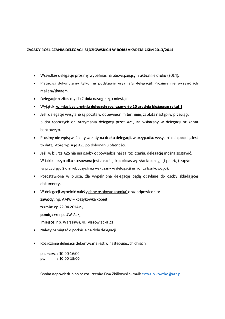ZASADY ROZLICZANIA DELEGACJI SĘDZIOWSKICH W ROKU AKADEMICKIM 2013/2014 Wszystkie delegacje prosimy wypełniać na obowiązującym aktualnie druku (2014). Płatności dokonujemy tylko na podstawie oryginału delegacji! Prosimy nie wysyłać ich mailem/skanem. Delegacje rozliczamy do 7 dnia następnego miesiąca. Wyjątek: w miesiącu grudniu delegacje rozliczamy do 20 grudnia bieżącego roku!!! Jeśli delegacje wysyłane są pocztą w odpowiednim terminie, zapłata nastąpi w przeciągu 3 dni roboczych od otrzymania delegacji przez AZS, na wskazany w delegacji nr konta bankowego. Prosimy nie wpisywać daty zapłaty na druku delegacji, w przypadku wysyłania ich pocztą. Jest to data, którą wpisuje AZS po dokonaniu płatności. Jeśli w biurze AZS nie ma osoby odpowiedzialnej za rozliczenia, delegację można zostawić. W takim przypadku stosowana jest zasada jak podczas wysyłania delegacji pocztą ( zapłata w przeciągu 3 dni roboczych na wskazany w delegacji nr konta bankowego). Pozostawione w biurze, źle wypełnione delegacje będą odsyłane do osoby składającej dokumenty. W delegacji wypełnić należy dane osobowe (ramka) oraz odpowiednio: zawody: np. AMW – koszykówka kobiet, termin: np.22.04.2014 r., pomiędzy: np. UW-ALK, miejsce: np. Warszawa, ul. Mazowiecka 21. Należy pamiętać o podpisie na dole delegacji. Rozliczanie delegacji dokonywane jest w następujących dniach: pn. –czw. : 10:00-16:00 pt. : 10:00-15:00 Osoba odpowiedzialna za rozliczenia: Ewa Ziółkowska, mail: [email protected]
