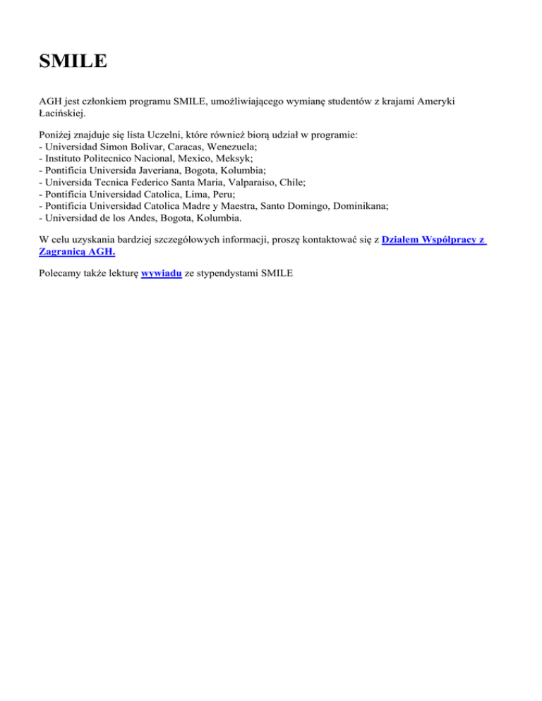 SMILE AGH jest członkiem programu SMILE, umożliwiającego wymianę studentów z krajami Ameryki Łacińskiej. Poniżej znajduje się lista Uczelni, które również biorą udział w programie: - Universidad Simon Bolivar, Caracas, Wenezuela; - Instituto Politecnico Nacional, Mexico, Meksyk; - Pontificia Universida Javeriana, Bogota, Kolumbia; - Universida Tecnica Federico Santa Maria, Valparaiso, Chile; - Pontificia Universidad Catolica, Lima, Peru; - Pontificia Universidad Catolica Madre y Maestra, Santo Domingo, Dominikana; - Universidad de los Andes, Bogota, Kolumbia. W celu uzyskania bardziej szczegółowych informacji, proszę kontaktować się z Działem Współpracy z Zagranicą AGH. Polecamy także lekturę wywiadu ze stypendystami SMILE