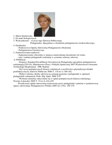 1. Maria Stachowska 2. Dr nauk biologicznych 3. Wykształcenie – wyższe mgr Zdrowia Publicznego Pielęgniarka- Specjalista w dziedzinie pielęgniarstwa środowiskowego, 4. Dydaktyka: - Podstawowa Opieka Zdrowotna-Pielęgniarstwo Rodzinne - Pielęgniarstwo Geriatryczne 5. Zainteresowania naukowe: - funkcjonowanie człowieka w miejscu zamieszkania niezależnie od wieku. - rola i zadania pielęgniarki rodzinnej w systemie ochrony zdrowia. 6. Publikacje - Krajowy Standard Kwalifikacji Zawodowych-Pielęgniarka specjalista pielęgniarstwa rodzinnego(224118), Ministerstwo Pracy i Polityki Społecznej 2007,Wydawnictwo Instytutu Technologii Eksploatacji - PIB, Radom. - Styl życia podopiecznych lekarzy rodzinnych a możliwości optymalizacji działań profilaktycznych, Zdrowie Publiczne 2006 T. 116 nr 1s 180-182, - Wpływ reformy służby zdrowia na sytuację pacjenta i pielęgniarki w opiniach pielęgniarek rodzinnych, Prob. Hig. Epid. 2006 T.87 - Wybrane elementy odżywiania się w opinii podopiecznych lekarza rodzinnego, Nowiny Lekarskie 2005 T. 74 nr 4s 434-439 - Świadczenia opieki zdrowotnej realizowane przez pielęgniarki i położne w podstawowej opiece zdrowotnej, Pielęgniarstwo Polskie 2005 nr1 (19)s. 158-170