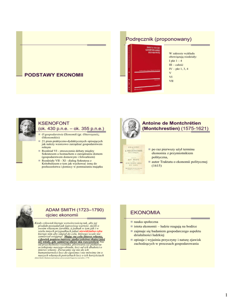 Podręcznik (proponowany) W zakresie wykładu obowiązują rozdziały: I pkt 1 – 4 III – całość IV – pkt 1, 3, 4 V VI VII PODSTAWY EKONOMII KSENOFONT (ok. 430 p.n.e. – ok. 355 p.n.e.) Antoine de Montchrétien (Montchrestien) (1575-1621) O gospodarstwie Ekonomik (gr. Οίκονομικός, Oikonomikós) 21 pism praktyczno-dydaktycznych opisujących jak należy wzorcowo zarządzać gospodarstwem rolnym Rozdział VI - streszczenie debaty między Sokratesem a Isomachem o zarządzaniu domem (gospodarstwem domowym i folwarkiem) Rozdziały VII - XI - dialog Sokratesa z Kritobulusem o tym jak wychować żonę do posłuszeństwa i pomocy w pomnażaniu majątku ADAM SMITH (1723–1790) ojciec ekonomii Kiedy człowiek kieruje wytwórczością tak, aby jej produkt posiadał jak najwyższą wartość, myśli o swoim własnym zarobku, a jednak w tym jak i w wielu innych przypadkach jakaś niewidzialna ręka kieruje nim aby zdążał do celu, którego wcale nie zamierzał osiągnąć. Mając na celu interes własny, człowiek popiera interesy społeczeństwa skuteczniej niż wtedy, gdy zamierza służyć mu rzeczywiście Nie od przychylności rzeźnika, piwowara czy piekarza oczekujemy naszego obiadu, lecz od ich dbałości o interes własny. Zwracamy się nie do ich humanitarności lecz do egoizmu i nie mówimy im o naszych własnych potrzebach lecz o ich korzyściach po raz pierwszy użył terminu ekonomia z przymiotnikiem polityczna, autor Traktatu o ekonomii politycznej (1615) EKONOMIA nauka społeczna istota ekonomii – ludzie reagują na bodźce zajmuje się badaniem gospodarczego aspektu działalności ludzkiej opisuje i wyjaśnia przyczyny i naturę zjawisk zachodzących w procesach gospodarowania Adam Smith, Badania nad naturą i przyczynami bogactwa narodów, 1776 1 EKONOMIA MIKROEKONOMIA nauka badająca problem rzadkości dóbr i ich zajmuje się badaniem zjawisk i procesów rynkową lub planową alokację, nauka badająca proces produkcji i dystrybucji dóbr. cel - sformułowanie teorii racjonalnego gospodarowania rzadkimi środkami, mającymi alternatywne zastosowanie w celu zaspokojenia nieograniczonych potrzeb. gospodarczych zachodzących w poszczególnych obszarach gospodarki, obserwowanych i wyjaśnianych z punktu widzenia działalności gospodarczej poszczególnych podmiotów gospodarczych: nabywców, konsumentów, sprzedawców i producentów. MAKROEKONOMIA MEZOEKONOMIA Makroekonomia zajmuje się badaniem zjawisk i relacje między gałęziami, działami i branżami w procesów zachodzących w całej gospodarce. EKONOMIA ujęciu przestrzenno-regionalnym PRAWO ORESMIUSZA KOPERNIKA GRESHAMA nauka nomotetyczna – teoretyczna, odkrywa ogólne prawidłowości i uogólniając je tworzy i wyjaśnia prawa ekonomiczne oraz konstruuje teorie ekonomiczne, nie daje recept na udane zakupy, inwestycje i targi, nie daje odpowiedzi co zrobić, żeby być bogatym. PIENIĄDZ GORSZY WYPIERA PIENIĄDZ LEPSZY •Mikołaj Oresme, zwany Oresmiuszem(ok. 1320 - 1382), francuski biskup z Lisieux - Traktat o powstaniu, istocie, prawach i zmianach monet (1366) •Mikołaj Kopernik (1473 - 1543),”Sposób bicia monety” (1526) •Thomas Gresham (ok. 1519 - 1579) 2 Model ekonomiczny Ekonomia posługuje się uproszczeniem (Uproszczony obraz rzeczywistości, który ma pokazać „o co chodzi”) Podstawowym założeniem wnioskowań ekonomicznych jest klauzula ceteris paribus Model – uproszczony obraz gospodarki oparty o rozmaite zmienne 3