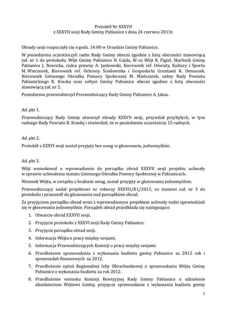 Protokół Nr XXXVII z XXXVII sesji Rady Gminy Pabianice z dnia 24 czerwca 2013r. Obrady sesji rozpoczęły się o godz. 14:00 w Urzędzie Gminy Pabianice. W posiedzeniu uczestniczyli radni Rady Gminy obecni zgodnie z listą obecności stanowiącą zał. nr 1 do protokołu, Wójt Gminy Pabianice H. Gajda, W-ce Wójt R. Figiel, Skarbnik Gminy Pabianice J. Nowicka, radca prawny A. Jankowski, Kierownik ref. Oświaty, Kultury i Sportu M. Wieczorek, Kierownik ref. Ochrony Środowiska i Gospodarki Gruntami K. Denuszek. Kierownik Gminnego Ośrodka Pomocy Społecznej M. Mielczarek, radny Rady Powiatu Pabianickiego R. Kraska oraz sołtysi Gminy Pabianice obecni zgodnie z listą obecności stanowiącą zał. nr 2. Posiedzeniu przewodniczył Przewodniczący Rady Gminy Pabianice A. Jaksa. Ad. pkt 1. Przewodniczący Rady Gminy otworzył obrady XXXVII sesji, przywitał przybyłych, w tym radnego Rady Powiatu R. Kraskę i stwierdził, że w posiedzeniu uczestniczy 15 radnych. Ad. pkt 2. Protokół z XXXVI sesji został przyjęty bez uwag w głosowaniu, jednomyślnie. Ad. pkt 3. Wójt wnioskował o wprowadzenie do porządku obrad XXXVII sesji projektu uchwały w sprawie uchwalenia statutu Gminnego Ośrodka Pomocy Społecznej w Pabianicach. Wniosek Wójta, w związku z brakiem uwag, został przyjęty w głosowaniu jednomyślnie. Przewodniczący nadał projektowi nr roboczy XXXVII/K1/2013, co stanowi zał. nr 3 do protokołu i przeszedł do głosowania nad porządkiem obrad. Za przyjęciem porządku obrad wraz z wprowadzonym projektem uchwały radni opowiedzieli się w głosowaniu jednomyślnie. Porządek obrad przedkłada się następująco: 1. Otwarcie obrad XXXVII sesji. 2. Przyjęcie protokołu z XXXVI sesji Rady Gminy Pabianice. 3. Przyjęcie porządku obrad sesji. 4. Informacja Wójta o pracy między sesjami. 5. Informacja Przewodniczących Komisji o pracy między sesjami. 6. Przedłożenie sprawozdania z wykonania budżetu gminy Pabianice za 2012 rok i sprawozdań finansowych za 2012. 7. Przedłożenie opinii Regionalnej Izby Obrachunkowej o sprawozdaniu Wójta Gminy Pabianice z wykonania budżetu za rok 2012. 8. Przedłożenie wniosku Komisji Rewizyjnej Rady Gminy Pabianice o udzielenie absolutorium Wójtowi Gminy, przyjęcie sprawozdania z wykonania budżetu gminy 1 Pabianice i sprawozdań finansowych. 9. Przedłożenie opinii Regionalnej Izby Obrachunkowej do wniosku Komisji Rewizyjnej. 10. Przyjęcie stanowiska w sprawie przyznania dla Telewizji Trwam miejsca na pierwszym multipleksie 11. Przyjęcie stanowiska Rady Gminy w sprawie odwiertu w Jadwininie. 12. Interpelacje, wnioski i zapytania radnych. 13. Podjęcie uchwał w sprawach: a. rozpatrzenia i zatwierdzenia sprawozdania finansowego wraz ze sprawozdaniem z wykonania budżetu za 2012 - Uchwala Nr XXXVII/A/2013 b. udzielenia absolutorium Wójtowi Gminy Pabianice za 2012r.- Uchwala Nr XXXVII/B/2013 c. zmian w budżecie gminy Pabianice na 2013 r.- Uchwała Nr XXXVII/C /2013 d. zmian w budżecie gminy Pabianice na 2013 r.- Uchwała Nr XXXVII/D/2013 e. zmian w budżecie gminy Pabianice na 2013 r.- Uchwała Nr XXXVII/E/2013 f. zmian w budżecie gminy Pabianice na 2013 r.- Uchwała Nr XXXVII/F/2013 g. zmian w budżecie gminy Pabianice na 2013 r.- Uchwała Nr XXXVII/G/2013 h. zmian w budżecie gminy Pabianice na 2013 r.- Uchwała Nr XXXVII/H/2013 i. zmian w budżecie gminy Pabianice na 2013 r.- Uchwała Nr XXXVII /I / 2013 j. zaciągnięcia pożyczki długoterminowej w 2013 r.- Uchwała Nr XXXVII/J/2013 k. zaciągnięcia pożyczki długoterminowej w 2013 r.- Uchwała Nr XXXVII/K/2013 l. zmian w Wieloletniej Prognozie Finansowej uchwalonej Uchwałą Nr XXX/257/2013 Rady Gminy Pabianice z dnia 21 stycznia 2013 - Uchwała Nr XXXVII/L/2013 m. uchwalenia Statutu Gminnego Ośrodka Pomocy Społecznej w Pabianicach Uchwała Nr XXXVII/Ł/2013 n. zasad udzielania dotacji celowej na dofinansowanie kosztów inwestycji z zakresu ochrony środowiska i gospodarki wodnej do budowy przyłączy kanalizacyjnych i przydomowych oczyszczalni ścieków- Uchwała Nr XXXVII/M/2013 o. przystąpienia do realizacji Projektu pod nazwą „Trasy rowerowe Euro Velo” – Uchwała Nr XXXVII/N/2013 14. Odpowiedzi na interpelacje, zapytania i wnioski. 15. Wolne wnioski, komunikaty i sprawy różne. 16. Zamknięcie obrad sesji. Ad. pkt 4. Wójt przedstawił informację o pracy między sesjami, co stanowi zał. nr 4 do protokołu. Radni nie zgłaszali uwag do przedstawionej informacji. 2 Ad. pkt 5. Przewodniczący Komisji przedkładali informacje o pracy między sesjami. Przewodniczący Komisji Samorządowo-Społecznej M. Muszczak poinformował, że Komisja, której przewodniczy odbyła między sesjami jedno posiedzenie. Komisja odbyła posiedzenie wyjazdowe do Szkoły Podstawowej w Petrykozach celem obejrzenia lokalizacji biblioteki. Komisja zajmowała się również analizą działań podejmowanych przez Gminny Ośrodek Pomocy Społecznej oraz sprawami różnymi. Komisja zobowiązała Wójta Gminy Pabianice do uzyskania stanowiska Zarządu OSP w kwestii dot. umieszczenia biblioteki w strażnicy OSP w Górce Pabianickiej. Komisja złożyła również wniosek o przedłożenie kosztów zaadoptowania pomieszczenia w strażnicy na bibliotekę oraz kosztów jej utrzymania. Przewodniczący Komisji Ochrony Środowiska i Rozwoju A. Skawiński poinformował, że Komisja, której przewodniczy odbyła między sesjami dwa posiedzenia. Tematem posiedzenia w dniu 6 czerwca br. było zapoznanie się z raportem z posiedzenia wyjazdowego Komisji Ochrony środowiska i Rozwoju w dniu 7 marca 2013r. Raport został przyjęty przez Komisję jednogłośnie. Na posiedzeniu w dniu 20 czerwca br. Komisja zajęła się analizą działań Gminy Pabianice w zakresie ochrony przeciwpożarowej, omówieniem materiałów na sesję Rady Gminy oraz sprawami różnymi. Komisja wypracowała dwa wnioski: 1. Zorganizować sesję nadzwyczajną w pierwszych dniach lipca w temacie kolei dużych prędkości. Na sesji przed
