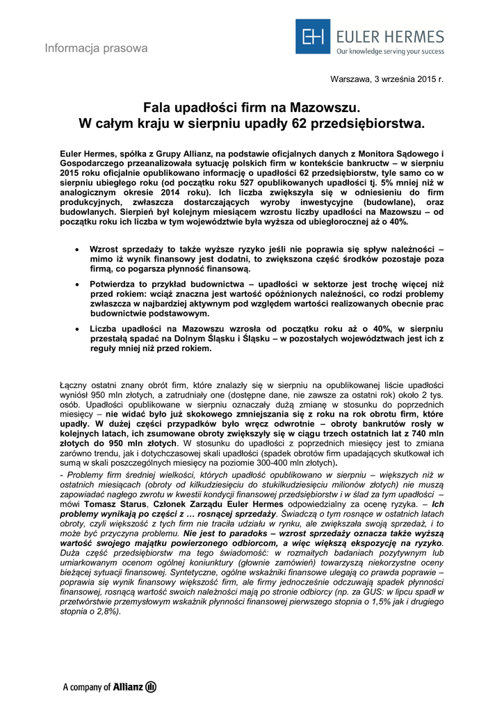 Informacja prasowa Warszawa, 3 września 2015 r. Fala upadłości firm na Mazowszu. W całym kraju w sierpniu upadły 62 przedsiębiorstwa. Euler Hermes, spółka z Grupy Allianz, na podstawie oficjalnych danych z Monitora Sądowego i Gospodarczego przeanalizowała sytuację polskich firm w kontekście bankructw – w sierpniu 2015 roku oficjalnie opublikowano informację o upadłości 62 przedsiębiorstw, tyle samo co w sierpniu ubiegłego roku (od początku roku 527 opublikowanych upadłości tj. 5% mniej niż w analogicznym okresie 2014 roku). Ich liczba zwiększyła się w odniesieniu do firm produkcyjnych, zwłaszcza dostarczających wyroby inwestycyjne (budowlane), oraz budowlanych. Sierpień był kolejnym miesiącem wzrostu liczby upadłości na Mazowszu – od początku roku ich liczba w tym województwie była wyższa od ubiegłorocznej aż o 40%. Wzrost sprzedaży to także wyższe ryzyko jeśli nie poprawia się spływ należności – mimo iż wynik finansowy jest dodatni, to zwiększona część środków pozostaje poza firmą, co pogarsza płynność finansową. Potwierdza to przykład budownictwa – upadłości w sektorze jest trochę więcej niż przed rokiem: wciąż znaczna jest wartość opóźnionych należności, co rodzi problemy zwłaszcza w najbardziej aktywnym pod względem wartości realizowanych obecnie prac budownictwie podstawowym. Liczba upadłości na Mazowszu wzrosła od początku roku aż o 40%, w sierpniu przestałą spadać na Dolnym Śląsku i Śląsku – w pozostałych województwach jest ich z reguły mniej niż przed rokiem. Łączny ostatni znany obrót firm, które znalazły się w sierpniu na opublikowanej liście upadłości wyniósł 950 mln złotych, a zatrudniały one (dostępne dane, nie zawsze za ostatni rok) około 2 tys. osób. Upadłości opublikowane w sierpniu oznaczały dużą zmianę w stosunku do poprzednich miesięcy – nie widać było już skokowego zmniejszania się z roku na rok obrotu firm, które upadły. W dużej części przypadków było wręcz odwrotnie – obroty bankrutów rosły w kolejnych latach, ich zsumowane obroty zwiększyły się w ciągu trzech ostatnich lat z 740 mln złotych do 950 mln złotych. W stosunku do upadłości z poprzednich miesięcy jest to zmiana zarówno trendu, jak i dotychczasowej skali upadłości (spadek obrotów firm upadających skutkował ich sumą w skali poszczególnych miesięcy na poziomie 300-400 mln złotych). - Problemy firm średniej wielkości, których upadłość opublikowano w sierpniu – większych niż w ostatnich miesiącach (obroty od kilkudziesięciu do stukilkudziesięciu milionów złotych) nie muszą zapowiadać nagłego zwrotu w kwestii kondycji finansowej przedsiębiorstw i w ślad za tym upadłości – mówi Tomasz Starus, Członek Zarządu Euler Hermes odpowiedzialny za ocenę ryzyka. – Ich problemy wynikają po części z … rosnącej sprzedaży. Świadczą o tym rosnące w ostatnich latach obroty, czyli większość z tych firm nie traciła udziału w rynku, ale zwiększała swoją sprzedaż, i to może być przyczyna problemu. Nie jest to paradoks – wzrost sprzedaży oznacza także wyższą wartość swojego majątku powierzonego odbiorcom, a więc większą ekspozycję na ryzyko. Duża część przedsiębiorstw ma tego świadomość: w rozmaitych badaniach pozytywnym lub umiarkowanym ocenom ogólnej koniunktury (głownie zamówień) towarzyszą niekorzystne oceny bieżącej sytuacji finansowej. Syntetyczne, ogólne wskaźniki finansowe ulegają co prawda poprawie – poprawia się wynik finansowy większość firm, ale firmy jednocześnie odczuwają spadek płynności finansowej, rosnącą wartość swoich należności mają po stronie odbiorcy (np. za GUS: w lipcu spadł w przetwórstwie przemysłowym wskaźnik płynności finansowej pierwszego stopnia o 1,5% jak i drugiego stopnia o 2,8%). Źródło: Monitor Sądowy i Gospodarczy, dane przeanalizowane przez Euler Hermes z grupy Allianz Budownictwo – w oczekiwaniu na nową perspektywę UE od 2016 roku rośnie stopniowo produkcja, ale także koszty (w tym pracownicze) przy utrzymujących się niskich cenach - Stosunkowo niskie ceny prac budowlano-montażowych wpływają na zatrzymanie się wzrostu marż branży. Nie są one co prawda na historycznie niskim poziomie jak w latach 2012-2013, nie zawsze zapewniającym egzystencję, ale jednocześnie nie są jeszcze na poziomie gwarantującym akumulację środków i impuls rozwojowy – mówi Michał Modrzejewski, Dyrektor Analiz Branżowych w Euler Hermes. – W efekcie bardzo nieznacznie zmienia się płynność branży i nadal utrzymuje się znaczna wartość opóźnionych należności. Wciąż największą grupę upadłości firm budowlanych stanowią przypadki firm realizujących podstawowe prace budowlane i wznoszących budynki (9 upadłości w sierpniu). Oprócz tego opublikowano w sierpniu informację o upadłości 5 firm związanych z inwestycjami infrastrukturalnymi (dwie realizujące prace drogowe i trzy specjalizujące się w budowie infrastruktury kanalizacyjnoprzesyłowej). Nie zmniejszają się koszty działalności, na rynku sygnalizowane są spodziewane problemy z dostępnością pracowników w przyszłym roku, po oczekiwanym bardziej dynamicznym wzroście wartości zleceń. Źródło: Monitor Sądowy i Gospodarczy, dane przeanalizowane przez Euler Hermes z grupy Allianz Firmy produkcyjne – nadal znaczny odsetek upadłości to producenci materiałów budowlanych, mniejsza ich liczba z przemysłu maszynowego jak i spożywczego Blisko połowa, bo 7 spośród 16 upadłości firm produkcyjnych dotyczyło w sierpniu firm dostarczających na rynek budowlany. Nie jest to przy tym efekt zbyt małego popytu, którego poziom jest lepszy niż w latach ubiegłych, o czym wspominaliśmy już na wstępie. Większość problemów branży ma podłoże finansowe, a nie popytowe: większe zaangażowanie finansowe w sprzedaż, przy utrzymujących się ni