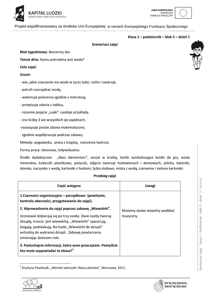 Klasa 1 – październik – blok 5 – dzień 1 Scenariusz zajęć Blok tygodniowy: Bezcenny dar. Temat dnia: Komu potrzebna jest woda? Cele zajęć: Uczeń: - wie, jakie znaczenie ma woda w życiu ludzi, roślin i zwierząt, - potrafi oszczędzać wodę, - wykonuje polecenia zgodnie z instrukcją, - przepisuje zdania z tablicy, - rozumie pojęcie „ssaki” i podaje przykłady, - zna liczbę 3 we wszystkich jej aspektach, -rozwiązuje proste zdania matematyczne, - zgodnie współpracuje podczas zabawy. Metody: pogadanka, praca z książką, ćwiczenia twórcze. Formy pracy: zbiorowa, indywidualna. Przebieg zajęć Część wstępna Uwagi 1.Czynności organizacyjno – porządkowe (powitanie, kontrola obecności, przygotowanie do zajęć). 2. Wprowadzenie do zajęć poprzez zabawę „Wiewiórki”. Uczniowie dobierają się po trzy osoby. Dwie osoby tworzą dziuplę, trzecia jest wiewiórką. „Wiewiórki” spacerują, biegają, podskakują. Na hasło „Wiewiórki do dziupli” wchodzą do wybranej dziupli. Zabawę powtarzamy zmieniając dzieciom role. Możemy dodać dowolny podkład muzyczny. 3. Posłuchajcie informacji, które wam przeczytam. Pomyślcie kto może wypowiadać te słowa?1 1 Krystyna Pawliszak, „Wesołe wierszyki: Nasza planeta”, Warszawa, 2011, Scenariusz zajęć klasa I – Październik - blok 5 - dzień 1 - Strona1 Środki dydaktyczne: „Nasz elementarz”, zeszyt w kratkę, kartki symbolizujące kostki do gry, woda mineralna, kubeczki plastikowe, patyczki, zdjęcia zwierząt hodowlanych i domowych, piórka, baloniki, słomka, naczynko z wodą, kartoniki z hasłami, łyżka stołowa, miska z wodą, czerwone i zielone kartoniki. -„Spadam na Ziemię w postaci deszczu.” -„Tworzę morza, oceany, rzeki, jeziora i inne zbiorniki.” - „Łodzie i statki poruszają się po mnie.” /Książeczka edukacyjna pt. „Wesołe wierszyki – nasza Planeta” Krystyna Pawliszak/ W tym tygodniu przekonamy się jakie znaczenie ma dla nas woda, zapoznam was z ważnymi informacjami, odpowiemy na pytanie czy i jak oszczędzać wodę. Zastanowimy się komu potrzebna jest woda. Będziemy poznawać wodne zwierzęta, wykonywać różne eksperymenty, ponieważ woda jest bezcennym skarbem dla nas wszystkich. Dla zwierząt ,roślin, ludzi i innych organizmów zamieszkujących naszą planetę. Poznamy też liczbę 3. Część główna Uwagi Paweł mył ręce I nie zakręcił wody w łazience Kapie, kapie woda Wody bardzo szkoda Nie można marnować wody Można nią podlać kwiatki Napoić można pieska Wykąpie się Tereska Mama zrobi pranie Będzie czyste ubranie Wziąć prysznic dla ochłody Nie można marnować wody! /bez autora, znaleziony w zasobach Internetu/ - Komu potrzebna jest woda? - Do czego możemy wykorzystać wodę? - Dlaczego nie można marnować wody? 2. Wklejenie do zeszytu w 3 linie haseł reklamujących wodę: Woda to nasz skarb. Oszczędzajmy wodę. Zimna woda zdrowia doda. 2 Dla każdego ucznia przygotowujemy kartoniki z hasłami Autor nieznany, wiersz pt.: „Woda”, http://www.akwarium.gdynia.pl/edukacja/projekty/2012/woda_to_skarb_i_zycie.pdf Scenariusz zajęć klasa I – Październik - blok 5 - dzień 1 - Strona2 1.Słuchanie wiersza z repertuaru dziecięcego pt. „Woda”.2 / Nauczyciel zapisuje zdania na tablicy a uczniowie wklejają je w zeszycie przedmiotowym./ do wklejenia w zeszycie. 3.Degustacja wody mineralnej. - Jaki ma kolor woda? - Jaki ma smak ta woda? - Czy lubicie pić wodę? 4. Zabawa wyciszająca. „Uwaga niosę wodę.” /Uczniowie nabierają wodę na łyżkę stołową i przenoszą ją do drugiego pojemnika tak, aby nie rozlać wody i nie upuścić łyżki. Przypominamy uczniom, że woda, to cenny skarb i nie może nam spaść żadna kropelka. Zebraną wodą możemy podlać kwiaty w klasie. Możemy przeprowadzić w klasie doświadczenie , przygotować 2 rośliny w doniczkach jedną podlewać regularnie, drugą pozostawić. Po tygodniu sprawdzić wyniki doświadczenia. Jakie zmiany nastąpiły w roślinach, jak one wyglądają. Możemy doniczki roślin specjalnie oznaczyć. 5.Zabawa „Moja liczba”. - Moja liczba ma z przodu daszek i prostą laseczkę. Czy wiecie jaka to liczba? (1) - Kolejną liczbą, jaką poznamy będzie liczba 3. 6. Wprowadzenie liczby 3 w aspekcie kardynalnym, porządkowym i miarowym. Przedstawienie zbioru liczb, które już poznaliśmy. Nauczyciel przygotowuje karty symbolizujące ścianę kostki do gry. Powiększenie zbioru o jeden element tak aby wynik był 3. Przeliczanie elementów w zbiorach i określanie ich Do każdej dokładamy jedną kropkę. ilości, itp. Określanie miejsca poznanej liczby w ciągu liczbowym. Pokaz znaku graficznego wprowadzanej liczby i nauka pisania poprzedzona pokazem prawidłowego kreślenia cyfry. 7. Zabawa „Bawimy się wszyscy paluszkami.” Wszyscy śpiewają znaną piosenkę, wskazując na palcach wymieniane liczby: „Bawimy się wszyscy paluszkami, jak pierwszy nie może, to drugi pomoże ….. itd.” W tych działaniach towarzyszy nam Liczmanek. Scenariusz zajęć klasa I – Październik - blok 5 - dzień 1 - Strona3 - A jeśli spotkają się dwie takie liczby, to już będzie para i będzie to liczba…? (2) 8. Praca z książką. - Liczmanek zapoznał nas dzisiaj z liczbą 3. - Spójrzcie, ile jest świnek na ilustracji? - Ile jest domków? Z jakich materiałów zbudowane są domki na ilustracji? Czy ktoś wie z jakich materiałów budowane są zabudowania gospodarskie? - Gdzie wiszą garnki? Jakiej wielkości są garnki? - Która świnka jest najwyższa? - O co możemy jeszcze zapytać? /Nauczyciel prowadzi rozmowę z uczniami zadając jak największą liczbę pytań. Wykorzystujemy możliwości, które oferuje podręcznik: przeliczanie monet , dobieranie tak aby wynik był 3 zł, wskazywanie liczby 3 na osi liczbowej oraz posługiwanie się zegarem – godzina 3 – układ wskazówek ./ - Posłuchajcie bajki o trzech świnkach i spróbujcie zapamiętać, jakie p