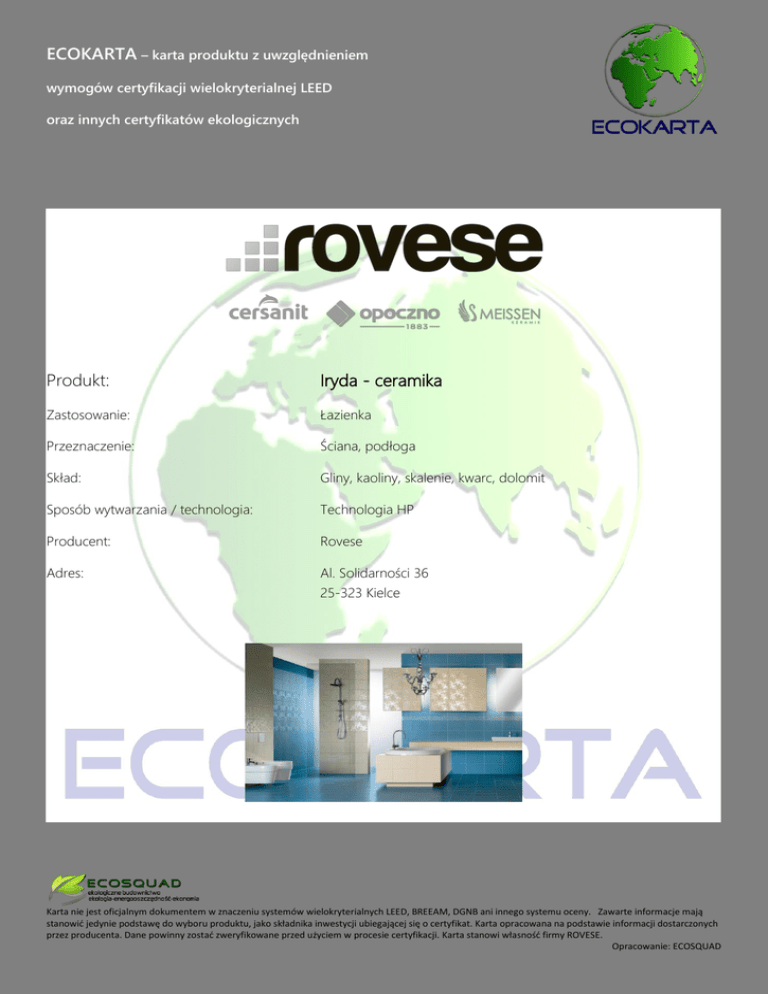 ECOKARTA – karta produktu z uwzględnieniem wymogów certyfikacji wielokryterialnej LEED oraz innych certyfikatów ekologicznych Produkt: Iryda - ceramika Zastosowanie: Łazienka Przeznaczenie: Ściana, podłoga Skład: Gliny, kaoliny, skalenie, kwarc, dolomit Sposób wytwarzania / technologia: Technologia HP Producent: Rovese Adres: Al. Solidarności 36 25-323 Kielce Karta nie jest oficjalnym dokumentem w znaczeniu systemów wielokryterialnych LEED, BREEAM, DGNB ani innego systemu oceny. Zawarte informacje mają stanowić jedynie podstawę do wyboru produktu, jako składnika inwestycji ubiegającej się o certyfikat. Karta opracowana na podstawie informacji dostarczonych przez producenta. Dane powinny zostać zweryfikowane przed użyciem w procesie certyfikacji. Karta stanowi własność firmy ROVESE. Opracowanie: ECOSQUAD ECOKARTA – karta produktu z uwzględnieniem wymogów certyfikacji wielokryterialnej LEED oraz innych certyfikatów ekologicznych Zawartość materiałów Materiał pochodzący z recyklingu został określony zgodnie z pochodzących z recyklingu definicją normy ISO 14021. Zawartość materiałów pochodzących z recyklingu podana jest w %. Zgodnie z wymogami LEED NC oraz LEED CS możliwe jest uzyskanie 1 lub 2 punktów w kredycie MR4 jeżeli zawartość produktów pochodzących z recyklingu post-konsumenckiego oraz pre-konsumenckiego wynosi odpowiednio 10% lub 20% całkowitego kosztu materiałów użytych w projekcie. Zawartość w produkcie do 10% Zawartość materiałów Procentowa zawartość materiału nadającego się do recyklingu możliwych do recyklingu w gotowym produkcie. Produkt może być poddany recyklingowi w całości lub po uprzednim przygotowaniu. Zawartość w produkcie: 100% Karta nie jest oficjalnym dokumentem w znaczeniu systemów wielokryterialnych LEED, BREEAM, DGNB ani innego systemu oceny. Zawarte informacje mają stanowić jedynie podstawę do wyboru produktu, jako składnika inwestycji ubiegającej się o certyfikat. Karta opracowana na podstawie informacji dostarczonych przez producenta. Dane powinny zostać zweryfikowane przed użyciem w procesie certyfikacji. Karta stanowi własność firmy ROVESE. Opracowanie: ECOSQUAD ECOKARTA – karta produktu z uwzględnieniem wymogów certyfikacji wielokryterialnej LEED oraz innych certyfikatów ekologicznych Miejsce wytwarzania: Krasnystaw, woj. Lubelskie, Polska Pochodzenie materiałów składowych: Gliny – Europa Kaoliny – Europa Skalenie – Europa Dolomit – Europa Kwarc – Europa Zgodnie z wymaganiami certyfikacji wielokryterialnej LEED punkty za użycie produktów regionalnych można uzyskać w przypadku, gdy co najmniej 10% całkowitego kosztu materiałów użytych w projekcie stanowią materiały regionalne, czyli pozyskane, wytwarzane lub odzyskane w promieniu 500 mil ( ok. 804 km) od miejsca budowy. Możliwe jest uzyskanie odpowiednio: 1 pkt – 10% oraz 2 pkt – 20%. Karta nie jest oficjalnym dokumentem w znaczeniu systemów wielokryterialnych LEED, BREEAM, DGNB ani innego systemu oceny. Zawarte informacje mają stanowić jedynie podstawę do wyboru produktu, jako składnika inwestycji ubiegającej się o certyfikat. Karta opracowana na podstawie informacji dostarczonych przez producenta. Dane powinny zostać zweryfikowane przed użyciem w procesie certyfikacji. Karta stanowi własność firmy ROVESE. Opracowanie: ECOSQUAD ECOKARTA – karta produktu z uwzględnieniem wymogów certyfikacji wielokryterialnej LEED oraz innych certyfikatów ekologicznych Wpływ na jakość powietrza Pomimo, iż sam produkt pozostaje bez wpływu na jakość we wnętrzach: powietrza we wnętrzach, kleje użyte do montażu mogą zawierać substancje wpływające na jakość powietrza. Dotyczy to zwłaszcza klejów i uszczelniaczy. Zgodnie z wymaganiami certyfikacji LEED NC oraz LEED CS użyte kleje oraz uszczelniacze powinny spełniać zapisy normy South Coast Air Quality Managemant District (SCAQMD), natomiast kleje natryskowe odpowiednio zapisy normy Green Seal Standard for Commercial Adhesives. System oceny wielokryterialnej LEED zawiera również zapisy co do wykończenia powierzchni podłogowych. W tym przypadku konieczne jest uzyskanie zgodności z aktualnie obowiązującą wersja FloorScore – dotyczy to wszystkich nie dywanowych powierzchni podłóg. Produkt ma wpływ na uzyskanie punktów w certyfikacji LEED NC oraz LEED CS w zakresie kredytów IEQ 4.3 oraz pośrednio IEQ 4.1. Zawartość substancji niebezpiecznych: LZO (VOC) - nie zawiera Formaldehyd - nie zawiera Fenole - nie zawiera Karta nie jest oficjalnym dokumentem w znaczeniu systemów wielokryterialnych LEED, BREEAM, DGNB ani innego systemu oceny. Zawarte informacje mają stanowić jedynie podstawę do wyboru produktu, jako składnika inwestycji ubiegającej się o certyfikat. Karta opracowana na podstawie informacji dostarczonych przez producenta. Dane powinny zostać zweryfikowane przed użyciem w procesie certyfikacji. Karta stanowi własność firmy ROVESE. Opracowanie: ECOSQUAD ECOKARTA – karta produktu z uwzględnieniem wymogów certyfikacji wielokryterialnej LEED oraz innych certyfikatów ekologicznych Redukcja zużycia wody: Redukcja zużycia wody stanowi jeden z punktów krytycznych w certyfikacji wielokryterialnej LEED. Aby spełnić ten warunek, konieczne jest obniżenie zużycia wody o 20% w stosunku do standardowych budynków danej klasy. Samo zużycie wody do transportu ścieków w budynku powinno zostać obniżone również o 50% - głównie dzięki zastosowaniu specjalnych urządzeń sanitarnych. Zastosowane rozwiązania pozwalają na uzyskanie maksymalnie 2 punktów w kredycie WE 2. Zużycie wody podawane jest w galonach na jedno spłukanie lub też w galonach na minutę. Posiadane certyfikaty ekologiczne: System Zarządzania Środowiskowego ISO 14001 Gwarancją prawidłowego Zarządzania Środowiskowego jest przestrzeganie następujących zasad: - Planowa i rozsądna ochrona środowiska oraz przestrzeganie zasa