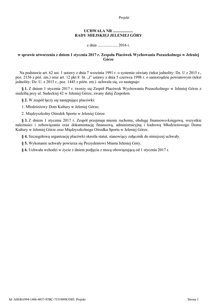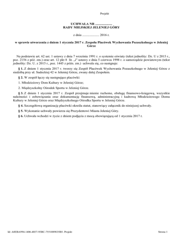 Projekt UCHWAŁA NR .................... RADY MIEJSKIEJ JELENIEJ GÓRY z dnia .................... 2016 r. w sprawie utworzenia z dniem 1 stycznia 2017 r. Zespołu Placówek Wychowania Pozaszkolnego w Jeleniej Górze Na podstawie art. 62 ust. 1 ustawy z dnia 7 września 1991 r. o systemie oświaty (tekst jednolity: Dz. U z 2015 r., poz. 2156 z póź. zm.) oraz art. 12 pkt 8 lit. „i" ustawy z dnia 5 czerwca 1998 r. o samorządzie powiatowym (tekst jednolity: Dz. U. z 2015 r., poz. 1445 z późn. zm.) uchwala się, co następuje: § 1. Z dniem 1 stycznia 2017 r. tworzy się Zespół Placówek Wychowania Pozaszkolnego w Jeleniej Górze z siedzibą przy ul. Sudeckiej 42 w Jeleniej Górze, zwany dalej Zespołem. § 2. W zespół łączy się następujące placówki: 1. Młodzieżowy Dom Kultury w Jeleniej Górze; 2. Międzyszkolny Ośrodek Sportu w Jeleniej Górze. § 3. Z dniem 1 stycznia 2017 r. Zespół przejmuje mienie ruchome, obsługę finansowo-księgową, wszystkie należności i zobowiązania oraz dokumentację finansową, administracyjną i kadrową Młodzieżowego Domu Kultury w Jeleniej Górze oraz Międzyszkolnego Ośrodka Sportu w Jeleniej Górze. § 4. Szczegółową organizację placówki określa statut, stanowiący załącznik do niniejszej uchwały. § 5. Wykonanie uchwały powierza się Prezydentowi Miasta Jeleniej Góry. § 6. Uchwała wchodzi w życie z dniem podjęcia z mocą obowiązującą od 1 stycznia 2017 r. Id: A0EBA994-1406-4037-93BC-7551089835B5. Projekt Strona 1 Załącznik do uchwały nr…… Rady Miejskiej Jeleniej Góry z dnia……………….. STATUT Zespołu Placówek Wychowania Pozaszkolnego w Jeleniej Górze Id: A0EBA994-1406-4037-93BC-7551089835B5. Projekt Strona 2 Rozdział 1 Postanowienia Ogólne §1 Ilekroć w statucie jest mowa bez bliższego określenia o: 1. Zespole, należy przez to rozumieć Zespół Placówek Wychowania Pozaszkolnego w Jeleniej Górze, 2. Młodzieżowym Domu Kultury - Młodzieżowy Dom Kultury w Jeleniej Górze, 3. Międzyszkolnym Ośrodku Sportu - Międzyszkolny Ośrodek Sportu w Jeleniej Górze, 4. ustawie - ustawę z 7 września 1991 r. o systemie oświaty (tekst jedn.: Dz. U. z 2015 r., poz. 2156 z późn. zm.), 5. rozporządzeniu - rozporządzenie MEN i S z dnia 7 marca 2005 r. w sprawie ramowych statutów placówek publicznych, (Dz. U. z 2005 r., Nr 52, poz. 466); 6. Statucie – Statut Zespołu Placówek Wychowania Pozaszkolnego w Jeleniej Górze, 7. Dyrektorze, Radzie Pedagogicznej, Radzie Rodziców - organy działające w placówkach oświatowych wchodzących w skład Zespołu, 8. Wychowankach i rodzicach - wychowanków placówek oświatowych wchodzących w skład Zespołu oraz ich rodziców lub prawnych opiekunów, 9. Nauczycielu – nauczyciela, którego szczególnej opiece wychowawczej powierzono wychowanków. §2 1. Zespół nosi nazwę: Zespół Placówek Wychowania Pozaszkolnego w Jeleniej Górze. 2. W skład Zespołu wchodzą następujące placówki oświatowe: a. Młodzieżowy Dom Kultury w Jeleniej Górze, b. Międzyszkolny Ośrodek Sportu w Jeleniej Górze. 3. Siedziba Zespołu znajduje się w Jeleniej Górze przy ul. Sudeckiej 42, 58-500 Jelenia Góra; 4. Organem Prowadzącym Zespół jest Miasto Jelenia Góra. 5. Nadzór pedagogiczny sprawuje Dolnośląskie Kuratorium Oświaty. §3 1. Nazwa Zespołu używana jest w pełnym brzmieniu. 2. Nazwa placówki wchodzącej w skład Zespołu składa się zarówno z nazwy Zespołu jak i nazwy właściwej placówki. §4 1. Zespół używa pieczęci i stempli zgodnie z odrębnymi przepisami. 2. Na pieczęciach i stemplach jest używana pełna nazwa Zespołu. 3. Na pieczęciach i stemplach placówek wchodzących w skład Zespołu podawana jest zarówno nazwa Zespołu i właściwej placówki. §5 Zespół prowadzi i przechowuje dokumentację na zasadach określonych w odrębnych przepisach. §6 1. Na zasadach określonych w art. 56 ustawy w Zespole mogą działać stowarzyszenia i organizacje – z wyjątkiem partii i organizacji politycznych. 2. Zasady funkcjonowania w Zespole związków zawodowych regulują odrębne przepisy. §7 1. Zespół jest jednostką budżetową. 2. Szczegółowe zasady gospodarki finansowej Zespołu regulują odrębne przepisy. 3. Ze środków finansowych i majątku Zespołu mogą korzystać wyłącznie placówki wchodzące w skład Zespołu w celu wykonywania zadań określonych w Statucie. Id: A0EBA994-1406-4037-93BC-7551089835B5. Projekt Strona 3 Rozdział 2 Cele i zadania Zespołu §8 Zespół realizuje zadania określone w ustawie i przepisach wydanych na jej podstawie, a w szczególności: 1. Stwarza warunki do wszechstronnego rozwoju osobowości wychowanków w oparciu o zasady wolności, demokracji, sprawiedliwości, tolerancji i solidarności. 2. Rozwija poczucie odpowiedzialności, miłości Ojczyzny oraz poszanowania dla polskiego dziedzictwa kulturowego i otwarcia na kulturę innych krajów. 3. Kształtuje i rozwija zainteresowania i uzdolnienia, uzupełnia wiedzę i umożliwia zdobywanie umiejętności oraz korzystanie z różnych form wypoczynku. 4. Kształtuje świadomych i aktywnych odbiorców kultury i sztuki z uwzględnieniem sztuki ludowej i folkloru naszego regionu, tworzy warunki do rozwoju twórczych uzdolnień i talentów. 5. Kształtuje umiejętności i sprawności techniczne. 6. Rozwija i kształtuje nawyki czynnego wypoczynku, zamiłowanie do krajoznawstwa i turystyki z uwzględnieniem właściwych postaw wobec ochrony środowiska. 7. Wdraża do samorządnej i samodzielnej działalności wychowanków poprzez kształtowanie umiejętności wspólnego działania, pełnienia ról społecznych, stwarzania warunków do własnych inicjatyw i aktywnego działania z uwzględnieniem odpowiedzialności za siebie i kolegów. 8. Wypracowuje własne rozwiązania w zakresie działalności merytorycznej uwzględniając potrzeby wychowanków i środowiska. 9. Organizuje własne przeglądy, konkursy, wystawy, zawody sportowe i imprez