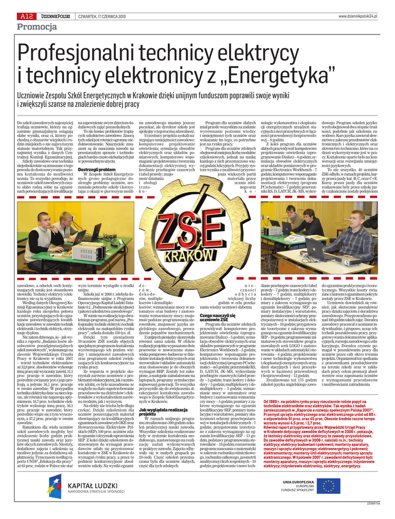 A12 www.dziennikpolski24.pl CZWARTEK, 17 CZERWCA 2010 Promocja Profesjonalni technicy elektrycy i technicy elektronicy z „Energetyka” Uczniowie Zespołu Szkół Energetycznych w Krakowie dzięki unijnym funduszom poprawili swoje wyniki i zwiększyli szanse na znalezienie dobrej pracy Do szkół zawodowych najczęściej trafiają uczniowie, którzy na egzaminie gimnazjalnym osiągają słabe wyniki, oraz ci, którzy pochodzą z obszarów wiejskich i rodzin miejskich o nie najwyższym statusie materialnym. Tak przynajmniej wynika z danych Centralnej Komisji Egzaminacyjnej. Szkoły zawodowe oraz technika niejednokrotnie są zmuszane z tego powodu do dostosowywania poziomu kształcenia do możliwości ucznia. To wszystko powoduje, że uczniowie szkół zawodowych często słabo radzą sobie na egzaminach potwierdzających kwalifikacje W Zespole Szkół Energetycznych grono pedagogiczne dostrzegło problemy uczniów, zrozumiało potrzeby szkoły i korzystając z okazji w pierwszym możli- zawodowe, a odsetek osób kontynuujących naukę jest stosunkowo niewielki. Technicy elektrycy i elektronicy nie są tu wyjątkiem. Według danych Okręgowej Komisji Egzaminacyjnej w Krakowie każdego roku niespełna połowa uczniów, przystępujących do egzaminów potwierdzających kwalifikacje zawodowe w zawodzie technik elektronik i technik elektryk, otrzymuje dyplom. Nic zatem dziwnego, że – jak wynika z raportu „Badania losów absolwentów ponadgimnazjalnych szkół zawodowych”, wykonanego na zlecenie Wojewódzkiego Urzędu Pracy w Krakowie w roku 2007 – wśród techników elektroników aż 32,8 proc. absolwentów wykonuje inną pracę niż wyuczony zawód, 31,1 proc. pracuje w zawodzie, który pośrednio związany jest z jego profesją, a jedynie 36,1 proc. pracuje w swoim zawodzie. W przypadku technika elektryka dane są nieco lepsze, ale również nie napawają optymizmem. 16,7 proc. techników elektryków wykonuje inną pracę, 36,1 proc. pracuje w zawodzie, który pośrednio wiąże się z tym wyuczonym, a 47,2 proc. pracuje w swoim zawodzie. Ratunkiem dla wielu uczniów szkół zawodowych mogłoby być zwiększenie liczby godzin praktycznej nauki zawodu oraz języków obcych zawodowych. Niestety, dodatkowe zajęcia i szkolenia są możliwe jedynie za dodatkową odpłatnością. Tymczasem według raportu UNDP „Edukacja dla pracy” aż 63 proc. rodzin w Polsce nie stać wym terminie wystąpiło o środki unijne. Szkoła już w 2008 r. zdobyła dofinansowanie unijne z Programu Operacyjnego Kapitał Ludzki Działanie 9.2. „Podnoszenie atrakcyjności i jakości szkolnictwa zawodowego”. W sumie na realizację tego dwuletniego programu, pod nazwą „Profesjonalny technik elektryk i technik elektronik na małopolskim rynku pracy”, szkoła dostała 350 tys. zł. Dzięki tym pieniądzom 59 uczniów ZSE zostało objętych specjalnym programem kształcenia wyrównującego ich poziom wiedzy i umiejętności zawodowych oraz programem szkoleń zwiększających ich konkurencyjność na rynku pracy. Ze wsparcia w projekcie skorzystali zarówno uczniowie z problemami edukacyjnymi, jak i uczniowie zdolni, co było uzasadnione ze względu na duże zapotrzebowanie pracodawców na elektryków i elektroników z wykształceniem zarówno średnim, jak i wyższym. Na efekty nie trzeba było długo czekać. Dzięki szkoleniom dla uczniów poszerzających materiał obowiązujący na kwalifikacyjnych egzaminach zawodowych OKE oraz Stowarzyszenia Elektryków Polskich (SEP), 100 proc. uczniów zdało egzamin i otrzymało uprawnienia SEP. Z kolei dzięki szkoleniom dostosowanym do wymagań pracodawców udało się przystosować kształcenie w ZSE w Krakowie do wymagań rynku pracy, a przez to podnieść konkurencyjność absolwentów szkoły. Na wyniki egzami- na zapewnienie swym dzieciom dodatkowych zajęć pozaszkolnych. To nie koniec problemów trapiących szkolnictwo zawodowe. Zmorą tych szkół jest również ogromne niedoinwestowanie. Nauczyciele zmuszeni są do nauczania zawodu na przestarzałym sprzęcie i technologiach bardzo często niebędących już w powszechnym użyciu. Dostrzegli problem nu zawodowego musimy jeszcze poczekać, ale dyrektor szkoły jest spokojny o tegoroczną zdawalność. Uczestnicy projektu zyskali następujące umiejętności zawodowe: komputerowe projektowanie oświetlenia; symulacja obwodów elektrycznych oraz układów pomiarowych; komputerowe wspomaganie projektowania i tworzenia dokumentacji elektrycznej; wykreślanie przebiegów czasowych i tabel prawdy; znajomość działania i obsługi transko- Program dla uczniów słabych miał przede wszystkim za zadanie wyrównanie poziomu wiedzy i umiejętności tych uczniów oraz wskazanie im tego, co potrzebne jest na rynku pracy. Program dla uczniów zdolnych obejmował mniejszą liczbę modułów szkoleniowych, jednak na naukę każdego z nich przeznaczono więcej godzin lekcyjnych. Przyjęty system wynika z możliwości przyswojenia większych partii materiału przez ucznia zdolnego oraz k o - nologie wykonawstwa i eksploatacji energetycznych urządzeń stacyjnych i sieci przesyłowych w łączności przewodowej i bezprzewodowej – 8 godzin. Z kolei program dla uczniów słabych przewidywał: komputerowe projektowanie oświetlenia (oprogramowanie Dialux) – 6 godzin; symulacja obwodów elektrycznych oraz układów pomiarowych w programie Electronics Workbench – 7 godzin; komputerowe wspomaganie projektowania i tworzenia dokumentacji elektrycznej (program PCschematic) – 7 godzin; przerzutniki RS, D, LATCH, JK–MS, wykre- dowego. Program szkoleń językowych obejmował dwa stopnie trudności, podobnie jak szkolenia zawodowe. Kurs języka zawierał słownictwo z zakresu przedmiotów elektronicznych i elektrycznych oraz słownictwo techniczne, które na co dzień wykorzystywane jest w pracy. Kształcenie oparte było na konwersacji oraz rozwijaniu umiejętności językowych. To nie wszystko. 40 uczniów ZSE odbyło, 