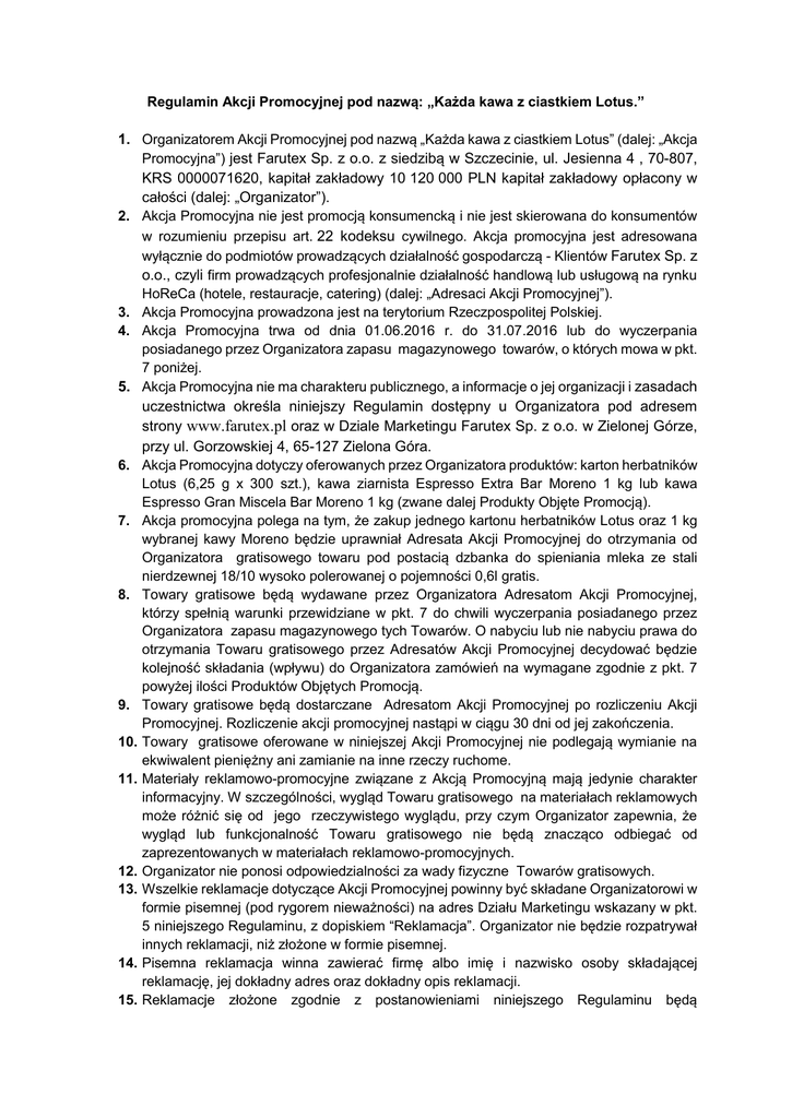 Regulamin Akcji Promocyjnej pod nazwą: „Każda kawa z ciastkiem Lotus.” 1. Organizatorem Akcji Promocyjnej pod nazwą „Każda kawa z ciastkiem Lotus” (dalej: „Akcja Promocyjna”) jest Farutex Sp. z o.o. z siedzibą w Szczecinie, ul. Jesienna 4 , 70-807, KRS 0000071620, kapitał zakładowy 10 120 000 PLN kapitał zakładowy opłacony w całości (dalej: „Organizator”). 2. Akcja Promocyjna nie jest promocją konsumencką i nie jest skierowana do konsumentów w rozumieniu przepisu art. 22 kodeksu cywilnego. Akcja promocyjna jest adresowana wyłącznie do podmiotów prowadzących działalność gospodarczą - Klientów Farutex Sp. z o.o., czyli firm prowadzących profesjonalnie działalność handlową lub usługową na rynku HoReCa (hotele, restauracje, catering) (dalej: „Adresaci Akcji Promocyjnej”). 3. Akcja Promocyjna prowadzona jest na terytorium Rzeczpospolitej Polskiej. 4. Akcja Promocyjna trwa od dnia 01.06.2016 r. do 31.07.2016 lub do wyczerpania posiadanego przez Organizatora zapasu magazynowego towarów, o których mowa w pkt. 7 poniżej. 5. Akcja Promocyjna nie ma charakteru publicznego, a informacje o jej organizacji i zasadach uczestnictwa określa niniejszy Regulamin dostępny u Organizatora pod adresem strony www.farutex.pl oraz w Dziale Marketingu Farutex Sp. z o.o. w Zielonej Górze, przy ul. Gorzowskiej 4, 65-127 Zielona Góra. 6. Akcja Promocyjna dotyczy oferowanych przez Organizatora produktów: karton herbatników Lotus (6,25 g x 300 szt.), kawa ziarnista Espresso Extra Bar Moreno 1 kg lub kawa Espresso Gran Miscela Bar Moreno 1 kg (zwane dalej Produkty Objęte Promocją). 7. Akcja promocyjna polega na tym, że zakup jednego kartonu herbatników Lotus oraz 1 kg wybranej kawy Moreno będzie uprawniał Adresata Akcji Promocyjnej do otrzymania od Organizatora gratisowego towaru pod postacią dzbanka do spieniania mleka ze stali nierdzewnej 18/10 wysoko polerowanej o pojemności 0,6l gratis. 8. Towary gratisowe będą wydawane przez Organizatora Adresatom Akcji Promocyjnej, którzy spełnią warunki przewidziane w pkt. 7 do chwili wyczerpania posiadanego przez Organizatora zapasu magazynowego tych Towarów. O nabyciu lub nie nabyciu prawa do otrzymania Towaru gratisowego przez Adresatów Akcji Promocyjnej decydować będzie kolejność składania (wpływu) do Organizatora zamówień na wymagane zgodnie z pkt. 7 powyżej ilości Produktów Objętych Promocją. 9. Towary gratisowe będą dostarczane Adresatom Akcji Promocyjnej po rozliczeniu Akcji Promocyjnej. Rozliczenie akcji promocyjnej nastąpi w ciągu 30 dni od jej zakończenia. 10. Towary gratisowe oferowane w niniejszej Akcji Promocyjnej nie podlegają wymianie na ekwiwalent pieniężny ani zamianie na inne rzeczy ruchome. 11. Materiały reklamowo-promocyjne związane z Akcją Promocyjną mają jedynie charakter informacyjny. W szczególności, wygląd Towaru gratisowego na materiałach reklamowych może różnić się od jego rzeczywistego wyglądu, przy czym Organizator zapewnia, że wygląd lub funkcjonalność Towaru gratisowego nie będą znacząco odbiegać od zaprezentowanych w materiałach reklamowo-promocyjnych. 12. Organizator nie ponosi odpowiedzialności za wady fizyczne Towarów gratisowych. 13. Wszelkie reklamacje dotyczące Akcji Promocyjnej powinny być składane Organizatorowi w formie pisemnej (pod rygorem nieważności) na adres Działu Marketingu wskazany w pkt. 5 niniejszego Regulaminu, z dopiskiem “Reklamacja”. Organizator nie będzie rozpatrywał innych reklamacji, niż złożone w formie pisemnej. 14. Pisemna reklamacja winna zawierać firmę albo imię i nazwisko osoby składającej reklamację, jej dokładny adres oraz dokładny opis reklamacji. 15. Reklamacje złożone zgodnie z postanowieniami niniejszego Regulaminu będą rozpatrywane przez Organizatora w terminie 30 dni od daty wpłynięcia. O wynikach postępowania reklamacyjnego Organizator powiadamia osobę, która wniosła reklamację. Powiadomienie to zostanie dokonane w formie pisemnej na adres wskazany w reklamacji. 16. Organizator jest uprawniony do zmiany niniejszego Regulaminu przed zakończeniem Akcji Promocyjnej, jeżeli nie wpłynie to na pogorszenie warunków uczestnictwa w Akcji Promocyjnej ani nie spowoduje utraty przyznanych już przez Organizatora uczestnikom Akcji Promocyjnej praw do otrzymania Towarów gratisowych. Zmiana Regulaminu wymaga dla swej skuteczności ogłoszenia przez Organizatora pod adresem strony www.farutex.pl. 17. Do spraw nieuregulowanych niniejszym Regulaminem mają zastosowania odpowiednie przepisy Kodeksu cywilnego. 18. Wszelkie spory dotyczące, związane lub wynikłe z faktu prowadzenia niniejszej Akcji Promocyjnej będą rozpatrywane przez właściwy rzeczowo sąd powszechny w Szczecinie. Szczecin, 31.05.2016 r. Organizator: Farutex Sp. z o.o.
