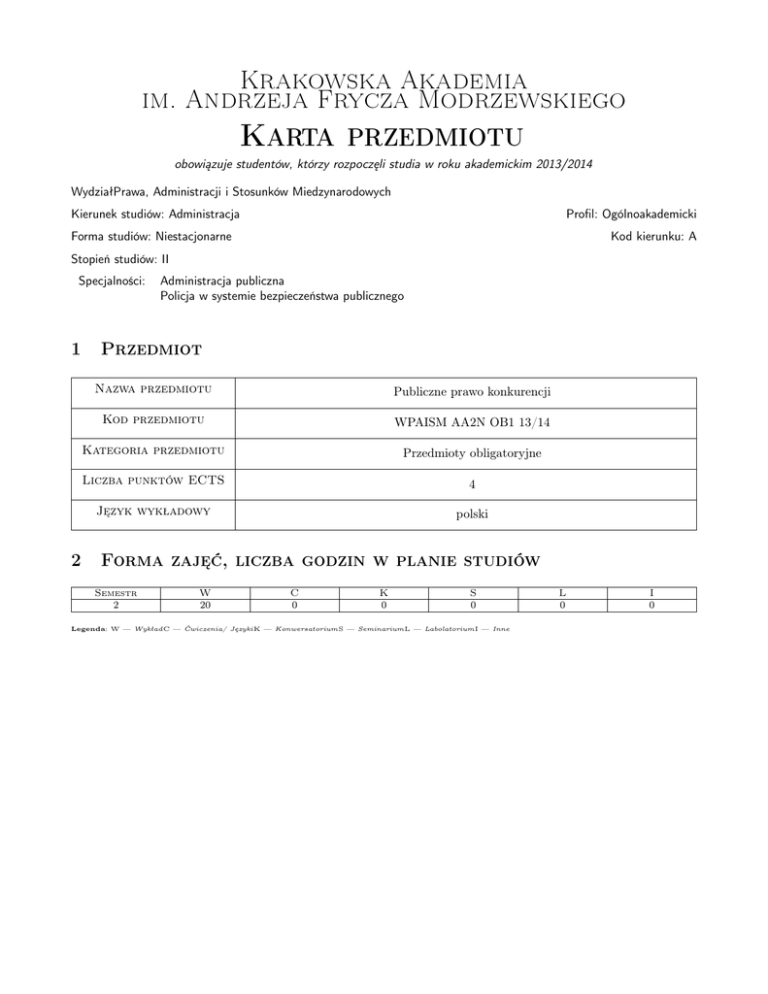 Krakowska Akademia im. Andrzeja Frycza Modrzewskiego Karta przedmiotu obowiązuje studentów, którzy rozpoczęli studia w roku akademickim 2013/2014 WydziałPrawa, Administracji i Stosunków Miedzynarodowych Kierunek studiów: Administracja Profil: Ogólnoakademicki Forma studiów: Niestacjonarne Kod kierunku: A Stopień studiów: II Specjalności: 1 2 Administracja publiczna Policja w systemie bezpieczeństwa publicznego Przedmiot Nazwa przedmiotu Publiczne prawo konkurencji Kod przedmiotu WPAISM AA2N OB1 13/14 Kategoria przedmiotu Przedmioty obligatoryjne Liczba punktów ECTS 4 Język wykładowy polski Forma zajęć, liczba godzin w planie studiów Semestr 2 W 20 C 0 K 0 S 0 Legenda: W — WykładC — Ćwiczenia/ JęzykiK — KonwersatoriumS — SeminariumL — LabolatoriumI — Inne L 0 I 0 Krakowska Akademia im. Andrzeja Frycza Modrzewskiego 3 Cele przedmiotu Cel 1 celem dydaktycznym przedmiotu jest przekazanie i uzyskanie przez studentów wiedzy na temat regulacji polskiego i unijnego prawa antymonopolowego. Ta - stanowiaca jeden z filarów własciwego funkcjonowanie gospodarki wolnorynkowej - dziedzina prawa od kilku lat znajduje sie w fazie dynamicznego rozwoju, majac coraz wieksze znaczenie w obrocie prawno-gospodarczym w Polsce (jak i w innych krajach). Swiadczy o tym (m.in.) wzrastajaca ilosc wszczynanych przez organy antymonopolowe postepowan przeciwko przedsiebiorcom, którym zarzuca sie naruszenie prawa konkurencji. Zaznajomienie sie przez studentów z instytucjami tego prawa staje sie wiec coraz bardziej pozadane oraz potrzebne 4 Wymagania wstępne 1 postepowanie administracyjne 5 Modułowe efekty kształcenia MW1 Uzyskanie przez studentów wiedzy z zakresu stanowiacego przedmiot "tresci programowych" przedmiotu MU2 Samodzielnie dokonuje kwalifikacji materialno i proceduralno prawnej różnych stanów faktycznych charakterystycznych dla sfery publicznego prawa konkurencji MK3 Potrafi twórczo i świadomie uczestniczyć w debacie na temat problemów sfery publicznego prawa konkurencji 6 Treści programowe Lp W1 W2 Wykład Tematyka zajęć Opis szczegółowy bloków tematycznych Zakres podmiotowy i terytorialny polskiego prawa konkurencji oraz jego relacja do prawa unijnego - pojecie przedsiebiorcy na gruncie ustawy antymonopolowej (w tym relacja do pojecia przedsiebiorcy na gruncie innych ustaw), - łacznik faktycznego lub potencjalnego miejsca wystapienia antykonkurencyjnego skutku jako kryterium wyznaczajacym terytorialny zakres stosowania ustawy antymonopolowej, - granica stosowania polskiego oraz wspólnotowego prawa konkurencji (przesłanka mozliwosci wpływu praktyki rynkowej na handel miedzy panstwami członkowskimi Rynek własciwy (relewantny) - wyznaczenie rynku jako warunek konieczny stosowania prawa konkurencji (identyfikacja konkurentów i/lub płaszczyzn rywalizacji ekonomicznej), - ogólne pojecie rynku oraz jego rodzaje (monopol, duopol, oligopol, rynek z konkurencja niedoskonała, rynek z konkurencje doskonała), - pojecie rynku własciwego na gruncie ustawy antymonopolowej (oraz prawa wspólnotowego), - rynek własciwy pod wzgledem produktowym (metody ustalania substytutywnosci produktów jako zasadniczego kryterium zdefiniowania rynku własciwego asortymentowo), - rynek własciwy pod wzgledem geograficznym (kryteria wyznaczania), - rynek własciwy pod wzgledem czasowym. Strona 2/5 Liczba godzin 2 2 Krakowska Akademia im. Andrzeja Frycza Modrzewskiego Lp W3 W4 W5 Wykład Tematyka zajęć Opis szczegółowy bloków tematycznych Porozumienia antykonkurencyjne - pojecie porozumienia na gruncie ustawy o ochronie konkurencji i konsumentów (porozumienia wertykalne i horyzontalne, kartele, uzgodnione praktyki), - typowe porozumienia antykonkurencyjne (porozumienia cenowe, porozumienia kontyngentowe, podział rynku, porozumienia dyskryminujace, zmowy przetargowe), - reglamentacja antykonkurencyjnych porozumien wertykalnych (minimalne oraz maksymalne ceny odsprzedazy produktów w porozumieniach dystrybucyjnych, tzw. klauzule czarne, dystrybucja selektywna i wyłaczna, franchising, efekty skumulowane); reglamentacja antykonkurencyjnych porozumien horyzontalnych (zakazane kartele a dopuszczalna kooperacja firm konkurujacych); - wyjatki od zakazu zawierania porozumien antykonkurencyjnych (porozumienia bagatelne grupowe oraz indywidualne wyłaczenia z tego zakazu (ciezar dowodowy); doktryna ograniczen akcesoryjnych). 5.Pozycja dominujaca - pojecie pozycji dominujacej (siły rynkowej); kryteria ustalania posiadania pozycji dominujacej przez przedsiebiorce (wielkosc udziału rynkowego, bariery wejscia na rynek), przyczyny uzyskania pozycji dominujacej, - kolektywna pozycja dominujaca. 6.Naduzywanie pozycji dominujacej - pojecie naduzywania pozycji dominujacej (klauzula generalna); pojecie wykluczenia z rynku; foreclosure effect), faktyczna lub prawdopodobna ekonomiczna szkoda konsumenta (consumer harm) jako kryterium majace decydowac o kwalifikacji praktyki za naduzycie w swietle zreformowanego podejscia (wymagany standard dowodowy: dotychczasowe orzecznictwo sadowe a wytyczne Komisji Europejskiej z 9 lutego 2009 r.); - test równie efektywnego konkurenta (proponowany przez Komisje) oraz inne standardy słuzace wykazaniu antykonkurencyjnego wykluczenia z rynku; - typowe praktyki stanowiace przejaw naduzycia wykluczajacego: drapieznictwo cenowe, transakcje wyłaczne (exclusive dealing), systemy rabatowe, sprzedaz wiazana, pakietowanie produktów (w tym rabaty wielo-produktowe), odmowa dostaw w tym dostepu do tzw. urzadzen kluczowych (essential facilities) oraz praw własnosci intelektualnej, tzw. efekt nozyc cenowych (margin squeeze); - typowe praktyki stanowiace przejaw naduzycia eksploatacyjnego: narzucanie cen nadmiernie zawyzonych, narzucanie uciazliwych warunków umownych, praktyki eksploatacyjne dominantów na rynku zbytu (w tym tzw. opłaty półkowe); - obrona przedsiebiorstwa posiadajacego pozycje dominujaca przed zarzutem jej naduzycia: obiektywne uzasadnienie,