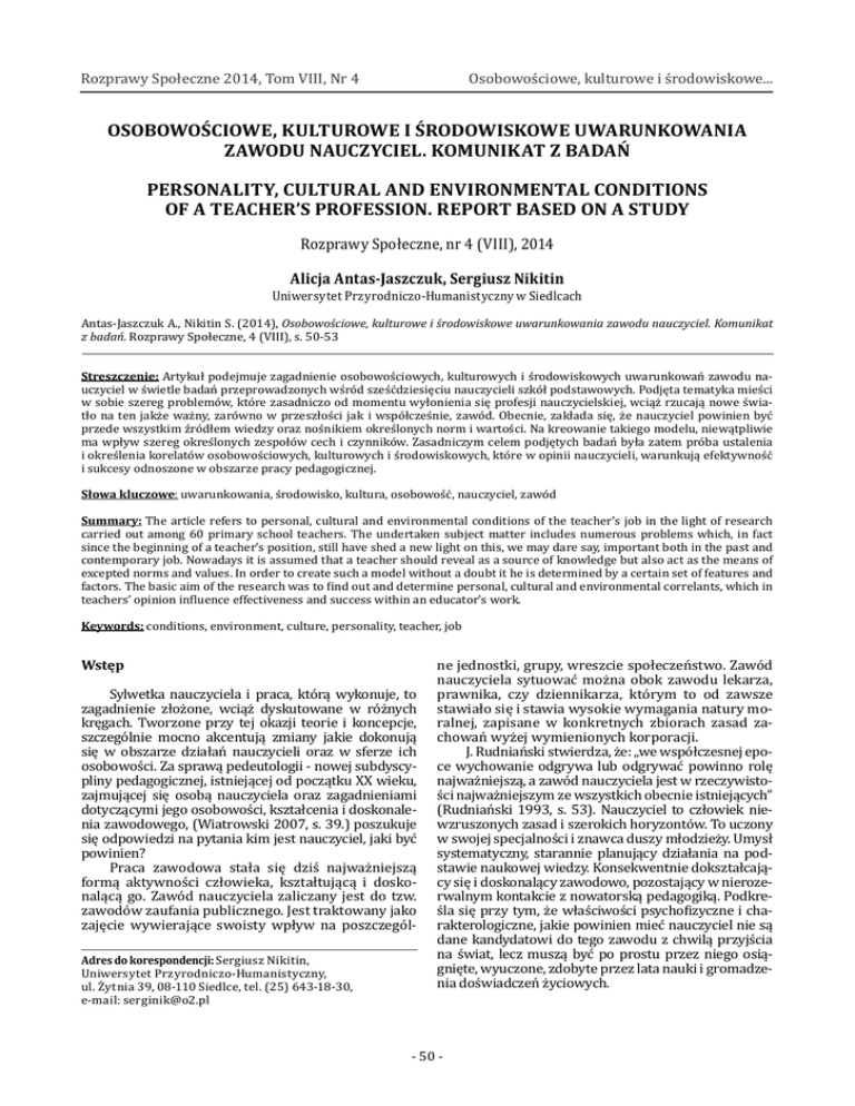 Rozprawy Społeczne 2014, Tom VIII, Nr 4 Osobowościowe, kulturowe i środowiskowe... OSOBOWOŚCIOWE, KULTUROWE I ŚRODOWISKOWE UWARUNKOWANIA ZAWODU NAUCZYCIEL. KOMUNIKAT Z BADAŃ PERSONALITY, CULTURAL AND ENVIRONMENTAL CONDITIONS OF A TEACHER’S PROFESSION. REPORT BASED ON A STUDY Rozprawy Społeczne, nr 4 (VIII), 2014 Alicja Antas-Jaszczuk, Sergiusz Nikitin Uniwersytet Przyrodniczo-Humanistyczny w Siedlcach Antas-Jaszczuk A., Nikitin S. (2014), Osobowościowe, kulturowe i środowiskowe uwarunkowania zawodu nauczyciel. Komunikat z badań. Rozprawy Społeczne, 4 (VIII), s. 50-53 Streszczenie: Artykuł podejmuje zagadnienie osobowościowych, kulturowych i środowiskowych uwarunkowań zawodu nauczyciel w świetle badań przeprowadzonych wśród sześćdziesięciu nauczycieli szkół podstawowych. Podjęta tematyka mieści w sobie szereg problemów, które zasadniczo od momentu wyłonienia się profesji nauczycielskiej, wciąż rzucają nowe światło na ten jakże ważny, zarówno w przeszłości jak i współcześnie, zawód. Obecnie, zakłada się, że nauczyciel powinien być przede wszystkim źródłem wiedzy oraz nośnikiem określonych norm i wartości. Na kreowanie takiego modelu, niewątpliwie ma wpływ szereg określonych zespołów cech i czynników. Zasadniczym celem podjętych badań była zatem próba ustalenia i określenia korelatów osobowościowych, kulturowych i środowiskowych, które w opinii nauczycieli, warunkują efektywność i sukcesy odnoszone w obszarze pracy pedagogicznej. Słowa kluczowe: uwarunkowania, środowisko, kultura, osobowość, nauczyciel, zawód Summary: The article refers to personal, cultural and environmental conditions of the teacher’s job in the light of research carried out among 60 primary school teachers. The undertaken subject matter includes numerous problems which, in fact since the beginning of a teacher’s position, still have shed a new light on this, we may dare say, important both in the past and contemporary job. Nowadays it is assumed that a teacher should reveal as a source of knowledge but also act as the means of excepted norms and values. In order to create such a model without a doubt it he is determined by a certain set of features and factors. The basic aim of the research was to ind out and determine personal, cultural and environmental correlants, which in teachers’ opinion in luence effectiveness and success within an educator’s work. Keywords: conditions, environment, culture, personality, teacher, job Wstęp Sylwetka nauczyciela i praca, którą wykonuje, to zagadnienie złożone, wciąż dyskutowane w różnych kręgach. Tworzone przy tej okazji teorie i koncepcje, szczególnie mocno akcentują zmiany jakie dokonują się w obszarze działań nauczycieli oraz w sferze ich osobowości. Za sprawą pedeutologii - nowej subdyscypliny pedagogicznej, istniejącej od początku XX wieku, zajmującej się osobą nauczyciela oraz zagadnieniami dotyczącymi jego osobowości, kształcenia i doskonalenia zawodowego, (Wiatrowski 2007, s. 39.) poszukuje się odpowiedzi na pytania kim jest nauczyciel, jaki być powinien? Praca zawodowa stała się dziś najważniejszą formą aktywności człowieka, kształtującą i doskonalącą go. Zawód nauczyciela zaliczany jest do tzw. zawodów zaufania publicznego. Jest traktowany jako zajęcie wywierające swoisty wpływ na poszczególAdres do korespondencji: Sergiusz Nikitin, Uniwersytet Przyrodniczo-Humanistyczny, ul. Żytnia 39, 08-110 Siedlce, tel. (25) 643-18-30, e-mail: [email protected] ne jednostki, grupy, wreszcie społeczeństwo. Zawód nauczyciela sytuować można obok zawodu lekarza, prawnika, czy dziennikarza, którym to od zawsze stawiało się i stawia wysokie wymagania natury moralnej, zapisane w konkretnych zbiorach zasad zachowań wyżej wymienionych korporacji. J. Rudniański stwierdza, że: „we współczesnej epoce wychowanie odgrywa lub odgrywać powinno rolę najważniejszą, a zawód nauczyciela jest w rzeczywistości najważniejszym ze wszystkich obecnie istniejących” (Rudniański 1993, s. 53). Nauczyciel to człowiek niewzruszonych zasad i szerokich horyzontów. To uczony w swojej specjalności i znawca duszy młodzieży. Umysł systematyczny, starannie planujący działania na podstawie naukowej wiedzy. Konsekwentnie dokształcający się i doskonalący zawodowo, pozostający w nierozerwalnym kontakcie z nowatorską pedagogiką. Podkreśla się przy tym, że właściwości psycho izyczne i charakterologiczne, jakie powinien mieć nauczyciel nie są dane kandydatowi do tego zawodu z chwilą przyjścia na świat, lecz muszą być po prostu przez niego osiągnięte, wyuczone, zdobyte przez lata nauki i gromadzenia doświadczeń życiowych. - 50 - Rozprawy Społeczne 2014, Tom VIII, Nr 4 Wpływ oceny na dyplomie... Nauczyciel w większym stopniu niż przedstawiciele innych zawodów podlega ciągłym, różnorodnym wpływom środowiska, jest poniekąd od niego uzależniony. Nie bez znaczenia jest również obserwowane, zwłaszcza w ostatnich latach, słabnięcie prestiżu szkoły i zawodu nauczyciela. Przeładowanie” programów nauczania, sprowadzenie nauczyciela do roli „maszyny uczącej” powoduje zmniejszenie odporności na frustrację i stres. Ponadto jest to praca przebiegająca w warunkach ekspozycji społecznej, co łączy się z poddawaniem jednostki stałej ocenie przez innych. Sytuacje w klasie, to często okoliczności stanowiące wyzwanie dla umiejętności i kompetencji nauczyciela, a także dla niego, jako osoby – jego wartości, poglądów przezeń głoszonych, wyrażanych opinii, ocen. Dodatkowo, zwłaszcza w sytuacjach trudnych, wymaga się od nauczyciela podejmowania szybkich i skutecznych decyzji. W zawodzie tym, nauczyciel stale przeciążony jest ogromną liczbą informacji, co wymusza konieczność ciągłej aktywności, nierzadko wykonywania jednocześnie wielu zadań. Swoją pracę nauczyciel organizuje nie tylko poprzez posiadan