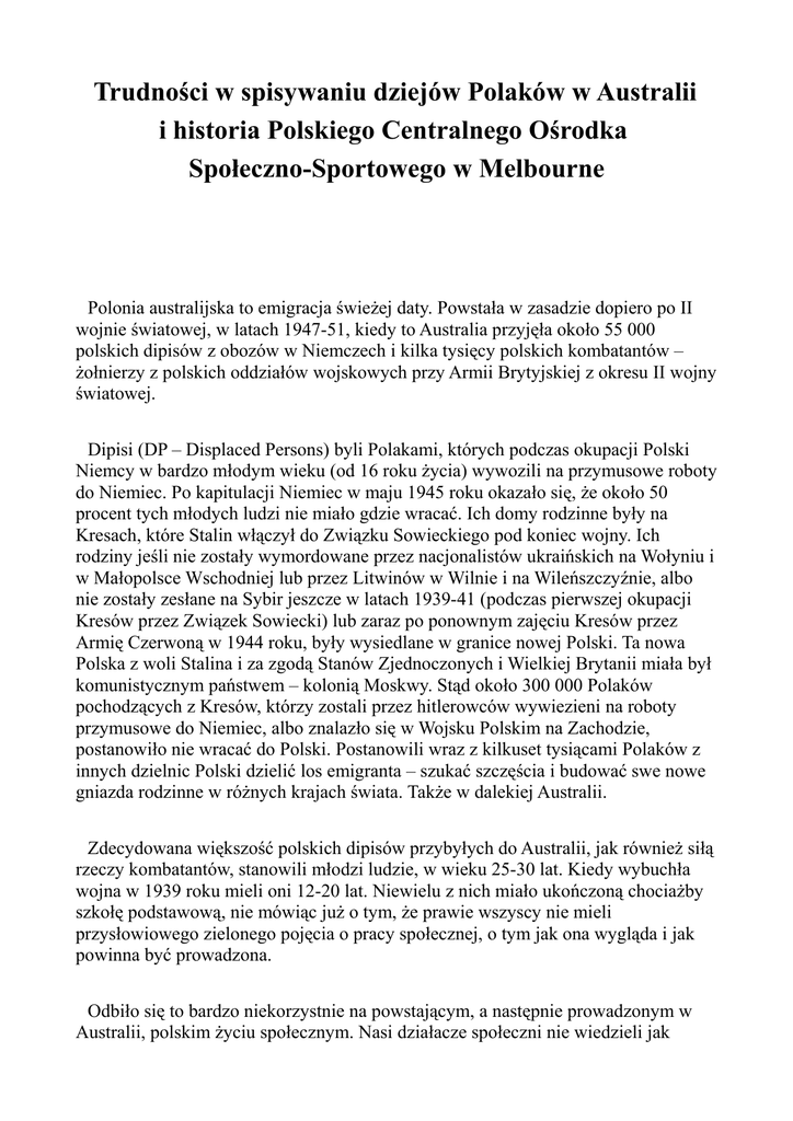 Trudności w spisywaniu dziejów Polaków w Australii i historia Polskiego Centralnego Ośrodka Społeczno-Sportowego w Melbourne Polonia australijska to emigracja świeżej daty. Powstała w zasadzie dopiero po II wojnie światowej, w latach 1947-51, kiedy to Australia przyjęła około 55 000 polskich dipisów z obozów w Niemczech i kilka tysięcy polskich kombatantów – żołnierzy z polskich oddziałów wojskowych przy Armii Brytyjskiej z okresu II wojny światowej. Dipisi (DP – Displaced Persons) byli Polakami, których podczas okupacji Polski Niemcy w bardzo młodym wieku (od 16 roku życia) wywozili na przymusowe roboty do Niemiec. Po kapitulacji Niemiec w maju 1945 roku okazało się, że około 50 procent tych młodych ludzi nie miało gdzie wracać. Ich domy rodzinne były na Kresach, które Stalin włączył do Związku Sowieckiego pod koniec wojny. Ich rodziny jeśli nie zostały wymordowane przez nacjonalistów ukraińskich na Wołyniu i w Małopolsce Wschodniej lub przez Litwinów w Wilnie i na Wileńszczyźnie, albo nie zostały zesłane na Sybir jeszcze w latach 1939-41 (podczas pierwszej okupacji Kresów przez Związek Sowiecki) lub zaraz po ponownym zajęciu Kresów przez Armię Czerwoną w 1944 roku, były wysiedlane w granice nowej Polski. Ta nowa Polska z woli Stalina i za zgodą Stanów Zjednoczonych i Wielkiej Brytanii miała był komunistycznym państwem – kolonią Moskwy. Stąd około 300 000 Polaków pochodzących z Kresów, którzy zostali przez hitlerowców wywiezieni na roboty przymusowe do Niemiec, albo znalazło się w Wojsku Polskim na Zachodzie, postanowiło nie wracać do Polski. Postanowili wraz z kilkuset tysiącami Polaków z innych dzielnic Polski dzielić los emigranta – szukać szczęścia i budować swe nowe gniazda rodzinne w różnych krajach świata. Także w dalekiej Australii. Zdecydowana większość polskich dipisów przybyłych do Australii, jak również siłą rzeczy kombatantów, stanowili młodzi ludzie, w wieku 25-30 lat. Kiedy wybuchła wojna w 1939 roku mieli oni 12-20 lat. Niewielu z nich miało ukończoną chociażby szkołę podstawową, nie mówiąc już o tym, że prawie wszyscy nie mieli przysłowiowego zielonego pojęcia o pracy społecznej, o tym jak ona wygląda i jak powinna być prowadzona. Odbiło się to bardzo niekorzystnie na powstającym, a następnie prowadzonym w Australii, polskim życiu społecznym. Nasi działacze społeczni nie wiedzieli jak fachowo należy pracować w organizacji i jak fachowo ją prowadzić; garść przedwojennych i prawdziwych społeczników była bezradna wobec ignorancji i samowoli większości członków danej organizacji. Np. uchwalane statuty na wzór australijskich organizacji chyba w żadnej polskiej organizacji nie były i zapewne nie są przestrzegane. Niewiele w tej dziedzinie zmieniła druga (z lat 1958-67 – ok. 12 000 osób) i trzecia (posolidarnościowa – z lat 80. XX w. – ponad 20 000 osób) fala emigracji polskiej, gdyż władze w PRL, starające się całkowicie kontrolować społeczeństwo, nie wychowywało je w duchu obywatelskim i społecznym. Ludzie mieli służyć partii, którą kierowali według ustalonych wzorców aparatczycy partyjni. Na prawdziwą pracę społeczną, na prawdziwych społeczników nie było miejsca w PRL. W polskich organizacjach prawie nikt nie dbał np. o archiwum danej organizacji. Po prostu wielu prezesów i sekretarzy organizacji uważało archiwa za swoją prywatną własność i nie oddawało ich swoim następcom. Porządkując po latach swe papiery byli prezesi i sekretarze wyrzucali z tych archiwów co uważali za zbędne, pozostawiając sobie „na pamiątkę” tylko to co ich dotyczyło. Dzisiaj brak archiwów utrudnia badania nad powojenną historią Polaków w Australii. Zresztą nie od dzisiaj. Kiedy w 1978 roku, wspólnie z ówczesnym prezesem Koła SPK Nr 3 w Melbourne, Romanem Zemstą-Maszynowskim, przystąpiliśmy do pisania jego kroniki (25-lecie Stowarzyszenia Polskich Kombatantów Koła Nr 3 w Melbourne 1979) nie mieliśmy prawie żadnego materiału archiwalnego dla niektórych lat. Szczęśliwie żyło wówczas jeszcze dużo członków Koła z pionierskiego okresu i mogliśmy od nich zebrać trochę szczegółów. Dzisiaj nie ma i archiwów i działaczy społecznych z pionierskiego okresu. Wielki szmat historii Polaków w Australii przeminął z wiatrem, został stracony dla historyków. Stąd niewiele organizacji czy instytucji polskich w Australii mogło opracować i wydać swoje dzieje. Problem potęguje i to, że w Australii jest zaledwie kilku zawodowych historyków i w ogóle niewiele osób, które bądź interesują się poważnie, czyli w sposób naukowy, historią Polaków w Australii, bądź umieją pisać prace czy opracowywać zebrane przez siebie materiały. Stąd badania nad historią Polaków w Australii od 1940 roku to prawie dziewiczy temat i dlatego tak mało ukazuje się prac na ten temat, szczególnie w języku polskim. *** W tym roku przypada 25. rocznica rozpoczęcia budowy Polskiego Centralnego Ośrodka Społeczno-Sportowego w Melbourne (w dzielnicy Sunshine-Albion), który jest dzisiaj największą i najbardziej aktywną placówką polską w tym mieście, które jest z kolei największym skupiskiem Polaków w Australii. Z tej okazji zarząd Ośrodka postanowił wydać historię Ośrodka w latach 19842009. Prezes Andrzej Szumny zgłosił się do mnie z prośbą jej napisania. Chociaż jestem aktualnie zajęty pisaniem książki o Polakach w krajach nad Pacyfikiem, wyraziłem zgodę na napisanie historii Ośrodka. Prezes powiedział mi, że otrzymam potrzebny mi materiał archiwalny i wiele dodatkowych informacji od pana Mieczysława Żurka – budowniczego Ośrodka i jego prezesa w latach 1984-97 i 2000-2002 oraz od obecnego sekretarza zarządu. Kiedy przystąpiłem do pracy okazało się jednak, że p. Żurek nie ma archiwum Ośrodka z czasów swej prezesury, ale głównie materiały i ró