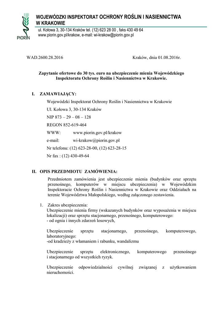 WOJEWÓDZKI INSPEKTORAT OCHRONY ROŚLIN I NASIENNICTWA W KRAKOWIE ul. Kołowa 3, 30-134 Kraków tel. (12) 623 28 00 , faks 430 49 64 www.piorin.gov.pl/krakow, e-mail: [email protected] Kraków, dnia 01.08.2016r. WAD.2600.28.2016 Zapytanie ofertowe do 30 tys. euro na ubezpieczenie mienia Wojewódzkiego Inspektoratu Ochrony Roślin i Nasiennictwa w Krakowie. I. ZAMAWIAJĄCY: Wojewódzki Inspektorat Ochrony Roślin i Nasiennictwa w Krakowie Ul. Kołowa 3, 30-134 Kraków NIP 873 – 29 – 08 – 128 REGON 852-619-464 WWW: www.piorin.gov.pl/krakow e-mail: [email protected] Nr telefonu: (12) 623-28-00, (12) 623-28-15 Nr fax : (12) 430-49-64 II. OPIS PRZEDMIOTU ZAMÓWIENIA: Przedmiotem zamówienia jest ubezpieczenie mienia (budynków oraz sprzętu przenośnego, komputerów w miejscu ubezpieczenia) w Wojewódzkim Inspektoracie Ochrony Roślin i Nasiennictwa w Krakowie oraz Oddziałach na terenie Województwa Małopolskiego, według załączonego zestawienia. 1. Zakres ubezpieczenia: Ubezpieczenie mienia firmy (wskazanych budynków oraz wyposażenia w miejscu lokalizacji) oraz sprzętu stacjonarnego, przenośnego, komputerowego: - od ognia i innych zdarzeń losowych, Ubezpieczenie sprzętu stacjonarnego, przenośnego, laboratoryjnego: -od kradzieży z włamaniem i rabunku, wandalizmu Ubezpieczenie sprzętu elektronicznego, i stacjonarnego od wszystkich ryzyk. Ubezpieczenie odpowiedzialności nieruchomości. cywilnej komputerowego, komputerowego związanej z przenośnego użytkowaniem 2. Okres ubezpieczenia: Od 02 września 2016r. do 01 września 2017r., 3. Płatność w dwóch ratach 4. Zamawiający przyjmuje system sum stałych, franszyza redukcyjna i franszyza integralna zniesiona. III. WARUNKI UDZIAŁU W POSTĘPOWANIU: 1. W postępowaniu mogą brać udział oferenci, którzy posiadają zezwolenia na wykonywanie działalności ubezpieczeniowej (Dz. U. z 2003r. Nr 124 poz. 1151 z późn. zm.). 2. O udzielenie zamówienia mogą ubiegać się Wykonawcy, którzy wyrażą zgodę na: a) Zawarcie poszczególnych polis zgodnie z terminami określonymi w Dziale II pkt 2 b) Objęcie ochroną ubezpieczeniową mienia we wskazanych lokalizacjach na terenie Województwa Małopolskiego. c) Przyjęcie warunków wymaganych dla poszczególnych rodzajów ubezpieczeń wymienionych w dziale V d) Płatność w dwóch ratach. 3. Składający oferty muszą dołączyć : Oświadczenie potwierdzające posiadanie przez nich pełnomocnictwa do wykonywania działalności w zakresie ubezpieczeń (kserokopia opatrzona pieczęcią „za zgodność z oryginałem” i podpis). IV. KRYTERIA WYBORU WYKONAWCY: Wykonawca podaje w ofercie jedną cenę za całość zamówienia, cena musi być podana w złotych polskich z dokładnością do dwóch miejsc po przecinku. Jeżeli wykonawca ma zamiar zaproponować rabaty lub upusty powinien je od razu ująć w obliczeniach ceny, tak aby wyliczona cena za realizację zamówienia była ceną całościową. Późniejsze propozycje obniżek np. w trakcie otwierania ofert nie będą przyjmowane. Do realizacji zamówienia zostanie wybrany Ubezpieczyciel, który zaoferuje najniższą cenę za kompleksowe ubezpieczenie majątku: Sposób wyliczenia: Najniższa cena wśród ofert Cena badanej oferty x100 Zamawiający nie dopuszcza składania ofert częściowych. V. SZCZEGÓŁOWE WARUNKI UBEZPIECZENIA: 1. Ubezpieczenie dotyczące budynków oraz pomieszczeń biurowych. Budynki i pomieszczenia biurowe do ubezpieczenia, wg załączonego wykazu znajdują się na terenie województwa małopolskiego: - Wojewódzki Inspektorat Ochrony Roślin i Nasiennictwa w Krakowie, ul. Kołowa 3, 30-134 Kraków (szklarnia i garaż). - Oddział Bochnia, ul. Konstytucji 3-go Maja 5, 32-700 Bochnia (pomieszczenia biurowe). - Oddział Dąbrowa Tarnowska, ul. Kościuszki 14, 33-200 Dąbrowa Tarnowska (pomieszczenia biurowe, garaż) - Oddział Gorlice, Ropica Polska 325, 38-300 Gorlice (budynek i garaż). - Oddział Limanowa, ul. Matki Boskiej Bolesnej 87, 34-600 Limanowa (Pomieszczenie biurowe). - Oddział Nowy Sącz, ul. Głowackiego 33, 33-300 Nowy Sącz (budynek, szklarnia). - Oddział Miechów, ul. Konopnickiej 23a, 32-200 Miechów (budynek). - Oddział Myślenice, ul. Jordana 4, 32-400 Myślenice (budynek, garaż) - Oddział Olkusz, al. 1000-lecia 13a, 32-300 Olkusz (pomieszczenia biurowe) - Oddział Proszowice, ul. Kopernika 6, 33-100 Proszowice (pomieszczenia biurowe) - Oddział Sucha Beskidzka, ul. Handlowa 1 34-200 Sucha Beskidzka (pomieszczenia biurowe, garaż) - Oddział Oświęcim, ul. Piłsudzkiego 10, 32-600 Oświęcim (budynek). - Oddział Tarnów, ul. Solidarności 5-9, 33-100 Tarnów (pomieszczenia biurowe) - Oddział Zakopane, ul. Sienkiewicza 34, 34-500 Zakopane (budynek). - Wojewódzki Inspektorat Ochrony Roślin i Nasiennictwa w Krakowie ul. Lea 116 pok.67 (pomieszczenia biurowe) Rodzaj ubezpieczenia: Od ognia i innych zdarzeń losowych, uderzenia pioruna (pośrednie i bezpośrednie), wiatru, dymu, osuwania się ziemi, upadku drzewa, masztów i innych przedmiotów na ubezpieczone mienie, powodzi, opadów atmosferycznych jak deszcz nawalny, grad, śnieg, a także skutki będące następstwem obfitych opadów śniegu powodujących uszkodzenie konstrukcji budynku od ciężaru śniegu lub polegające na zalaniu wynikłym z szybkiego topnienia masy śniegowej, ponadto skutki działania lodu i związanych z tym sił, które powodują uszkodzenie elementów budynku, np. rynien, izolacji, awarii urządzeń lub instalacji wodno- kanalizacyjnej lub technologicznej (w tym szkody na przyłączach wodociągowo-kanalizacyjnych, centralnego ogrzewania, gazowych i elektrycznych) oraz od szkód powstałych w wyniku prowadzenia drobnych prac remontowo budowlanych. Ubezpieczenie nieruchomości. 2. odpowiedzialności cywilnej związanej z użytkowaniem Ubezpieczenie sprzętu stacjonarnego, przenośnego, komputerowego i laboratoryjnego: - Od ognia i innych zdarzeń losowych, uderzenia pioruna (pośrednie i bezpośrednie), d
