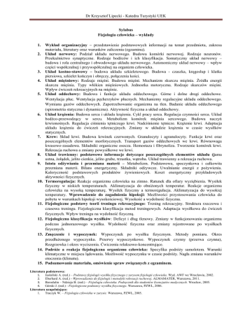 Dr Krzysztof Lipecki - Katedra Turystyki UEK Sylabus Fizjologia człowieka – wykłady 1. 2. 3. 4. 5. 6. 7. 8. 9. 10. 11. 12. 13. 14. 15. Wykład organizacyjny – przedstawienie podstawowych informacji na temat przedmiotu, zakresu materiału, literatury oraz warunków zaliczenia (egzaminu). Układ nerwowy: Podział układu nerwowego. Budowa komórki nerwowej. Rodzaje neuronów. Przekaźnictwo synaptyczne. Rodzaje bodźców i ich klasyfikacja. Somatyczny układ nerwowy – budowa i rola centralnego i obwodowego układu nerwowego. Autonomiczny układ nerwowy – wpływ części współczulnej i przywspółczulnej na organizm człowieka. Układ kostno-stawowy – budowa układu szkieletowego. Budowa - czaszka, kręgosłup i klatka piersiowa, szkielet kończyn i obręczy, połączenia kości. Układ mięśniowy: Rodzaje mięśni. Budowa mięśni. Mechanizm skurczu mięśnia. Źródła energii skurczu mięśnia. Typy włókien mięśniowych. Jednostka motoryczna. Rodzaje skurczów mięśni. Wpływ ćwiczeń rekreacyjnych na mięśnie. Układ oddechowy: Budowa i funkcje układu oddechowego. Górne i dolne drogi oddechowe. Wentylacja płuc. Wentylacja pęcherzyków płucnych. Mechanizmy regulacyjne układu oddechowego. Wymiana gazów oddechowych. Zapotrzebowanie organizmu na tlen. Badanie układu oddechowego (spirometria statyczna i dynamiczna). Aktywność fizyczna a układ oddechowy. Układ krążenia: Budowa serca i układu krążenia. Cykl pracy serca. Regulacja czynności serca. Układ bodźco-przewodzący w sercu. Metabolizm komórek mięśnia sercowego. Budowa naczyń krwionośnych. Regulacja ciśnienia tętniczego krwi. Nadciśnienie tętnicze. Krążenie krwi. Adaptacja układu krążenia do ćwiczeń rekreacyjnych. Zmiany w układzie krążenia w czasie wysiłków statycznych. Krew: Skład krwi. Budowa krwinek czerwonych. Granulocyty i agranulocyty. Funkcje krwi oraz poszczególnych elementów morfotycznych. Transport gazów oddechowych we krwi. Równowaga kwasowo-zasadowa. Składniki organiczne osocza. Hemostaza i fibrynoliza. Tworzenie komórek krwi. Rekreacja ruchowa a zmiany powysiłkowe we krwi. Układ trawienny: podstawowe informacje dotyczące poszczególnych elementów układu (jama ustna, żołądek, jelito cienkie, jelito grube, trzustka, wątroba. Układ trawienny a rekreacja ruchowa. Istota odżywiania i przemiana materii – Metabolizm. Podstawowa, spoczynkowa i całkowita przemiana materii. Bilans energetyczny. Składniki odżywcze. Uwalnianie energii z pożywienia. Kaloryczność podstawowych produktów żywieniowych. Koszt energetyczny przykładowych aktywności fizycznych. Termoregulacja: Reakcje organizmu człowieka na zimno. Ratunek dla ofiary wyziębienia. Wysiłek fizyczny w niskich temperaturach. Aklimatyzacja do obniżonych temperatur. Reakcje organizmu człowieka na wysoką temperaturę. Wysiłek fizyczny a termoregulacja. Aklimatyzacja do wysokiej temperatury. Wprowadzenie do zagadnienia hipoksji: Możliwości przystosowania człowieka do pobytu w warunkach hipoksji wysokościowej. Wysokość a wydolność fizyczna. Fizjologiczne podstawy teorii treningu rekreacyjnego: Trening rekreacyjny. Struktura rzeczowa i czasowa treningu. Fizjologiczna klasyfikacja metod treningowych. Adaptacja wysiłkowa do ćwiczeń fizycznych. Wpływ treningu na wydolność fizyczną. Fizjologiczna klasyfikacja wysiłków: Deficyt i dług tlenowy. Zmiany w funkcjonowaniu organizmu podczas jednorazowego wysiłku. Wydolność fizyczna oraz zmiany rejestrowane po wysiłkach fizycznych. Zmęczenie i wypoczynek: Wypoczynek po wysiłku fizycznym. Metody pomiaru. Okres przedłużonego wypoczynku. Przerwy wypoczynkowe. Wypoczynek czynny (przerwa czynna), Rozgrzewka i okres wyciszenia. Ćwiczenia relaksowo-koncentrujące. Podróże a reakcja fizjologiczna organizmu człowieka: Specyfika podróży samolotem. Warunki klimatyczne w miejscu lądowania. Możliwość wypoczynku w czasie podróży. Nagła zmiana warunków otoczenia (klimatu). Podsumowanie materiału, omówienie spraw związanych z egzaminem. Literatura podstawowa: 1. Jaskólski A. (red.) – Podstawy fizjologii wysiłku fizycznego z zarysem fizjologii człowieka. Wyd. AWF we Wrocławiu, 2002. 2. Eberhard A. (red.) - Wprowadzenie do fizjologii i metodyki rekreacji ruchowej. ALMAMATER, Warszawa, 2011. 3. Borodulin – Ndzieja B. (red.) – Fizjologia człowieka. Podręcznik dla studentów licencjatów medycznych. Wrocław, 2005. 4. Górski J. (red.) - Fizjologiczne podstawy wysiłku fizycznego. Warszawa, PZWL, 2006. Literatura uzupełniająca: 1. Traczyk W. – Fizjologia człowieka w zarysie. Warszawa, PZWL, 2005. Dr Krzysztof Lipecki - Katedra Turystyki UEK Warunki zaliczenia przedmiotu: 1. Warunkiem przystąpienia do egzaminu jest uzyskanie zaliczenia z ćwiczeń! 2. 86% frekwencja na wykładach (możliwe 2 nieobecności) podwyższają ocenę z egzaminu o 0,5 stopnia (do oceny 5.0). 3. Egzamin w formie testowej z koniecznością wpisywania odpowiedzi. 4. Osoby z oceną 5.0 z ćwiczeń oraz minimum 86% frekwencją na wykładach mogą zostać zwolnione z egzaminu z oceną 4,0. Dr Krzysztof Lipecki - Katedra Turystyki UEK Dr Krzysztof Lipecki - Katedra Turystyki UEK