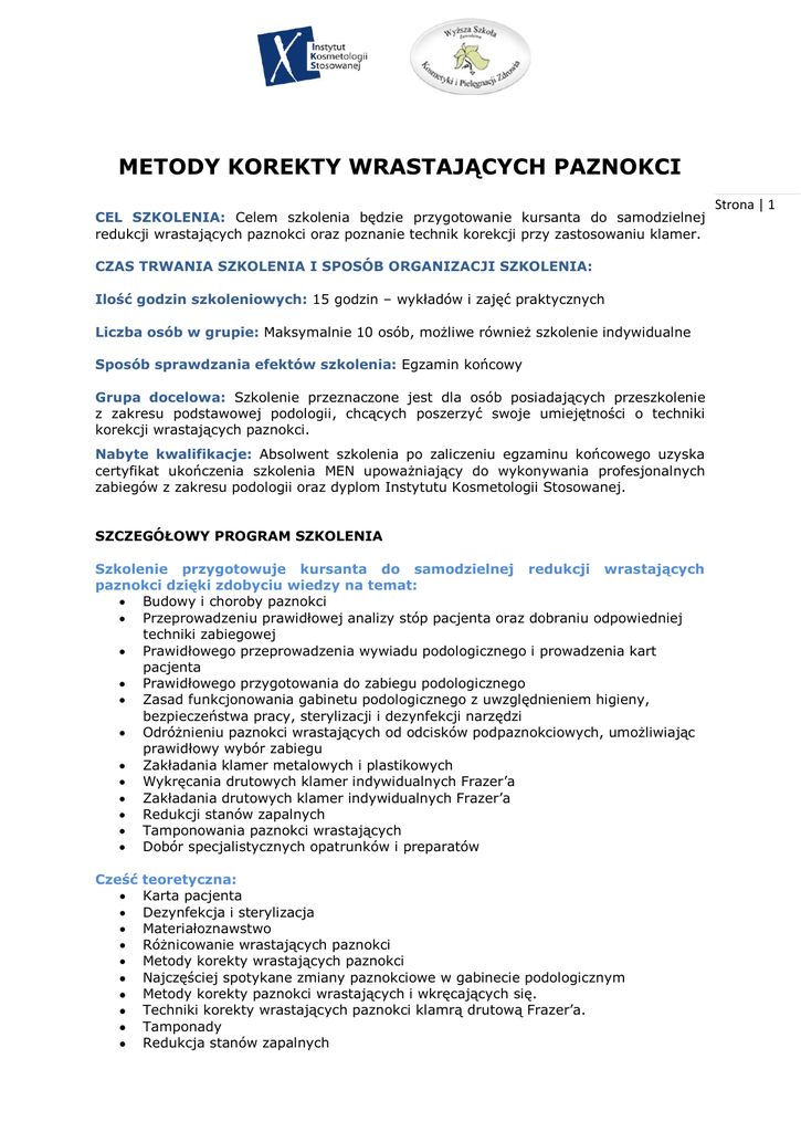 METODY KOREKTY WRASTAJĄCYCH PAZNOKCI CEL SZKOLENIA: Celem szkolenia będzie przygotowanie kursanta do samodzielnej redukcji wrastających paznokci oraz poznanie technik korekcji przy zastosowaniu klamer. CZAS TRWANIA SZKOLENIA I SPOSÓB ORGANIZACJI SZKOLENIA: Ilość godzin szkoleniowych: 15 godzin – wykładów i zajęć praktycznych Liczba osób w grupie: Maksymalnie 10 osób, możliwe również szkolenie indywidualne Sposób sprawdzania efektów szkolenia: Egzamin końcowy Grupa docelowa: Szkolenie przeznaczone jest dla osób posiadających przeszkolenie z zakresu podstawowej podologii, chcących poszerzyć swoje umiejętności o techniki korekcji wrastających paznokci. Nabyte kwalifikacje: Absolwent szkolenia po zaliczeniu egzaminu końcowego uzyska certyfikat ukończenia szkolenia MEN upoważniający do wykonywania profesjonalnych zabiegów z zakresu podologii oraz dyplom Instytutu Kosmetologii Stosowanej. SZCZEGÓŁOWY PROGRAM SZKOLENIA Szkolenie przygotowuje kursanta do samodzielnej redukcji wrastających paznokci dzięki zdobyciu wiedzy na temat: Budowy i choroby paznokci Przeprowadzeniu prawidłowej analizy stóp pacjenta oraz dobraniu odpowiedniej techniki zabiegowej Prawidłowego przeprowadzenia wywiadu podologicznego i prowadzenia kart pacjenta Prawidłowego przygotowania do zabiegu podologicznego Zasad funkcjonowania gabinetu podologicznego z uwzględnieniem higieny, bezpieczeństwa pracy, sterylizacji i dezynfekcji narzędzi Odróżnieniu paznokci wrastających od odcisków podpaznokciowych, umożliwiając prawidłowy wybór zabiegu Zakładania klamer metalowych i plastikowych Wykręcania drutowych klamer indywidualnych Frazer’a Zakładania drutowych klamer indywidualnych Frazer’a Redukcji stanów zapalnych Tamponowania paznokci wrastających Dobór specjalistycznych opatrunków i preparatów Cześć teoretyczna: Karta pacjenta Dezynfekcja i sterylizacja Materiałoznawstwo Różnicowanie wrastających paznokci Metody korekty wrastających paznokci Najczęściej spotykane zmiany paznokciowe w gabinecie podologicznym Metody korekty paznokci wrastających i wkręcających się. Techniki korekty wrastających paznokci klamrą drutową Frazer’a. Tamponady Redukcja stanów zapalnych Strona | 1 Część praktyczna: Tamponowanie wrastających paznokci Metody korekty wrastających paznokci Korekta paznokci przy użyciu klamer plastikowych Korekta paznokci przy użyciu klamer metalowych Prawidłowe przygotowanie paznokci wrastających i wkręcających się do założenia klamry Nauka wykręcania klamer indywidualnych Korekta paznokci przy użyciu klamer drutowych Frazer’a Zakładanie specjalistycznych opatrunków redukujących stany zapalne Uczestnik kursu otrzymuje: Pełen zakres materiałów dydaktycznych W pełni wyposażone stanowisko pracy Odpowiednio dobranych modeli Certyfikat MEN upoważniający do wykonywania zabiegów z zakresu podologii Cena jednostkowa szkolenia: 1200,00 zł * *jeżeli kursant zastrzega sobie samodzielne uczestnictwo w kursie (Kurs indywidualny) cena zwiększona jest o 5 % Osoby zainteresowane uczestnictwem w szkoleniu proszone są o kontakt z Panią Anetą Opielowską pod numerem telefonu: 728 577 885 lub adresem e-mail: [email protected] SERDECZNIE ZAPRASZAMY! Strona | 2