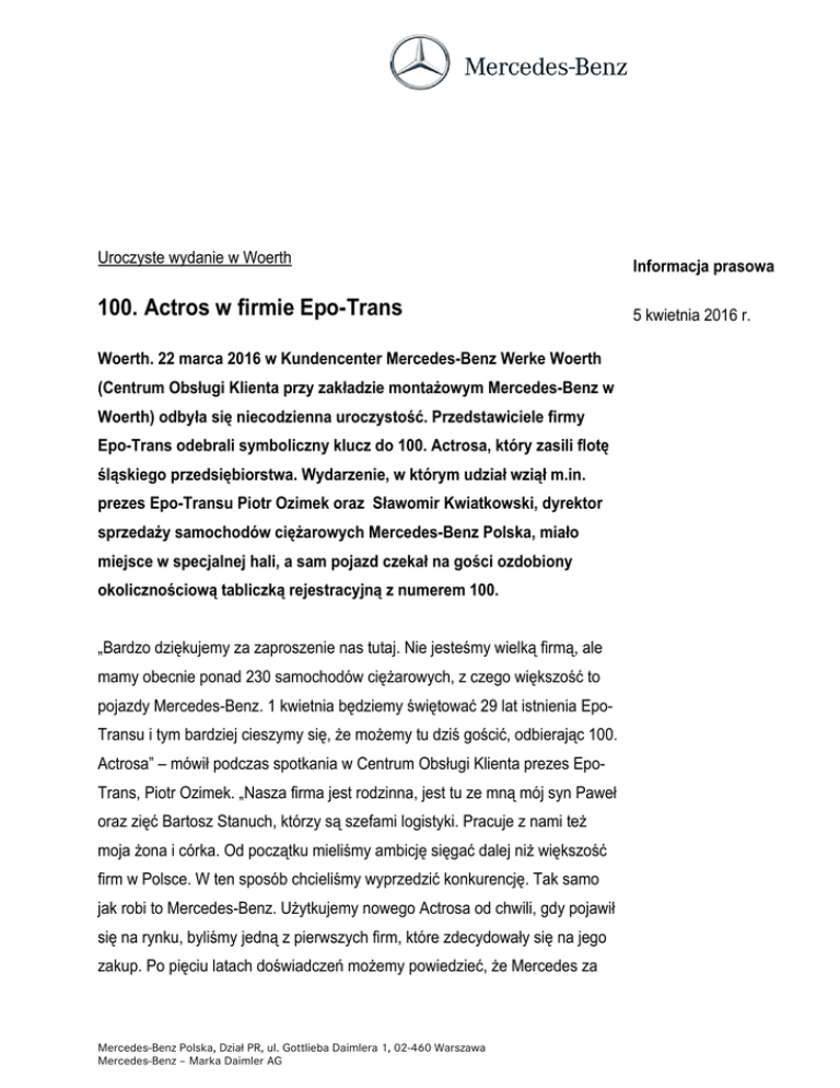 Uroczyste wydanie w Woerth 100. Actros w firmie Epo-Trans Woerth. 22 marca 2016 w Kundencenter Mercedes-Benz Werke Woerth (Centrum Obsługi Klienta przy zakładzie montażowym Mercedes-Benz w Woerth) odbyła się niecodzienna uroczystość. Przedstawiciele firmy Epo-Trans odebrali symboliczny klucz do 100. Actrosa, który zasili flotę śląskiego przedsiębiorstwa. Wydarzenie, w którym udział wziął m.in. prezes Epo-Transu Piotr Ozimek oraz Sławomir Kwiatkowski, dyrektor sprzedaży samochodów ciężarowych Mercedes-Benz Polska, miało miejsce w specjalnej hali, a sam pojazd czekał na gości ozdobiony okolicznościową tabliczką rejestracyjną z numerem 100. „Bardzo dziękujemy za zaproszenie nas tutaj. Nie jesteśmy wielką firmą, ale mamy obecnie ponad 230 samochodów ciężarowych, z czego większość to pojazdy Mercedes-Benz. 1 kwietnia będziemy świętować 29 lat istnienia EpoTransu i tym bardziej cieszymy się, że możemy tu dziś gościć, odbierając 100. Actrosa” – mówił podczas spotkania w Centrum Obsługi Klienta prezes EpoTrans, Piotr Ozimek. „Nasza firma jest rodzinna, jest tu ze mną mój syn Paweł oraz zięć Bartosz Stanuch, którzy są szefami logistyki. Pracuje z nami też moja żona i córka. Od początku mieliśmy ambicję sięgać dalej niż większość firm w Polsce. W ten sposób chcieliśmy wyprzedzić konkurencję. Tak samo jak robi to Mercedes-Benz. Użytkujemy nowego Actrosa od chwili, gdy pojawił się na rynku, byliśmy jedną z pierwszych firm, które zdecydowały się na jego zakup. Po pięciu latach doświadczeń możemy powiedzieć, że Mercedes za Mercedes-Benz Polska, Dział PR, ul. Gottlieba Daimlera 1, 02-460 Warszawa Mercedes-Benz – Marka Daimler AG Informacja prasowa 5 kwietnia 2016 r. Strona 2 pomocą nowego Actrosa zdeklasował konkurencję, szczególnie jeśli chodzi o zużycie paliwa”. Spotkanie w Centrum Obsługi Klienta Gości z Polski przywitała w Woerth pani Renate Brunner, szefowa Centrum Obsługi Klienta, zarządzająca też programem szkoleń ProfiTraining oraz międzynarodowym programem FuelDuel. Z firmy Epo-Trans na uroczyste wydanie przybyli: prezes Piotr Ozimek, Paweł Ozimek i Bartosz Stanuch, szefowie logistyki, oraz Bohdan Osmalek, kierownik floty. Towarzyszyli im dyrektor Sławomir Kwiatkowski oraz Tomasz Ciesielski, manager produktu i marketingu z Mercedes-Benz Polska, a także przedstawiciele dealera Mercedes-Benz Sosnowiec: Rafał Ulatowski, dyrektor handlowy, i Mariusz Urbański, doradca. Spotkanie w Woerth rozpoczęło się od krótkiej dyskusji przed uroczystym pojazdu. Goście zwracali uwagę na aspekt szkolenia kierowców w zakresie ekonomicznej jazdy. Jak podkreśliła Renate Brunner, takie szkolenie jest podstawowym elementem wydania pojazdu i późniejszego jego użytkowania, gdyż dopiero przeszkolony kierowca może zapewnić klientowi optymalną eksploatację nowoczesnego ciągnika, jakim jest Actros. W Polsce zajmują się tym certyfikowani trenerzy Mercedes-Benz Trucker Academy, którzy oferują klientom pełną gamę szkoleń dostosowanych do indywidualnych potrzeb klienta.”Nawet bardzo doświadczeni kierowcy w naszej firmie przyznali, że aby wydobyć potencjał drzemiący w takim pojeździe jak Actros, szkolenie jest niezbędne – wymaga tego stopień zaawansowania technologicznego, który bez odpowiedniej wiedzy nie zostanie wykorzystany” – mówił z kolei Piotr Ozimek. „Z moich wyliczeń wynika, że to się po prostu opłaca: oszczędności, Mercedes-Benz Polska, Dział PR, ul. Gottlieba Daimlera 1, 02-460 Warszawa Mercedes-Benz – Marka Daimler AG Strona 3 które zyskuję rocznie dzięki właściwej eksploatacji nowych Actrosów stanowią równowartość trzech nowych ciągników”. Z wizytą w fabryce Po lunchu w kantynie gości czekała wycieczka po największym na świecie zakładzie montażowym samochodów ciężarowych. Z taśm Mercedes-Benz Werke Woerth dziennie zjeżdża ok. 450 pojazdów w różnych specyfikacjach i różnych modeli. Około 150 ciężarówek rocznie jest przekazywanych klientom bezpośrednio w przyfabrycznym Centrum Obsługi Klienta. Z okazji symbolicznego przekazania 100. Actrosa firmie Epo-Trans goście mogli osobiście zwiedzić z przewodniczką niemal cały zakład i prawie wszystkie etapy produkcji Actrosa, Arocsa i Antosa. Wyjątkiem była lakiernia, która ze względu na wymogi sterylności jest niedostępna dla zwiedzających. Ogromne wrażenie na gościach zrobiły m.in. ogrody robotów – wydzielone przestrzenie pracy specjalistycznych robotów, które wykonywały np. spawanie kabin. Nawet jednak wysoce zautomatyzowana produkcja wymaga udziału ludzi – tych pracuje w Woerth ok. 12 tys. Podzieleni na zespoły, wśród których istotną rolę odgrywa kontrola jakości na każdym etapie produkcji, stanowią grupę doskonałych fachowców-mechaników. Dzięki ich pracy pusta skorupa kabiny po czterech dniach cyklu produkcyjnego zamienia się w kompletnie wyposażoną ciężarówkę, która zjeżdżając z taśmy, przechodzi testy wszystkich systemów, aby w pełni funkcjonalna i bezpieczna mogła trafić do klienta. Dzień w Woerth zakończyła uroczysta kolacja połączona z wręczeniem modelu Actrosa. Następnego dnia gości z firmy Epo-Trans czekała jeszcze wizyta w muzeum Mercedes-Benz w Stuttgarcie. Mercedes-Benz Polska, Dział PR, ul. Gottlieba Daimlera 1, 02-460 Warszawa Mercedes-Benz – Marka Daimler AG Strona 4 Kontakt: Tomasz Ciesielski Tel. +48 22 3127315 [email protected] Mercedes-Benz Polska, Dział PR, ul. Gottlieba Daimlera 1, 02-460 Warszawa Mercedes-Benz – Marka Daimler AG