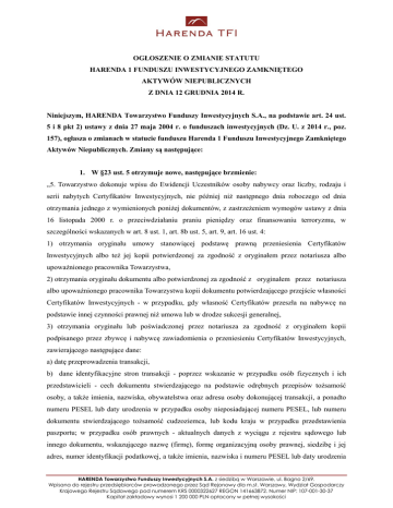 OGŁOSZENIE O ZMIANIE STATUTU HARENDA 1 FUNDUSZU INWESTYCYJNEGO ZAMKNIĘTEGO AKTYWÓW NIEPUBLICZNYCH Z DNIA 12 GRUDNIA 2014 R. Niniejszym, HARENDA Towarzystwo Funduszy Inwestycyjnych S.A., na podstawie art. 24 ust. 5 i 8 pkt 2) ustawy z dnia 27 maja 2004 r. o funduszach inwestycyjnych (Dz. U. z 2014 r., poz. 157), ogłasza o zmianach w statucie funduszu Harenda 1 Funduszu Inwestycyjnego Zamkniętego Aktywów Niepublicznych. Zmiany są następujące: 1. W §23 ust. 5 otrzymuje nowe, następujące brzmienie: „5. Towarzystwo dokonuje wpisu do Ewidencji Uczestników osoby nabywcy oraz liczby, rodzaju i serii nabytych Certyfikatów Inwestycyjnych, nie później niż następnego dnia roboczego od dnia otrzymania jednego z wymienionych poniżej dokumentów, z zastrzeżeniem wymogów ustawy z dnia 16 listopada 2000 r. o przeciwdziałaniu praniu pieniędzy oraz finansowaniu terroryzmu, w szczególności wskazanych w art. 8 ust. 1, art. 8b ust. 5, art. 9, art. 16 ust. 4: 1) otrzymania oryginału umowy stanowiącej podstawę prawną przeniesienia Certyfikatów Inwestycyjnych albo też jej kopii potwierdzonej za zgodność z oryginałem przez notariusza albo upoważnionego pracownika Towarzystwa, 2) otrzymania oryginału dokumentu albo potwierdzonej za zgodność z oryginałem przez notariusza albo upoważnionego pracownika Towarzystwa kopii dokumentu potwierdzającego przejście własności Certyfikatów Inwestycyjnych - w przypadku, gdy własność Certyfikatów przeszła na nabywcę na podstawie innej czynności prawnej niż umowa lub w drodze sukcesji generalnej, 3) otrzymania oryginału lub poświadczonej przez notariusza za zgodność z oryginałem kopii podpisanego przez zbywcę i nabywcę zawiadomienia o przeniesieniu Certyfikatów Inwestycyjnych, zawierającego następujące dane: a) datę przeprowadzenia transakcji, b) dane identyfikacyjne stron transakcji - poprzez wskazanie w przypadku osób fizycznych i ich przedstawicieli - cech dokumentu stwierdzającego na podstawie odrębnych przepisów tożsamość osoby, a także imienia, nazwiska, obywatelstwa oraz adresu osoby dokonującej transakcji, a ponadto numeru PESEL lub daty urodzenia w przypadku osoby nieposiadającej numeru PESEL, lub numeru dokumentu stwierdzającego tożsamość cudzoziemca, lub kodu kraju w przypadku przedstawienia paszportu; w przypadku osób prawnych - aktualnych danych z wyciągu z rejestru sądowego lub innego dokumentu, wskazującego nazwę (firmę), formę organizacyjną osoby prawnej, siedzibę i jej adres, numer identyfikacji podatkowej, a także imienia, nazwiska i numeru PESEL lub daty urodzenia HARENDA Towarzystwo Funduszy Inwestycyjnych S.A. z siedzibą w Warszawie, ul. Bagno 2/69. Wpisana do rejestru przedsiębiorców prowadzonego przez Sąd Rejonowy dla m.st. Warszawy, Wydział Gospodarczy Krajowego Rejestru Sądowego pod numerem KRS 0000322627 REGON 141663872. Numer NIP: 107-001-30-37 Kapitał zakładowy wynosi 1 200 000 PLN opłacony w pełnej wysokości w przypadku osoby nieposiadającej numeru PESEL, osoby reprezentującej tę osobę prawną; w przypadku jednostek organizacyjnych niemających osobowości prawnej - aktualnych danych z dokumentu wskazującego nazwę, formę organizacyjną, siedzibę i jej adres, numer identyfikacji podatkowej, a także imienia, nazwiska i numeru PESEL lub daty urodzenia w przypadku osoby nieposiadającej numeru PESEL, osoby reprezentującej tę jednostkę, c) liczba, rodzaj i seria nabytych Certyfikatów Inwestycyjnych, d) cenę nabycia Certyfikatów, e) walutę transakcji, f) rodzaj transakcji, g) numery rachunków, które zostały wykorzystane do przeprowadzenia transakcji, w przypadku transakcji z udziałem takich rachunków. h) beneficjentów rzeczywistych (poprzez wskazanie osoby fizycznej i jej danych w zakresie imienia, nazwiska oraz adresu).”. 2. W §23 dodaje się ust. 7 w brzmieniu: „7. Towarzystwo ma prawo żądać informacji przewidzianych ustawą o przeciwdziałaniu praniu pieniędzy oraz finansowaniu terroryzmu, w szczególności dotyczących beneficjenta rzeczywistego.”. 3. W §26 ust. 3 otrzymuje nowe, następujące brzmienie: „W przypadku Zbycia Certyfikatów Inwestycyjnych niezgodnie z warunkami lub trybem określonym powyżej, Towarzystwo odmówi wpisu nabywcy Certyfikatów Inwestycyjnych do Ewidencji Uczestników Funduszu, z zastrzeżeniem treści ust. 3a poniżej.”. 4. W §26 dodaje się ust. 3a w brzmieniu: „3a. Ograniczenia, określone w ust. 1 – 3 nie dotyczą przypadku Zbycia Certyfikatów Inwestycyjnych na rzecz innego uczestnika Funduszu.”. Pozostałe postanowienia statutu funduszu pozostają bez zmian. Powyższe zmiany w statucie Harenda 1 FIZ Aktywów Niepublicznych wchodzą w życie z dniem dokonania niniejszego ogłoszenia o zmianie statutu. 2