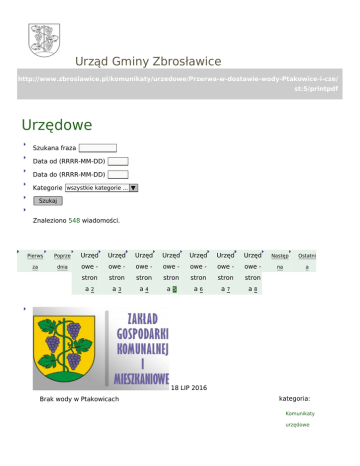 Urząd Gminy Zbrosławice http://www.zbroslawice.pl/komunikaty/urzedowe/Przerwa-w-dostawie-wody-Ptakowice-i-cze/ st:5/printpdf Urzędowe Szukana fraza Data od (RRRR-MM-DD) Data do (RRRR-MM-DD) Kategorie wszystkie kategorie ... ▼ Szukaj Znaleziono 548 wiadomości. Pierws Poprze Urzęd Urzęd Urzęd Urzęd Urzęd Urzęd Urzęd Następ Ostatni za dnia owe - owe - owe - owe - owe - owe - owe - na a stron stron stron stron stron stron stron a2 a3 a4 a6 a7 a8 a 5 18 LIP 2016 Brak wody w Ptakowicach kategoria: Komunikaty urzędowe Zakład Gospodarki Komunalnej i Mieszkaniowej w Zbrosławicach zawiadamia, że w Ptakowicach w dniu 19.07.2016 w godzinach 8:00-13:00 wystąpi przerwa w dostawie wody z powodu prac na sieci wodociągowej.W wyniku wykonywanych prac mogą wystąpić zabrudzenia wody spowodowane zaburzeniami przepływów na sieci.Przepraszamy za utrudnienia. 15 LIP 2016 kategoria: Lokalny Program Rewitalizacji - druga ankieta Komunikaty urzędowe Szanowni Państwo,W związku z pracami prowadzonymi przez Gminę Zbrosławice nad opracowaniem „Programu Rewitalizacji dla gminy Zbrosławice" pragniemy zachęcić Państwa do wypełnienia poniższej ankiety, która będzie podstawą do określenia problemów występujących na obszarze gminy oraz wskazania działań do ich zniwelowania. Zebrane dane ankietowe, będą elementem pogłębionej diagnozy sytuacji kryzysowej, która jest podstawą 15 LIP 2016 Ogłoszenie o naborze na stanowisko głównego księgowego w GOPS kategoria: Komunikaty urzędowe Ogłoszono nabór na stanowisko GŁÓWNEGO KSIĘGOWEGO w Gminnym Ośrodku Pomocy Społecznej W Zbrosławicach. Pełna treść ogłoszenia znajduje się w biuletynie informacji publicznej. 14 LIP 2016 kategoria: Uwaga Brak Wody Aktualności Zawiadomienie 14 LIP 2016 INFORMACJA BRAK WODY 28 CZE 2016 kategoria: LOKALNY PROGRAM REWITALIZACJI Komunikaty urzędowe Szanowni Państwo,W związku z przystąpieniem przez Gminę Zbrosławice do opracowania „Programu Rewitalizacji dla Gminy Zbrosławice" pragniemy zachęcić Państwa do wypełnienia ankiety, która będzie podstawą do wytyczenia obszarów wymagających interwencji w ramach działań rewitalizacyjnych.Informujemy że ankieta ma charakter anonimowy. Wypełnioną ankietę prosimy do dnia 12 lipca 2016 r. przesłać w dowolny, 28 CZE 2016 Informacja Międzygminnego Związku Komunikacji Pasażerskiej kategoria: Komunikaty urzędowe Informujemy, że w dniach 2 i 3 lipca 2016r będą prowadzone prace drogowe na ulicy Dworcowej w Wieszowie uniemożliwiające przejazd autobusów. W związku z powyższym dla autobusów linii 132 i 134 ustala się przystanek końcowy przy hurtowni mięsnej „Wojtacha" w rejonie skrzyżowania ulicy Bytomskiej i Robotniczej.Przystanki przy ulicy Dworcowej w tych dniach nie będą obsługiwane. 27 CZE 2016 kategoria: DOFINANSOWANIE DLA MIESZKAŃCÓW Komunikaty urzędowe Urząd Gminy Zbrosławice informuje o ogłoszonym przez Wojewódzki Fundusz Ochrony Środowiska i Gospodarki Wodnej w Katowicach Pilotażowym Programie "Dofinansowanie zadań realizowanych przez mieszkańców województwa śląskiego na rzecz ograniczenia niskiej emisji". W uruchamianym pilotażowym Programie Funduszu o udzielenie dofinansowania w formie dotacji będą mogły się ubiegać osoby fizyczne będące 22 CZE 2016 e-Urząd - opis systemu kategoria: Aktualności e-Urząd to bezpieczny system informatyczny, umożliwiający mieszkańcom dostęp przez Internet do części danych z wewnętrznego systemu informatycznego Urzędu Gminy. Połączenie pomiędzy platformą i komputerem klienta jest szyfrowane. 21 CZE 2016 kategoria: Brak wody w Kopienicy i Łubiu Komunikaty urzędowe Zakład Gospodarki Komunalnej i Mieszkaniowej w Zbrosławicach zawiadamia, że w Kopienicy i Łubiu w dniu 22.06.2016 w godzinach 9:00-16:00 wystąpi przerwa w dostawie wody z powodu prac na sieci wodociągowej.W wyniku wykonywanych prac mogą wystąpić zabrudzenia wody spowodowane zaburzeniami przepływów na sieci.Przepraszamy za utrudnienia. Pierws Poprze Urzęd Urzęd Urzęd Urzęd Urzęd Urzęd Urzęd Następ Ostatni za dnia owe - owe - owe - owe - owe - owe - owe - na a stron stron stron stron stron stron stron a2 a3 a4 a6 a7 a8 a 5