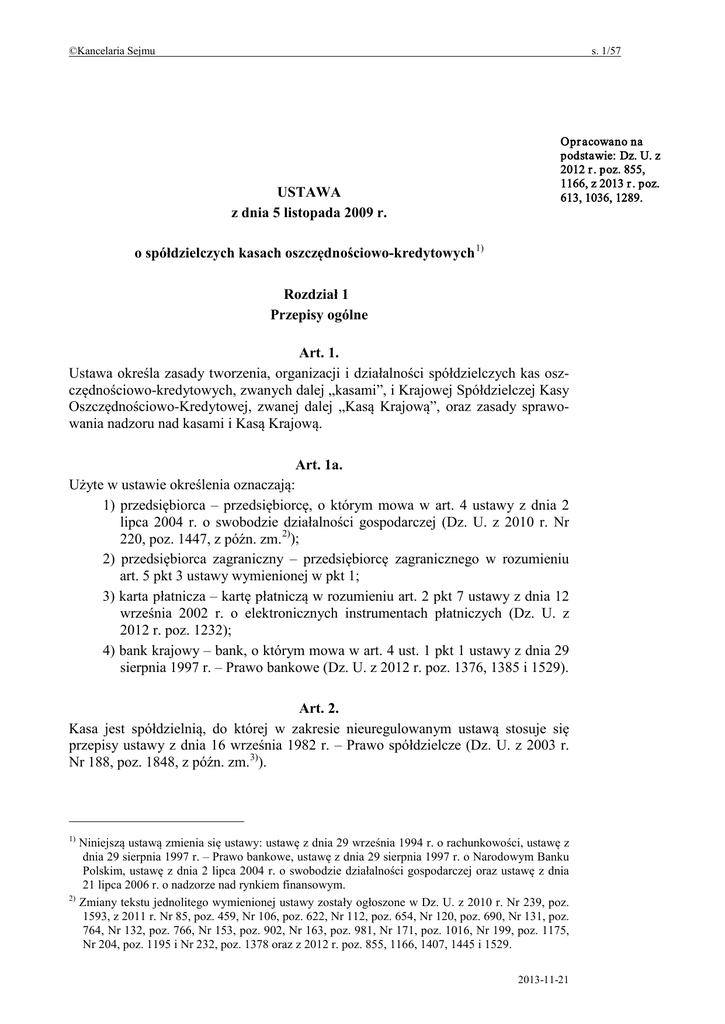 ©Kancelaria Sejmu s. 1/57 USTAWA z dnia 5 listopada 2009 r. Opr acowano na podstawie: Dz. U. z 2012 r . poz. 855, 1166, z 2013 r . poz. 613, 1036, 1289. o spółdzielczych kasach oszczędnościowo-kredytowych 1) Rozdział 1 Przepisy ogólne Art. 1. Ustawa określa zasady tworzenia, organizacji i działalności spółdzielczych kas oszczędnościowo-kredytowych, zwanych dalej „kasami”, i Krajowej Spółdzielczej Kasy Oszczędnościowo-Kredytowej, zwanej dalej „Kasą Krajową”, oraz zasady sprawowania nadzoru nad kasami i Kasą Krajową. Art. 1a. Użyte w ustawie określenia oznaczają: 1) przedsiębiorca – przedsiębiorcę, o którym mowa w art. 4 ustawy z dnia 2 lipca 2004 r. o swobodzie działalności gospodarczej (Dz. U. z 2010 r. Nr 220, poz. 1447, z późn. zm. 2)); 2) przedsiębiorca zagraniczny – przedsiębiorcę zagranicznego w rozumieniu art. 5 pkt 3 ustawy wymienionej w pkt 1; 3) karta płatnicza – kartę płatniczą w rozumieniu art. 2 pkt 7 ustawy z dnia 12 września 2002 r. o elektronicznych instrumentach płatniczych (Dz. U. z 2012 r. poz. 1232); 4) bank krajowy – bank, o którym mowa w art. 4 ust. 1 pkt 1 ustawy z dnia 29 sierpnia 1997 r. – Prawo bankowe (Dz. U. z 2012 r. poz. 1376, 1385 i 1529). Art. 2. Kasa jest spółdzielnią, do której w zakresie nieuregulowanym ustawą stosuje się przepisy ustawy z dnia 16 września 1982 r. – Prawo spółdzielcze (Dz. U. z 2003 r. Nr 188, poz. 1848, z późn. zm.3)). Niniejszą ustawą zmienia się ustawy: ustawę z dnia 29 września 1994 r. o rachunkowości, ustawę z dnia 29 sierpnia 1997 r. – Prawo bankowe, ustawę z dnia 29 sierpnia 1997 r. o Narodowym Banku Polskim, ustawę z dnia 2 lipca 2004 r. o swobodzie działalności gospodarczej oraz ustawę z dnia 21 lipca 2006 r. o nadzorze nad rynkiem finansowym. 2) Zmiany tekstu jednolitego wymienionej ustawy zostały ogłoszone w Dz. U. z 2010 r. Nr 239, poz. 1593, z 2011 r. Nr 85, poz. 459, Nr 106, poz. 622, Nr 112, poz. 654, Nr 120, poz. 690, Nr 131, poz. 764, Nr 132, poz. 766, Nr 153, poz. 902, Nr 163, poz. 981, Nr 171, poz. 1016, Nr 199, poz. 1175, Nr 204, poz. 1195 i Nr 232, poz. 1378 oraz z 2012 r. poz. 855, 1166, 1407, 1445 i 1529. 1) 2013-11-21 ©Kancelaria Sejmu s. 2/57 Art. 3. 1. Celem kas jest gromadzenie środków pieniężnych wyłącznie swoich członków, udzielanie im pożyczek i kredytów, przeprowadzanie na ich zlecenie rozliczeń finansowych oraz pośredniczenie przy zawieraniu umów ubezpieczenia na zasadach określonych w ustawie z dnia 22 maja 2003 r. o pośrednictwie ubezpieczeniowym (Dz. U. Nr 124, poz. 1154, z późn. zm.4)). 1a. Kasa, po uzyskaniu zezwolenia Komisji Nadzoru Finansowego, o którym mowa w art. 32 ust. 2 ustawy z dnia 27 maja 2004 r. o funduszach inwestycyjnych (Dz. U. Nr 146, poz. 1546, z późn. zm.5)), może pośredniczyć w zbywaniu i odkupywaniu jednostek uczestnictwa funduszy inwestycyjnych lub tytułów uczestnictwa funduszy zagranicznych, funduszy inwestycyjnych otwartych z siedzibą w państwach należących do Organizacji Współpracy Gospodarczej i Rozwoju (OECD) innych niż państwo członkowskie Unii Europejskiej lub państwo należące do Europejskiego Obszaru Gospodarczego (EEA). 2. Do rozliczeń, o których mowa w ust. 1, stosuje się odpowiednio przepisy ustawy z dnia 29 sierpnia 1997 r. – Prawo bankowe (Dz. U. z 2012 r. poz. 1376, z późn. zm.6)) o bankowych rozliczeniach pieniężnych oraz przepisy ustawy z dnia 19 sierpnia 2011 r. o usługach płatniczych (Dz. U. Nr 199, poz. 1175, z późn. zm. 7)) w zakresie świadczenia usług płatniczych. 3. Kasy oraz Kasa Krajowa są uprawnione do wydawania pieniądza elektronicznego na rzecz członków kas, na zasadach określonych w ustawie z dnia 19 sierpnia 2011 r. o usługach płatniczych. Art. 4. Do stosunków zobowiązaniowych pomiędzy kasami a ich członkami, o których mowa w art. 3 ust. 1 i 1a, stosuje się przepisy ustawy z dnia 16 lutego 2007 r. o ochronie konkurencji i konsumentów (Dz. U. Nr 50, poz. 331, z późn. zm.8)) w zakresie praktyk naruszających zbiorowe interesy konsumentów. Zmiany tekstu jednolitego wymienionej ustawy zostały ogłoszone w Dz. U. z 2004 r. Nr 99, poz. 1001, z 2005 r. Nr 122, poz. 1024, z 2006 r. Nr 94, poz. 651, z 2007 r. Nr 125, poz. 873, z 2008 r. Nr 163, poz. 1014, Nr 225, poz. 1503 oraz z 2009 r. Nr 77, poz. 649. 4) Zmiany wymienionej ustawy zostały ogłoszone w Dz. U. z 2004 r. Nr 96, poz. 959, z 2005 r. Nr 48, poz. 447, Nr 167, poz. 1396 i Nr 183, poz. 1538, z 2006 r. Nr 157, poz. 1119 oraz z 2009 r. Nr 18, poz. 97 i Nr 42, poz. 341. 5) Zmiany wymienionej ustawy zostały ogłoszone w Dz. U. z 2005 r. Nr 83, poz. 719, Nr 183, poz. 1537 i 1538 i Nr 184, poz. 1539, z 2006 r. Nr 157, poz. 1119, z 2007 r. Nr 112, poz. 769, z 2008 r. Nr 231, poz. 1546, z 2009 r. Nr 18, poz. 97, Nr 42, poz. 341, Nr 168, poz. 1323 i Nr 201, poz. 1540, z 2010 r. Nr 81, poz. 530, Nr 106, poz. 670, Nr 126, poz. 853 i Nr 182, poz. 1228, z 2011 r. Nr 106, poz. 622, Nr 152, poz. 900 i Nr 234, poz. 1389 i 1391, z 2012 r. poz. 596, 1385 i 1529 oraz z 2013 r. poz. 70 i 433. 6) Zmiany tekstu jednolitego wymienionej ustawy zostały ogłoszone w Dz. U. z 2012 r. poz. 1385 i 1529 oraz z 2013 r. poz. 777 i 1036. 7) Zmiany wymienionej ustawy zostały ogłoszone w Dz. U. z 2011 r. Nr 291, poz. 1707, z 2012 r. poz. 1166 oraz z 2013 r. poz. 1036. 8) Zmiany wymienionej ustawy zostały ogłoszone w Dz. U. z 2007 r. Nr 99, poz. 660 i Nr 171, poz. 1206, z 2008 r. Nr 157, poz. 976, Nr 223, poz. 1458 i Nr 227, poz. 1505, z 2009 r. Nr 18, poz. 97 i Nr 157, poz. 1241 oraz z 2011 r. Nr 34, poz. 173. 3) 2013-11-21 ©Kancelaria Sejmu s. 3/57 Art. 5. Nazwa „spółdzielcza kasa oszczędnościowo-kredytowa” może być używana wyłącznie przez podmioty zwane „kasami” w rozumieniu ustawy. Art. 6. W przypadku gdy kasa została utworzona w zakładzie pracy, warunki współpracy między kasą a pracodawcą oraz zakres świadczeń pracodawcy na rzecz kasy okre