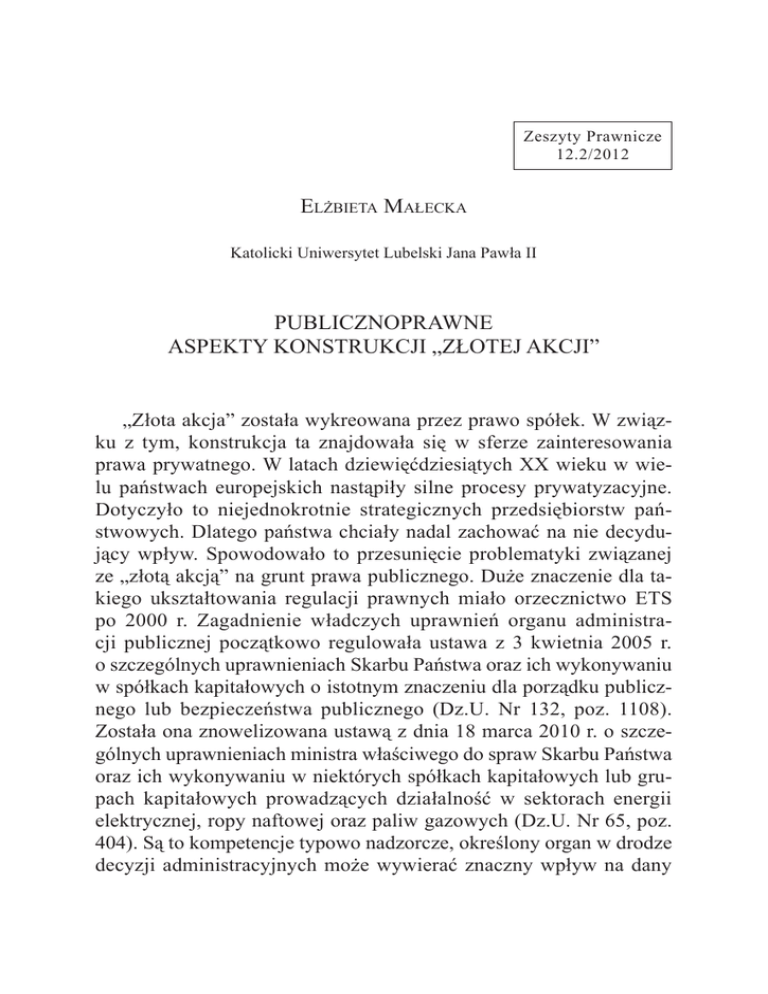 Zeszyty Prawnicze 12.2/2012 Elżbieta Małecka Katolicki Uniwersytet Lubelski Jana Pawła II PUBLICZNOPRAWNE ASPEKTY KONSTRUKCJI „ZŁOTEJ AKCJI” „Złota akcja” została wykreowana przez prawo spółek. W związku z tym, konstrukcja ta znajdowała się w sferze zainteresowania prawa prywatnego. W latach dziewięćdziesiątych XX wieku w wielu państwach europejskich nastąpiły silne procesy prywatyzacyjne. Dotyczyło to niejednokrotnie strategicznych przedsiębiorstw państwowych. Dlatego państwa chciały nadal zachować na nie decydujący wpływ. Spowodowało to przesunięcie problematyki związanej ze „złotą akcją” na grunt prawa publicznego. Duże znaczenie dla takiego ukształtowania regulacji prawnych miało orzecznictwo ETS po 2000 r. Zagadnienie władczych uprawnień organu administracji publicznej początkowo regulowała ustawa z 3 kwietnia 2005 r. o szczególnych uprawnieniach Skarbu Państwa oraz ich wykonywaniu w spółkach kapitałowych o istotnym znaczeniu dla porządku publicznego lub bezpieczeństwa publicznego (Dz.U. Nr 132, poz. 1108). Została ona znowelizowana ustawą z dnia 18 marca 2010 r. o szczególnych uprawnieniach ministra właściwego do spraw Skarbu Państwa oraz ich wykonywaniu w niektórych spółkach kapitałowych lub grupach kapitałowych prowadzących działalność w sektorach energii elektrycznej, ropy naftowej oraz paliw gazowych (Dz.U. Nr 65, poz. 404). Są to kompetencje typowo nadzorcze, określony organ w drodze decyzji administracyjnych może wywierać znaczny wpływ na dany 30 Elżbieta Małecka [2] podmiot. Decyduje to o publicznoprawnym charakterze tej konstrukcji prawnej. 1. Istota „złotej akcji” 1.1.Pojęcie „złotej akcji” Pojęcie tzw. złotej akcji nie jest pojęciem normatywnym ani (pierwotnie) doktrynalnym. Kategoria ta została ukształtowana przez praktykę obrotu1. Najczęściej w występuje w dwóch znaczeniach: • Jako akcja z prawem „weta”. Bez zgody jej posiadacza walne zgromadzenie nie może podjąć pewnych uchwał, dotyczących niektórych spraw określonych w statucie. • Jako akcja „niema”, gwarantująca akcjonariuszowi określony udział w zysku, niezależnie od wypracowanego zysku spółki w danym roku obrotowym. Nie zapewnia jednakże prawa głosu akcjonariuszowi2. Pierwsze znaczenie odgrywa szczególną rolę w procesach prywatyzacyjnych jednoosobowych spółek akcyjnych Skarbu Państwa o strategicznym znaczeniu dla polskiej gospodarki oraz w tzw. przyjaznych przejęciach spółek akcyjnych. Najczęściej jest to związane z podwyższeniem kapitału akcyjnego spółki przez emisję nowych akcji i objęciem takiej spółki przez danego inwestora strategicznego. W prywatyzowanym podmiocie „złota” akcja stanowi swoiste zabezpieczenie interesów państwa. Taki podmiot podlega stopniowej komercjalizacji i prawom wolnego rynku. Ponadto należy podkreślić, że inwestorami strategicznymi bardzo często są podmioty zagraniczne. Dlatego tak ważne jest, aby Skarb Państwa, będący wspólnikiem mniejszościowym, miał możliwość ingerencji w sprawy danej spółki. Państwo nie może być bezsilne w przypadku zagrożenia bezpieczeństwa i porządku publicznego, dostaw podstawowych surowców (gazu, energii elektrycznej) oraz usług publicznych świadczonych przez pod A. Szumański, „Złota” akcja w prawie polskim, «PPH» 12/1998, s. 1. 1 Ł. Gasiński, Dopuszczalność wprowadzenia „złotej akcji” do konstrukcji spółki, «PPH» 3/1999, s. 27. 2 [3] Publicznoprawne aspekty konstrukcji „złotej akcji” 31 mioty prywatne. Dzięki „złotej akcji” ma ono wpływ na podejmowanie strategicznych decyzji. Z tego powodu w praktyce wielu krajów ta konstrukcja jest łączona ze szczególnymi uprawnieniami jedynie takich wspólników, jak Skarb Państwa czy samorządowe osoby prawne. Podmioty te wykonują funkcje prywatnoprawne, reprezentują jednakże interes publiczny3. Marek Szydło zaznacza, że: „przez pojęcie «złote akcje» należałoby rozumieć wszelkie rodzaje przysługujących państwu specjalnych praw (przywilejów), umożliwiających mu wpływ na działalność i funkcjonowanie prywatnoprawnych podmiotów”4. Jak zauważa Łukasz Gasiński, zakres pojęcia „złotej akcji” obejmuje konkretną akcję reprezentującą określone uprzywilejowanie oraz uprawnienia wynikające z postanowień statutu czy umowy5. W ramy pojęciowe tej koncepcji wpisują się też uprawnienia Skarbu Państwa przewidziane ustawą z 2010 r. Granice przywilejów związanych ze „złotą akcją” wyznaczają: • przepisy kodeksu handlowego oraz innych ustaw, • sama natura spółki akcyjnej (wykluczone są postanowienia statutu, które powodują, że dana spółka będzie akcyjną jedynie z nazwy, a faktycznie stanie się innym typem spółki)6, • ustawa z 2010 r. Takie ukształtowanie uczestnictwa państwa w interesach gospodarczych eliminuje potrzebę jego ukrytej ingerencji w sprawy danej spółki, stanowiącą rzeczywiste zagrożenie dla funkcjonowania, ciągłości działania oraz integralności infrastruktury krytycznej. Tego typu podmioty nie mogą podlegać jedynie grze rynkowej. „Złota akcja” pozwala zachować państwu niezbędne uprawnienia kontrolne. Decyduje to o przesunięciu tego szczególnego przywileju właścicielskiego w stronę W. Katner, Pozakodeksowe uprzywilejowanie akcji – konstrukcja „złotej akcji” Skarbu Państwa według ustawy z 2005 r., «PPH» 12/2005, s. 43. 3 M. Szydło, Złote akcje posiadane przez państwo w prywatyzowanych przed siębiorstwach a swoboda przepływu kapitału w Unii Europejskiej, «Prawo Spółek» 3/2006, s. 18. 4 Ł. Gasiński, op. cit., s.28. 5 A. Szumański, op. cit., s. 5. 6 32 Elżbieta Małecka [4] uprawnień Skarbu Państwa o charakterze publicznoprawnym. Źródłem tych uprawnień jest samo państwo, a jedynie formalnie – tytuł własności akcji. 1.2. „Złota akcja” w prawie UE Skomplikowana problematyka „zło