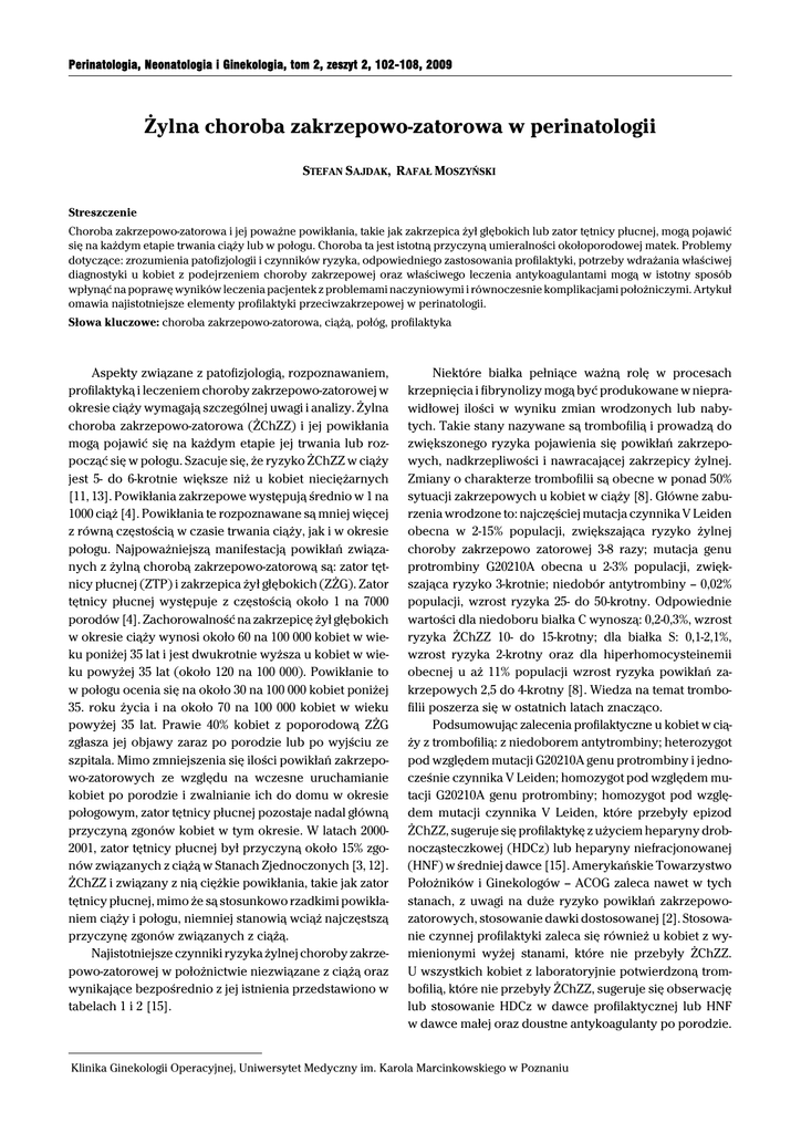 Perinatologia, Neonatologia i Ginekologia, tom 2, zeszyt 2, 102-108, 2009 Żylna choroba zakrzepowo-zatorowa w perinatologii STEFAN SAJDAK, RAFAŁ MOSZYŃSKI Streszczenie Choroba zakrzepowo-zatorowa i jej poważne powikłania, takie jak zakrzepica żył głębokich lub zator tętnicy płucnej, mogą pojawić się na każdym etapie trwania ciąży lub w połogu. Choroba ta jest istotną przyczyną umieralności okołoporodowej matek. Problemy dotyczące: zrozumienia patofizjologii i czynników ryzyka, odpowiedniego zastosowania profilaktyki, potrzeby wdrażania właściwej diagnostyki u kobiet z podejrzeniem choroby zakrzepowej oraz właściwego leczenia antykoagulantami mogą w istotny sposób wpłynąć na poprawę wyników leczenia pacjentek z problemami naczyniowymi i równoczesnie komplikacjami położniczymi. Artykuł omawia najistotniejsze elementy profilaktyki przeciwzakrzepowej w perinatologii. Słowa kluczowe: choroba zakrzepowo-zatorowa, ciążą, połóg, profilaktyka Aspekty związane z patofizjologią, rozpoznawaniem, profilaktyką i leczeniem choroby zakrzepowo-zatorowej w okresie ciąży wymagają szczególnej uwagi i analizy. Żylna choroba zakrzepowo-zatorowa (ŻChZZ) i jej powikłania mogą pojawić się na każdym etapie jej trwania lub rozpocząć się w połogu. Szacuje się, że ryzyko ŻChZZ w ciąży jest 5- do 6-krotnie większe niż u kobiet nieciężarnych [11, 13]. Powikłania zakrzepowe występują średnio w 1 na 1000 ciąż [4]. Powikłania te rozpoznawane są mniej więcej z równą częstością w czasie trwania ciąży, jak i w okresie połogu. Najpoważniejszą manifestacją powikłań związanych z żylną chorobą zakrzepowo-zatorową są: zator tętnicy płucnej (ZTP) i zakrzepica żył głębokich (ZŻG). Zator tętnicy płucnej występuje z częstością około 1 na 7000 porodów [4]. Zachorowalność na zakrzepicę żył głębokich w okresie ciąży wynosi około 60 na 100 000 kobiet w wieku poniżej 35 lat i jest dwukrotnie wyższa u kobiet w wieku powyżej 35 lat (około 120 na 100 000). Powikłanie to w połogu ocenia się na około 30 na 100 000 kobiet poniżej 35. roku życia i na około 70 na 100 000 kobiet w wieku powyżej 35 lat. Prawie 40% kobiet z poporodową ZŻG zgłasza jej objawy zaraz po porodzie lub po wyjściu ze szpitala. Mimo zmniejszenia się ilości powikłań zakrzepowo-zatorowych ze względu na wczesne uruchamianie kobiet po porodzie i zwalnianie ich do domu w okresie połogowym, zator tętnicy płucnej pozostaje nadal główną przyczyną zgonów kobiet w tym okresie. W latach 20002001, zator tętnicy płucnej był przyczyną około 15% zgonów związanych z ciążą w Stanach Zjednoczonych [3, 12]. ŻChZZ i związany z nią ciężkie powikłania, takie jak zator tętnicy płucnej, mimo że są stosunkowo rzadkimi powikłaniem ciąży i połogu, niemniej stanowią wciąż najczęstszą przyczynę zgonów związanych z ciążą. Najistotniejsze czynniki ryzyka żylnej choroby zakrzepowo-zatorowej w położnictwie niezwiązane z ciążą oraz wynikające bezpośrednio z jej istnienia przedstawiono w tabelach 1 i 2 [15]. Niektóre białka pełniące ważną rolę w procesach krzepnięcia i fibrynolizy mogą być produkowane w nieprawidłowej ilości w wyniku zmian wrodzonych lub nabytych. Takie stany nazywane są trombofilią i prowadzą do zwiększonego ryzyka pojawienia się powikłań zakrzepowych, nadkrzepliwości i nawracającej zakrzepicy żylnej. Zmiany o charakterze trombofilii są obecne w ponad 50% sytuacji zakrzepowych u kobiet w ciąży [8]. Główne zaburzenia wrodzone to: najczęściej mutacja czynnika V Leiden obecna w 2-15% populacji, zwiększająca ryzyko żylnej choroby zakrzepowo zatorowej 3-8 razy; mutacja genu protrombiny G20210A obecna u 2-3% populacji, zwiększająca ryzyko 3-krotnie; niedobór antytrombiny – 0,02% populacji, wzrost ryzyka 25- do 50-krotny. Odpowiednie wartości dla niedoboru białka C wynoszą: 0,2-0,3%, wzrost ryzyka ŻChZZ 10- do 15-krotny; dla białka S: 0,1-2,1%, wzrost ryzyka 2-krotny oraz dla hiperhomocysteinemii obecnej u aż 11% populacji wzrost ryzyka powikłań zakrzepowych 2,5 do 4-krotny [8]. Wiedza na temat trombofilii poszerza się w ostatnich latach znacząco. Podsumowując zalecenia profilaktyczne u kobiet w ciąży z trombofilią: z niedoborem antytrombiny; heterozygot pod względem mutacji G20210A genu protrombiny i jednocześnie czynnika V Leiden; homozygot pod względem mutacji G20210A genu protrombiny; homozygot pod względem mutacji czynnika V Leiden, które przebyły epizod ŻChZZ, sugeruje się profilaktykę z użyciem heparyny drobnocząsteczkowej (HDCz) lub heparyny niefracjonowanej (HNF) w średniej dawce [15]. Amerykańskie Towarzystwo Położników i Ginekologów – ACOG zaleca nawet w tych stanach, z uwagi na duże ryzyko powikłań zakrzepowozatorowych, stosowanie dawki dostosowanej [2]. Stosowanie czynnej profilaktyki zaleca się również u kobiet z wymienionymi wyżej stanami, które nie przebyły ŻChZZ. U wszystkich kobiet z laboratoryjnie potwierdzoną trombofilią, które nie przebyły ŻChZZ, sugeruje się obserwację lub stosowanie HDCz w dawce profilaktycznej lub HNF w dawce małej oraz doustne antykoagulanty po porodzie. Klinika Ginekologii Operacyjnej, Uniwersytet Medyczny im. Karola Marcinkowskiego w Poznaniu Żylna choroba zakrzepowo-zatorowa w perinatologii U kobiet z wrodzoną trombofilią i nawracającymi poronieniami, powtarzającymi się incydentami ciężkich stanów przedrzucawkowych, oddzielenia łożyska lub niewyjaśnionych wewnątrzmacicznych obumarć płodu wskazane jest stosowanie małych dawek kwasu acetylosalicylowego (ASA) (75-162 mg/24 h) i HDCz w dawce profilaktycznej. Wskazane jest również kontynuowanie leczenia przeciwkrzepliwego w połogu. Tabela 1. Czynniki ryzyka ŻChZZ niezwiązane z ciążą Wiek > 35 lat Długotrwałe unieruchomienie w okresie bezpośrednio poprzedzającym zajście w ciążę Porażenie lub nie