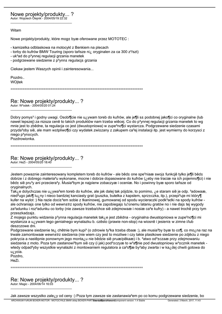Nowe projekty/produkty... ? Autor: Wojciech Olejnik - 2004/05/19 22:32 _____________________________________ Witam Nowe projekty/produkty, które mog± byæ oferowane przez MOTOTEC : - kamizelka odblaskowa na motocykl z Benkiem na plecach - torby do kufrów BMW Touring (sporo tañsze ni¿ oryginalen za ca 300 z³/szt) - uk³ad do p³ynnej regulacji grzania manetek - podgrzewane siedzenie z p³ynn± regulacj± grzania Ciekaw jestem Waszych opinii i zainteresowania... Pozdro.. WOjtek ============================================================================ Re: Nowe projekty/produkty... ? Autor: W³odek - 2004/05/20 01:24 _____________________________________ Dobry pomys³ i godny uwagi. Osobi¶cie nie u¿ywam toreb do kufrów, ale je¶li s± podobnej jako¶ci co oryginalne (lub nawet lepszej) za nizsza cenê to takich produktów nam trzeba wiêcej. Co do p³ynnej regulacji grzania manetek to wg mnie jest to zbêdne, ta regulacja co jest (dwustopniowa) w zupe³no¶ci wystarcza. Podgrzewane siedzenie czasami przyda³oby siê, ale mam w±tpliwo¶ci czy wydatek zwi±zany z zakupem ca³ej instalacji itp. jest wymierny do korzysci z niego p³yn±cych. Pozdrowionka. ============================================================================ Re: Nowe projekty/produkty... ? Autor: HeZi - 2004/05/20 18:40 _____________________________________ Jestem powaznie zainteresowany kompletem toreb do kufrów - ale bêd± one spe³niaæ swoj± funkcjê tylko je¶li bêd± dobrze i z dobrego materia³u wykonane, mocne i dobrze dopasowane do kufrów (¿eby nie traciæ na ich pojemno¶ci) i nie bêd± siê pru³y ani przeciera³y. Musia³bym je najpierw zobaczyæ i oceniæ. No i powinny byæ sporo tañsze od oryginalnych. Tak¿e dotychczas nie u¿ywa³em toreb do kufrów, ale jak dalej tak pójdzie, to pomimo, ¿e staram siê je odp. ³adowaæ, nied³ugo jaki¶ lu¿ny i nieco bardziej kanciasty grat (puszka, butelka z kapslem, sprz±czka, itp.), przepi³uje mi który¶ kufer na wylot :) Na razie doci±³em sobie z tkaninowej, gumowanej od spodu wycieraczki podk³adki na spody kufrów ale ochraniaj± one tylko od wewn±trz spody kufrów, nie zapobiegaj± lu¼nemu lataniu gratów no i nie daj± tej wygody za³adunku i roz³adunku co torby (nie zawsze trzeba/chce siê zdejmowaæ i nosiæ ca³e kufry) - a nawet trochê przy tym przeszkadzaj±. Z mojego punktu widzenia p³ynna regulacja manetek tak¿e jest zbêdna - oryginalna dwustopniowa w zupe³no¶ci mi wystarcza a u¿ywam tego genialnego wynalazku b. czêsto (prawie non-stop) na wiosnê i jesieni± w zimne i/lub deszczowe dni. Podgrzewane siedzenie te¿ chêtnie bym kupi³ (o zdrowie ty³ka trzeba dbaæ :), ale musia³by byæ to co¶, co mo¿na raz na trwale zamontowaæ wewn±trz siedzenia (nie wiem czy jest to mozliwe i czy takie plasikowe siedzenie po zdjêciu z niego pokrycia a nastêpnie ponownym jego monta¿u nie bêdzie siê pruæ/pêkaæ) i b. ³atwo od³±czaæ przy zdejmowaniu siedzenia z moto. Poza tym zastanowi³bym siê czy (i jak) pod³±czyæ to w³a¶nie pod dwustopniowy w³±cznik manetek wtedy odpad³yby wszystkie wynalazki z montowaniem regulatora a ca³o¶æ by³aby zwarta i w ka¿dej chwili gotowa do u¿ycia. Pozdro, HeZi. ============================================================================ Re: Nowe projekty/produkty... ? Autor: Magic - 2004/06/14 16:03 _____________________________________ Jak zawsze wszystko zale¿y od ceny :) Poza tym zawsze sie zastanawia³em po co komu podgrzewane siedzenie, bo ARCHIWUM FoRUM BOXER-MOTOR - MOTOCYKLE BMW sklep BOXER-PARTS.eu MamboBoard czê¶ci i akcesoria Forum Component version: 1.4 Stable Generated: 3 March, 2017, 11:43 ty³ek to jedyna czê¶æ cia³a która mi nigdy nie zmarz³a :) a je¿d¿ê równie¿ przy lekkim mrozku :) Torby jak najbardziej, sam chêtnie kupiê. P³ynna regulacja manetek - ewentualnie tak. Podgrzewane siedzenie - chyba nie bêdzie zapotrzebowania ;) Kamizelka odblaskowa - nie wszyscy lubi± takie wdzianka, ale z w³asnego do¶wiadczenia polecam jak najbardziej. ============================================================================ Re: Nowe projekty/produkty... ? Autor: Wojciech Olejnik - 2004/07/05 09:52 _____________________________________ Wojciech Olejnik napisa³(a): > - torby do kufrów BMW Touring (sporo tañsze ni¿ oryginalen za > ca 300 z³/szt) Pierwsza partia toreb TOURING do K100/1100 do nabycia w sklepie BOXER-MOTOR. Mo¿liwe jest uszycie toreb do kufrów touring R1100 - w zale¿no¶ci od Waszego zainteresowania. Pozdo.. WOjtek ============================================================================ ARCHIWUM FoRUM BOXER-MOTOR - MOTOCYKLE BMW sklep BOXER-PARTS.eu MamboBoard czê¶ci i akcesoria Forum Component version: 1.4 Stable Generated: 3 March, 2017, 11:43