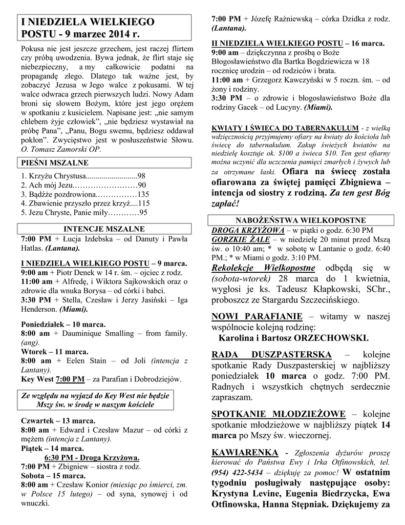 I NIEDZIELA WIELKIEGO POSTU - 9 marzec 2014 r. Pokusa nie jest jeszcze grzechem, jest raczej flirtem czy próbą uwodzenia. Bywa jednak, że flirt staje się niebezpieczny, a my całkowicie podatni na propagandę złego. Dlatego tak ważne jest, by zobaczyć Jezusa w Jego walce z pokusami. W tej walce odwraca grzech pierwszych ludzi. Nowy Adam broni się słowem Bożym, które jest jego orężem w spotkaniu z kusicielem. Napisane jest: „nie samym chlebem żyje człowiek”, „nie będziesz wystawiał na próbę Pana”, „Panu, Bogu swemu, będziesz oddawał pokłon”. Zwycięstwo jest w posłuszeństwie Słowu. O. Tomasz Zamorski OP. PIEŚNI MSZALNE 1. Krzyżu Chrystusa..........................98 2. Ach mój Jezu.……………………90 3. Bądźże pozdrowiona.……………135 4. Zbawienie przyszło przez krzyż....115 5. Jezu Chryste, Panie miły…………95 INTENCJE MSZALNE 7:00 PM + Łucja Izdebska – od Danuty i Pawła Hatlas. (Lantana). I NIEDZIELA WIELKIEGO POSTU – 9 marca. 9:00 am + Piotr Denek w 14 r. śm. – ojciec z rodz. 11:00 am + Alfredę, i Wiktora Sajkowskich oraz o zdrowie dla wnuka Borysa – od córki i babci. 3:30 PM + Stella, Czesław i Jerzy Jasiński – Iga Henderson. (Miami). Poniedziałek – 10 marca. 8:00 am + Dauminique Smalling – from family. (ang). Wtorek – 11 marca. 8:00 am + Eelen Stain – od Joli (intencja z Lantany). Key West 7:00 PM – za Parafian i Dobrodziejów. Ze względu na wyjazd do Key West nie będzie Mszy św. w środę w naszym kościele Czwartek – 13 marca. 8:00 am + Edward i Czesław Mazur – od córki z mężem (intencja z Lantany). Piątek – 14 marca. 6:30 PM - Droga Krzyżowa. 7:00 PM + Zbigniew – siostra z rodz. Sobota – 15 marca. 8:00 am + Czesław Konior (miesiąc po śmierci, zm. w Polsce 15 lutego) – od syna, synowej i od wnuczki. 7:00 PM + Józefę Raźniewską – córka Dzidka z rodz. (Lantana). II NIEDZIELA WIELKIEGO POSTU – 16 marca. 9:00 am – dziękczynna z prośbą o Boże Błogosławieństwo dla Bartka Bogdziewicza w 18 rocznicę urodzin – od rodziców i brata. 11:00 am + Grzegorz Kawczyński w 5 roczn. śm. – od żony i rodziny. 3:30 PM – o zdrowie i błogosławieństwo Boże dla rodziny Gacek – od Lucyny. (Miami). KWIATY I ŚWIECA DO TABERNAKULUM - z wielką wdzięcznością przyjmujemy ofiary na kwiaty do kościoła lub świecę do tabernakulum. Zakup świeżych kwiatów na niedzielę kosztuje ok. $100 a świeca $10. Ten gest ofiarny można uczynić dla uczczenia pamięci zmarłych i żywych lub za otrzymane łaski. Ofiara na świecę została ofiarowana za świętej pamięci Zbigniewa – intencja od siostry z rodziną. Za ten gest Bóg zapłać! NABOŻEŃSTWA WIELKOPOSTNE DROGA KRZYŻOWA – w piątki o godz. 6:30 PM GORZKIE ŻALE – w niedzielę 20 minut przed Mszą św. o 10:40 am; * w sobotę w Lantanie o godz. 6:40 PM.; * w Miami o godz. 3:10 PM. Rekolekcje Wielkopostne odbędą się w (sobota-wtorek) 28 marca do 1 kwietnia, wygłosi je ks. Tadeusz Kłapkowski, SChr., proboszcz ze Stargardu Szczecińskiego. NOWI PARAFIANIE – witamy w naszej wspólnocie kolejną rodzinę: Karolina i Bartosz ORZECHOWSKI. RADA DUSZPASTERSKA – kolejne spotkanie Rady Duszpasterskiej w najbliższy poniedziałek 10 marca o godz. 7:00 PM. Radnych i wszystkich chętnych serdecznie zapraszam. SPOTKANIE MŁODZIEŻOWE – kolejne spotkanie młodzieżowe w najbliższy piątek 14 marca po Mszy św. wieczornej. KAWIARENKA - Zgłoszenia dyżurów proszę kierować do Państwa Ewy i Irka Otfinowskich, tel. (954) 422-5434 – dziękuję za pomoc! W ostatnim tygodniu posługiwały następujące osoby: Krystyna Levine, Eugenia Biedrzycka, Ewa Otfinowska, Hanna Stępniak. Dziękujemy za donację „beef strogonof” Janinie Grabskiej. Dochód wyniósł $470. Bóg zapłać i Szczęść Boże! KONCERT Chóru "Lutnia" z Malborka, w dniu 27 kwietnia 2014r. w Polskiej Misji Katolickiej w Pompano Beach, obecni będą na Mszy św. o godz. 11:00, z okazji kanonizacji Bł. Jana Pawła II. Chór ma w swoim repertuarze opracowany śpiew liturgiczny oraz utwory sakralne jak również pieśni patriotyczne i ludowe. Po Mszy św. chór da koncert pieśni. Our new auxiliary, Bishop-elect Peter Baldacchino, will be ordained on Wednesday, March 19 at 2pm in the Cathedral of St Mary. He comes with a missionary heart and zeal for the Gospel with the ability to work in many different languages and cultures. Our presbyterate is happy to welcome Bishopelect Peter Baldacchino with a burse fund to be presented following Vespers on Sunday, March 16. OGŁOSZENIA POLONIJNE Oferta: wynajmę (sprzedam) townhouse 2-2,5, garaż, nowe AC i kuchnia, bardzo dobry stan domu – Crestol Lake Village (pomiędzy Sample Rd i Green Rd) blisko polskiego kościoła. Tel: (954) 941-8747 lub (954) 821-4621 Mirek (2x) Oferta: potrzebna osoba do recepcji w hotelu z j. ang. I znajomością komputera. Tel: (954) 565-9224 Maria i Krzysztof (2x) Oferta: wynajmę 1 pokojowe mieszkanie lub opcja roommate w Boca Raton. Tel: (561) 633-7212 Marek (3x) Oferta: do wynajęcia pokój z łazienką, dla osoby pracującej z AC i osobnym wejściem w domku jednorodzinnym w Hollywood, blisko Federal Hwy, $500 miesięcznie z Internetem. Tel: (954) 674-8882 lub (954) 226-1094 (1x) Oferta: do wynajęcia pokój z łazienką, dla osoby pracującej w domu 1 rodzinnym, osobne wejście w Dania Beach, blisko Sheridian / E. Federal Hwy, cena do uzgodnienia. Tel: (954) 624-6565 lub (954) 298-1505 (1x) Oferta: poszukuje pracy live-in, jako opiekunka dla starszych osób, opieka nad dziećmi, lub housekeeping. Tel: (201) 355-7809 (4x) Oferta: Polka podejmie pracę: opieka nad starszą osobą, sprzątanie, opieka nad dzieckiem. Tel: (561) 201-0229 Anna (1x) Oferta: potrzebna osoba do sprzątania domu, Fort Lauderdale. Tel: (954) 565-3452 (1x) Oferta: sprzedam lub zamienię mieszkanie własnościowe-condominium 2/2, balkon, umeblowane komplet, na parterze, osiedle strzeżone w Fort 