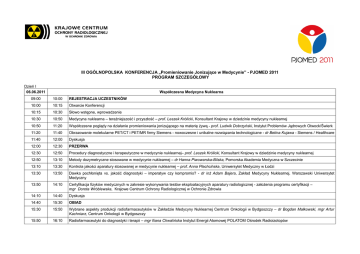 III OGÓLNOPOLSKA KONFERENCJA „Promieniowanie Jonizujące w Medycynie” - PJOMED 2011 PROGRAM SZCZEGÓŁOWY Dzień I 06.06.2011 Współczesna Medycyna Nuklearna 09:00 10:00 REJESTRACJA UCZESTNIKÓW 10:00 10:15 Otwarcie Konferencji 10:15 10:30 Słowo wstępne, wprowadzenie 10:30 10:50 Medycyna nuklearna – teraźniejszość i przyszłość – prof. Leszek Królicki, Konsultant Krajowy w dziedzinie medycyny nuklearnej 10:50 11:20 Współczesne poglądy na działanie promieniowania jonizującego na materię żywą - prof. Ludwik Dobrzyński, Instytut Problemów Jądrowych Otwock/Świerk 11:20 11:40 Obrazowanie molekularne PET/CT i PET/MR firmy Siemens - nowoczesne i unikalne rozwiązania technologiczne - dr Betina Kujawa - Siemens / Healthcare 11:40 12:00 Dyskusja 12:00 12:30 PRZERWA 12:30 12:50 Procedury diagnostyczne i terapeutyczne w medycynie nuklearnej– prof. Leszek Królicki, Konsultant Krajowy w dziedzinie medycyny nuklearnej 12:50 13:10 Metody dozymetryczne stosowane w medycynie nuklearnej – dr Hanna Piwowarska-Bilska, Pomorska Akademia Medyczna w Szczecinie 13:10 13:30 Kontrola jakości aparatury stosowanej w medycynie nuklearnej – prof. Anna Płachcińska, Uniwersytet Medyczny w Łodzi 13:30 13:50 Dawka pochłonięta vs. jakość diagnostyki – imperatyw czy kompromis? - dr inż Adam Bajera, Zakład Medycyny Nuklearnej, Warszawski Uniwersytet Medyczny 13:50 14:10 Certyfikacja fizyków medycznych w zakresie wykonywania testów eksploatacyjnych aparatury radiologicznej - założenia programu certyfikacji – mgr Dorota Wróblewska, Krajowe Centrum Ochrony Radiologicznej w Ochronie Zdrowia 14:10 14:40 Dyskusja 14:40 15:30 OBIAD 15:30 15:50 Wybrane aspekty produkcji radiofarmaceutyków w Zakładzie Medycyny Nuklearnej Centrum Onkologii w Bydgoszczy – dr Bogdan Małkowski, mgr Artur Kachniarz, Centrum Onkologii w Bydgoszczy 15:50 16:10 Radiofarmaceutyki do diagnostyki i terapii – mgr Iliana Chwalińska Instytut Energii Atomowej POLATOM Ośrodek Radioizotopów 16:10 16:30 Ocena dawki na soczewki oczu u pracowników zatrudnionych w Zakładach Medycyny Nuklearnej - dr Jerzy Olszewski, Instytut Medycyny Pracy w Łodzi 16:30 16:50 Dawki dla personelu medycznego w wybranych pracowniach medycyny nuklearnej (scyntygrafia i PET) w Polsce – dr inż. Renata Kopeć, Instytut Fizyki Jądrowej PAN w Krakowie 16:50 17:10 Ocena narażenia personelu w Mazowieckim Centrum PET-CT – mgr Anna Budzyńska, Wojskowy Instytut Medyczny w Warszawie 17:10 17:30 Dyskusja 18:30 Spotkanie uczestników PJOMED 2011 - Kolacja Dzień II 07.06.2011 e-DZIEŃ 09:30 10:00 Radiologia i Teleradiologia w Niemczech - aspekty prawne dotyczące zastosowania promieniowania jonizującego w celach medycznych w Niemczech prof. dr n. med. Norbert Hosten, Institute of Diagnostic Radiology and Neuroradiology University Medicine Greifswald (wykład w języku ang.) 10:00 10:20 Elektroniczna rejestracja danych a ocena narażenia medycznego pacjenta - dr inż. Dariusz Kluszczyński, Krajowe Centrum Ochrony Radiologicznej w Ochronie Zdrowia 10:20 10:50 Telemedycyna w kontekście europejskim - mec. Henning von Zanthier, Kancelaria Prawnicza von Zanthier&Schultz sp. k. Poznań (wykład w języku ang.) 10:50 11:20 Doświadczenia polskiej jednostki ochrony zdrowia z zakresu teleradiologii – telemedycyny 11:20 11:40 Dyskusja 11:40 12:10 PRZERWA 12:10 12:40 Komputerowe repozytorium ścieżek klinicznych w systemach e-zdrowia - dr inż. Grzegorz Bliźniuk, Centrum Systemów Informacyjnych Ochrony Zdrowia w Warszawie 12:40 13:10 Elektroniczna dokumentacja medyczna w kontekście interoperacyjności systemów informacyjnych ochrony zdrowia - dr inż. Kazimierz Frączkowski, Centrum Systemów Informacyjnych Ochrony Zdrowia w Warszawie 13:10 13:40 System informacji w ochronie zdrowia – wybrane problemy - dr inż. Kajetan Wojsyk, Centrum Systemów Informacyjnych Ochrony Zdrowia w Warszawie 13:40 14:30 OBIAD 14:30 15:40 Dyskusja. Wolne wnioski 15:40 16:00 Podsumowanie i zakończenie Konferencji