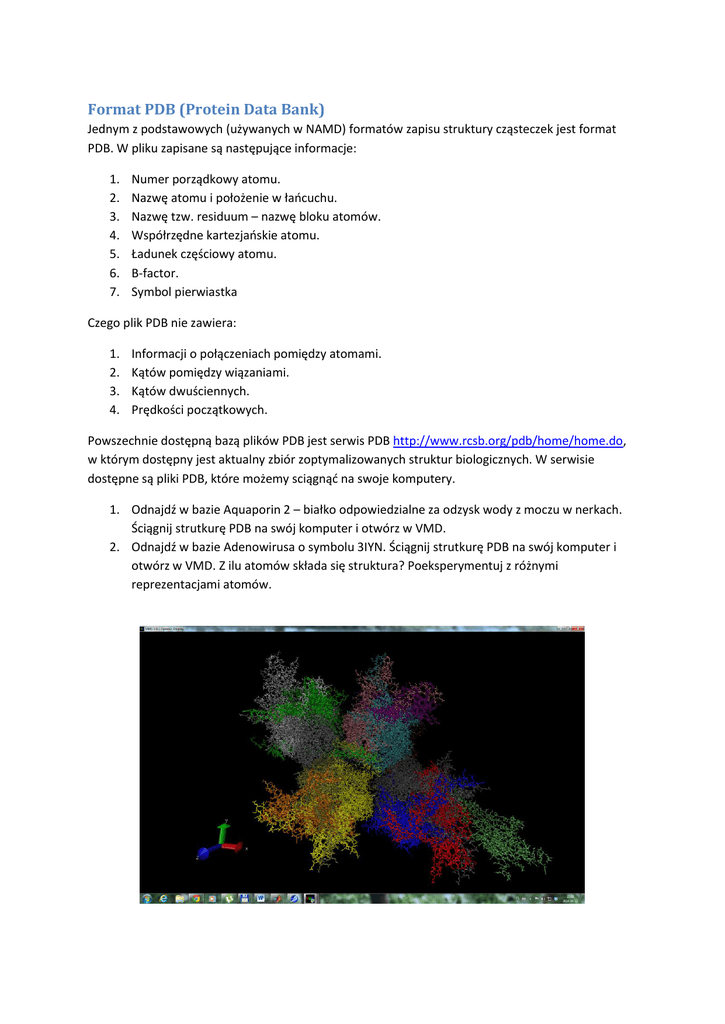 Format PDB (Protein Data Bank) Jednym z podstawowych (używanych w NAMD) formatów zapisu struktury cząsteczek jest format PDB. W pliku zapisane są następujące informacje: 1. 2. 3. 4. 5. 6. 7. Numer porządkowy atomu. Nazwę atomu i położenie w łańcuchu. Nazwę tzw. residuum – nazwę bloku atomów. Współrzędne kartezjańskie atomu. Ładunek częściowy atomu. B-factor. Symbol pierwiastka Czego plik PDB nie zawiera: 1. 2. 3. 4. Informacji o połączeniach pomiędzy atomami. Kątów pomiędzy wiązaniami. Kątów dwuściennych. Prędkości początkowych. Powszechnie dostępną bazą plików PDB jest serwis PDB http://www.rcsb.org/pdb/home/home.do, w którym dostępny jest aktualny zbiór zoptymalizowanych struktur biologicznych. W serwisie dostępne są pliki PDB, które możemy sciągnąć na swoje komputery. 1. Odnajdź w bazie Aquaporin 2 – białko odpowiedzialne za odzysk wody z moczu w nerkach. Ściągnij strutkurę PDB na swój komputer i otwórz w VMD. 2. Odnajdź w bazie Adenowirusa o symbolu 3IYN. Ściągnij strutkurę PDB na swój komputer i otwórz w VMD. Z ilu atomów składa się struktura? Poeksperymentuj z różnymi reprezentacjami atomów. Przykład pliku PDB: 1 ATOM ATOM ATOM ATOM ATOM ATOM ATOM ATOM 2 3 239 240 241 242 243 244 245 246 N CA C O CB OG1 CG2 OXT 4 5 THR THR THR THR THR THR THR THR A A A A A A A A 6 7 8 9 10 11 12 29 29 29 29 29 29 29 29 3.391 2.014 0.826 0.932 1.845 1.214 3.180 -0.317 19.940 19.761 19.943 19.600 20.667 21.893 20.968 20.109 12.762 13.283 12.332 11.133 14.505 14.153 15.185 12.824 1.00 1.00 1.00 1.00 1.00 1.00 1.00 1.00 21.00 21.00 23.00 30.00 21.00 21.00 21.00 25.00 N C C O C O C O 1. Słowo kluczowe “ATOM” 2. Numer atomu. 3. Symbol atomu i położenie w łańcuchu αA βB γG δD εE ζZ ηH 4. Nazwa bloku atomów 5. Identyfikator łańcucha. 6. Numer residuum. 7-9. Współrzędne x,y, z. 10. Zajęcie – liczba atomów w komórce elementarnej. 11. B-factor – wrażliwość na ruchy termiczne. 12. Symbol pierwiastka.