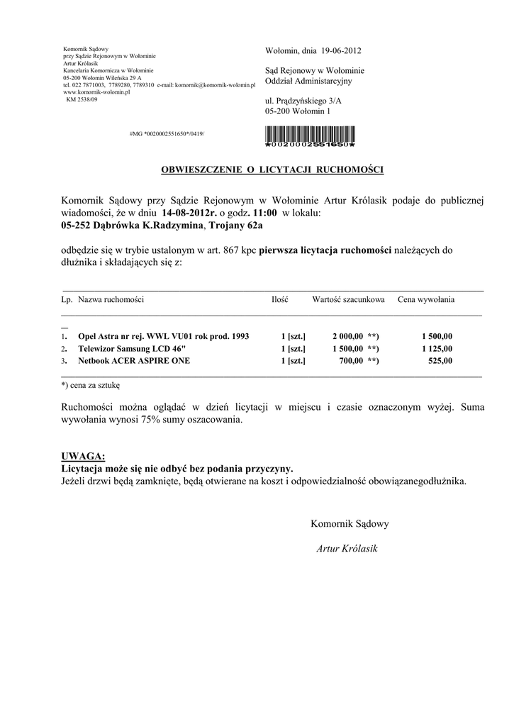 Komornik Sądowy przy Sądzie Rejonowym w Wołominie Artur Królasik Kancelaria Komornicza w Wołominie 05-200 Wołomin Wileńska 29 A tel. 022 7871003, 7789280, 7789310 e-mail: [email protected] www.komornik-wolomin.pl KM 2538/09 #MG *0020002551650*/0419/ Wołomin, dnia 19-06-2012 Sąd Rejonowy w Wołominie Oddział Administarcyjny ul. Prądzyńskiego 3/A 05-200 Wołomin 1 *0020002551650* OBWIESZCZENIE O LICYTACJI RUCHOMOŚCI Komornik Sądowy przy Sądzie Rejonowym w Wołominie Artur Królasik podaje do publicznej wiadomości, że w dniu 14-08-2012r. o godz. 11:00 w lokalu: 05-252 Dąbrówka K.Radzymina, Trojany 62a odbędzie się w trybie ustalonym w art. 867 kpc pierwsza licytacja ruchomości należących do dłużnika i składających się z: _______________________________________________________________________________________________________________________ Lp. Nazwa ruchomości Ilość Wartość szacunkowa Cena wywołania _______________________________________________________________________________________________________________________ __ 1. 2. 3. Opel Astra nr rej. WWL VU01 rok prod. 1993 Telewizor Samsung LCD 46" Netbook ACER ASPIRE ONE 1 [szt.] 1 [szt.] 1 [szt.] 2 000,00 **) 1 500,00 **) 700,00 **) 1 500,00 1 125,00 525,00 _______________________________________________________________________________________________________________________ *) cena za sztukę Ruchomości można oglądać w dzień licytacji w miejscu i czasie oznaczonym wyżej. Suma wywołania wynosi 75% sumy oszacowania. UWAGA: Licytacja może się nie odbyć bez podania przyczyny. Jeżeli drzwi będą zamknięte, będą otwierane na koszt i odpowiedzialność obowiązanegodłużnika. Komornik Sądowy Artur Królasik