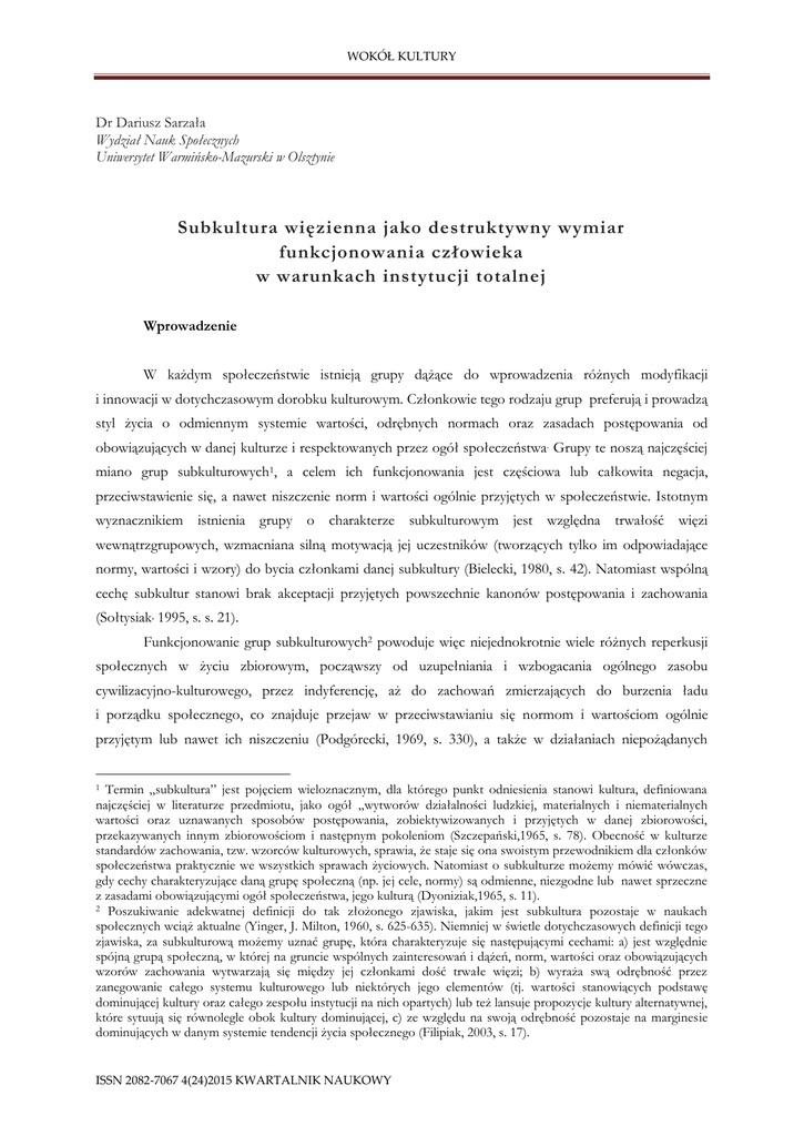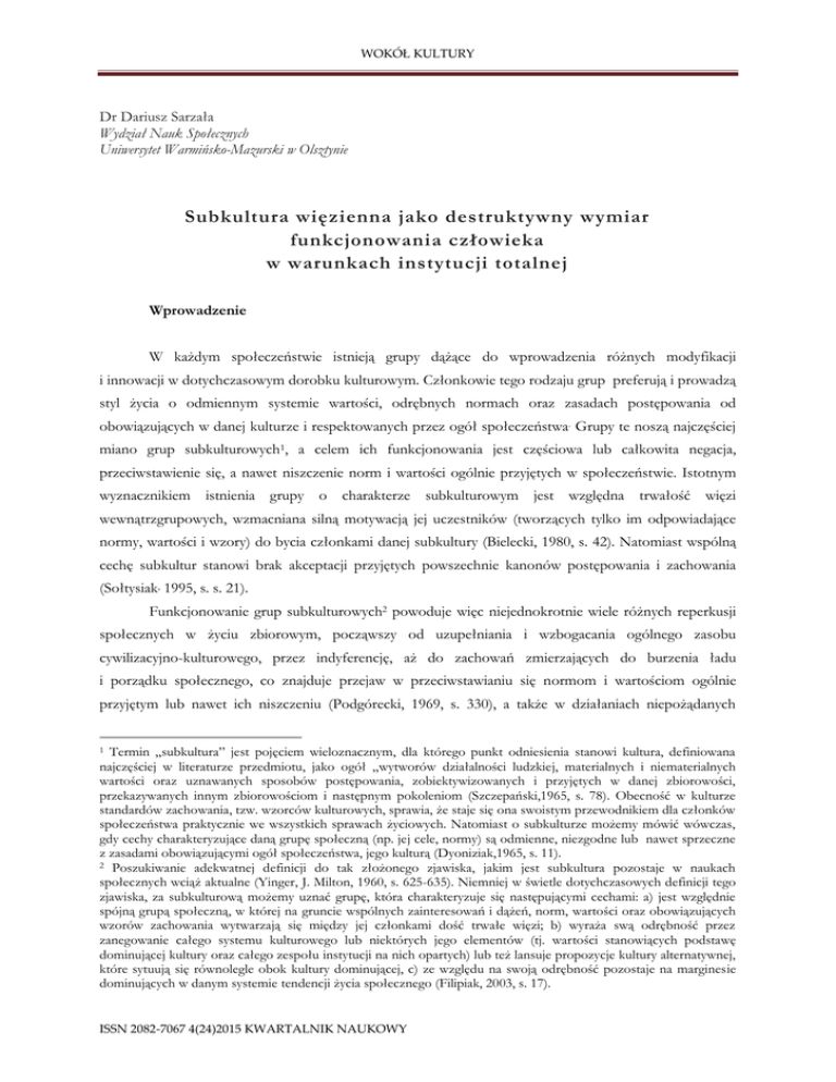 WOKÓŁ KULTURY Dr Dariusz Sarzała Wydział Nauk Społecznych Uniwersytet Warmińsko-Mazurski w Olsztynie Subkultura więzienna jako destruktywny wymiar funkcjonowania człowieka w warunkach instytucji totalnej Wprowadzenie W każdym społeczeństwie istnieją grupy dążące do wprowadzenia różnych modyfikacji i innowacji w dotychczasowym dorobku kulturowym. Członkowie tego rodzaju grup preferują i prowadzą styl życia o odmiennym systemie wartości, odrębnych normach oraz zasadach postępowania od obowiązujących w danej kulturze i respektowanych przez ogół społeczeństwa. Grupy te noszą najczęściej miano grup subkulturowych1, a celem ich funkcjonowania jest częściowa lub całkowita negacja, przeciwstawienie się, a nawet niszczenie norm i wartości ogólnie przyjętych w społeczeństwie. Istotnym wyznacznikiem istnienia grupy o charakterze subkulturowym jest względna trwałość więzi wewnątrzgrupowych, wzmacniana silną motywacją jej uczestników (tworzących tylko im odpowiadające normy, wartości i wzory) do bycia członkami danej subkultury (Bielecki, 1980, s. 42). Natomiast wspólną cechę subkultur stanowi brak akceptacji przyjętych powszechnie kanonów postępowania i zachowania (Sołtysiak, 1995, s. s. 21). Funkcjonowanie grup subkulturowych2 powoduje więc niejednokrotnie wiele różnych reperkusji społecznych w życiu zbiorowym, począwszy od uzupełniania i wzbogacania ogólnego zasobu cywilizacyjno-kulturowego, przez indyferencję, aż do zachowań zmierzających do burzenia ładu i porządku społecznego, co znajduje przejaw w przeciwstawianiu się normom i wartościom ogólnie przyjętym lub nawet ich niszczeniu (Podgórecki, 1969, s. 330), a także w działaniach niepożądanych Termin „subkultura” jest pojęciem wieloznacznym, dla którego punkt odniesienia stanowi kultura, definiowana najczęściej w literaturze przedmiotu, jako ogół „wytworów działalności ludzkiej, materialnych i niematerialnych wartości oraz uznawanych sposobów postępowania, zobiektywizowanych i przyjętych w danej zbiorowości, przekazywanych innym zbiorowościom i następnym pokoleniom (Szczepański,1965, s. 78). Obecność w kulturze standardów zachowania, tzw. wzorców kulturowych, sprawia, że staje się ona swoistym przewodnikiem dla członków społeczeństwa praktycznie we wszystkich sprawach życiowych. Natomiast o subkulturze możemy mówić wówczas, gdy cechy charakteryzujące daną grupę społeczną (np. jej cele, normy) są odmienne, niezgodne lub nawet sprzeczne z zasadami obowiązującymi ogół społeczeństwa, jego kulturą (Dyoniziak,1965, s. 11). 2 Poszukiwanie adekwatnej definicji do tak złożonego zjawiska, jakim jest subkultura pozostaje w naukach społecznych wciąż aktualne (Yinger, J. Milton, 1960, s. 625-635). Niemniej w świetle dotychczasowych definicji tego zjawiska, za subkulturową możemy uznać grupę, która charakteryzuje się następującymi cechami: a) jest względnie spójną grupą społeczną, w której na gruncie wspólnych zainteresowań i dążeń, norm, wartości oraz obowiązujących wzorów zachowania wytwarzają się między jej członkami dość trwałe więzi; b) wyraża swą odrębność przez zanegowanie całego systemu kulturowego lub niektórych jego elementów (tj. wartości stanowiących podstawę dominującej kultury oraz całego zespołu instytucji na nich opartych) lub też lansuje propozycje kultury alternatywnej, które sytuują się równolegle obok kultury dominującej, c) ze względu na swoją odrębność pozostaje na marginesie dominujących w danym systemie tendencji życia społecznego (Filipiak, 2003, s. 17). 1 ISSN 2082-7067 4(24)2015 KWARTALNIK NAUKOWY WOKÓŁ KULTURY społecznie, bulwersujących opinię publiczną, budzących niepokój, panikę i strach w środowisku społecznym. Społeczna ocena funkcjonujących w danym społeczeństwie subkultur stanowi podstawę ich podziału na dewiacyjne i niedewiacyjne (Kwaśniewski, 1976). Subkultury dewiacyjne to takie, które cechuje znaczne zmniejszenie stopnia respektu dla wartości i norm uznawanych za pożądane i obowiązujące w szerszym systemie społecznym (Ciosek, 2001, s. s. 233). Przeobrażenia ekonomiczno-społeczne i polityczne, które miały miejsce w ostatnim trzydziestoleciu, spowodowały wręcz swoistą „eksplozję”, rozrost zjawiska subkultur, zwłaszcza wśród młodego pokolenia (niemniej uczestnikami subkultur jest także część osób dorosłych). (Cekiera, 1991; 2001, s. 103–150; Sołtysiak, 1995, s. 21–23; Jędrzejewski, 1999, s. 172–222; 2001, s. 213–281; Filipiak, 2003, s. 72–89; Dudała, 2004; Piotrowski, 2003, s. 57–116). Zjawisko występowania subkultur dotyczy nie tylko środowiska otwartego, lecz obejmuje swym zasięgiem środowiska zamknięte, w tym również te, których celem działalności jest zarówno izolacja, jak i ponowna adaptacja społeczna oraz związana z nią odnowa moralna człowieka. Przykładem subkultury dewiacyjnej jest tworzona przez część społeczności osób pozbawionych wolności subkultura przestępcza nazywana również podkulturą więzienną, której powstawaniu i rozprzestrzenianiu się sprzyja specyfika, a zwłaszcza totalność i pasywność zamkniętego przestrzennie środowiska więziennego jako instytucji totalnej3. Zjawisko to „wyraźnie towarzyszy wykonywaniu kary pozbawienia wolności i tymczasowego aresztowania” (Kosewski, 1985; Machel, 1995; Szaszkiewicz, 1997; Szecówka, 1998; Moczydłowski, 1998; Ciosek 2001; Przybyliński, 2005; Kamiński, 2006; Kuć, 2009 Bałandynowicz 2012; Krause, Przybyliński, 2012; Sarzała,2009, 2013), dotyczy dużej części populacji osób przebywających w warunkach izolacji więziennej, zwłaszcza młodocianych, i występuje we wszystkich jednostkach penitencjarnych w Polsce (tj. aresztach śledczych i zakładach karnych niezależnie od ich rodzajów i typów) oraz w warunkach izolacji więziennej w innych krajach (Maghan